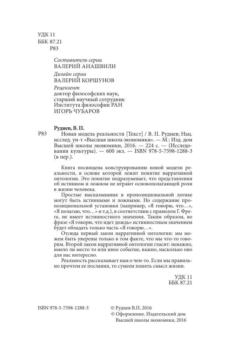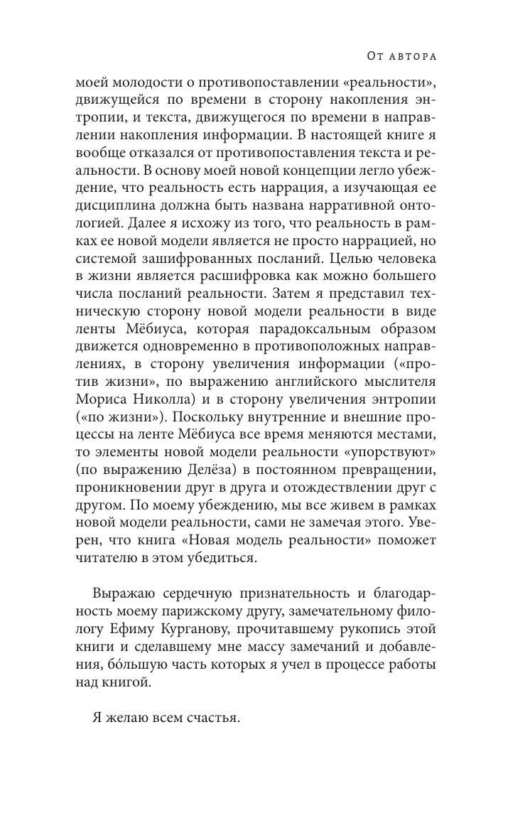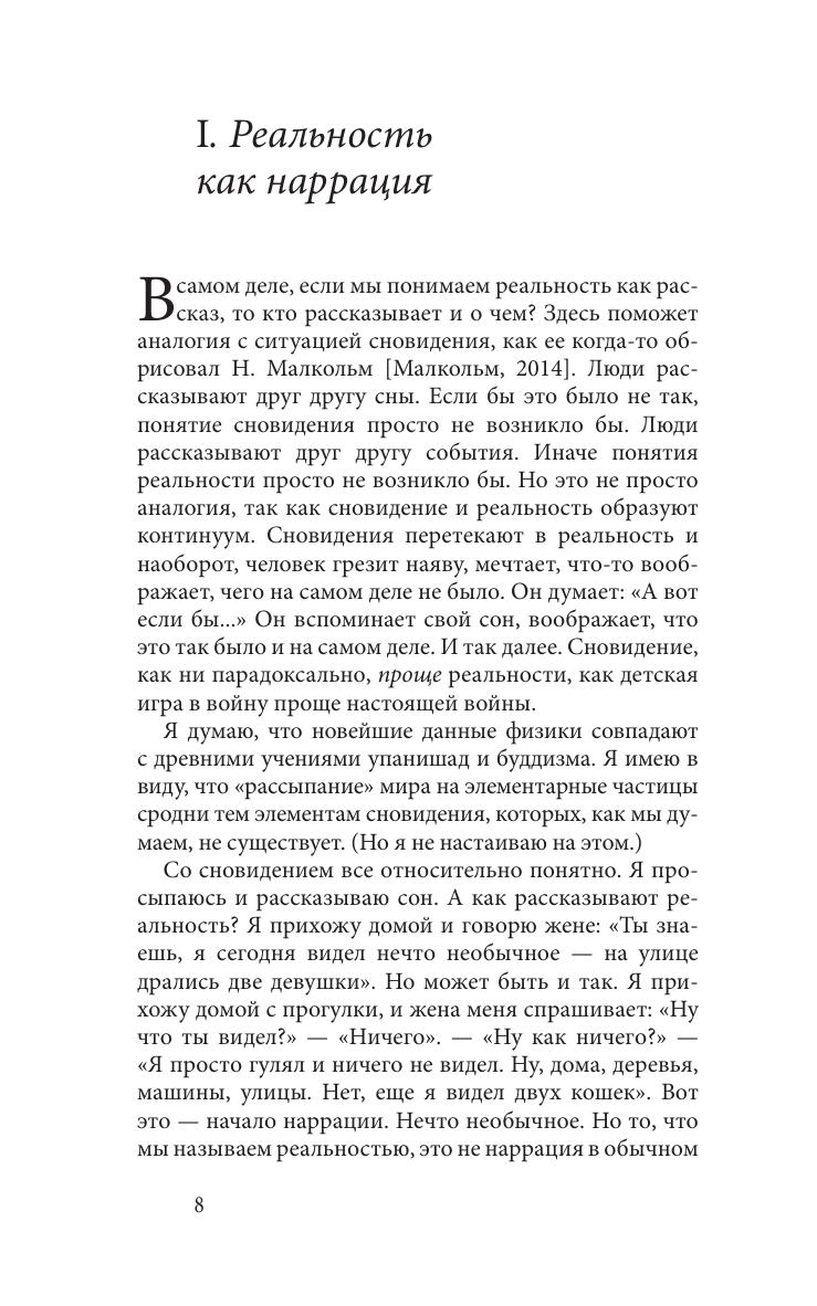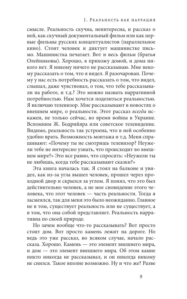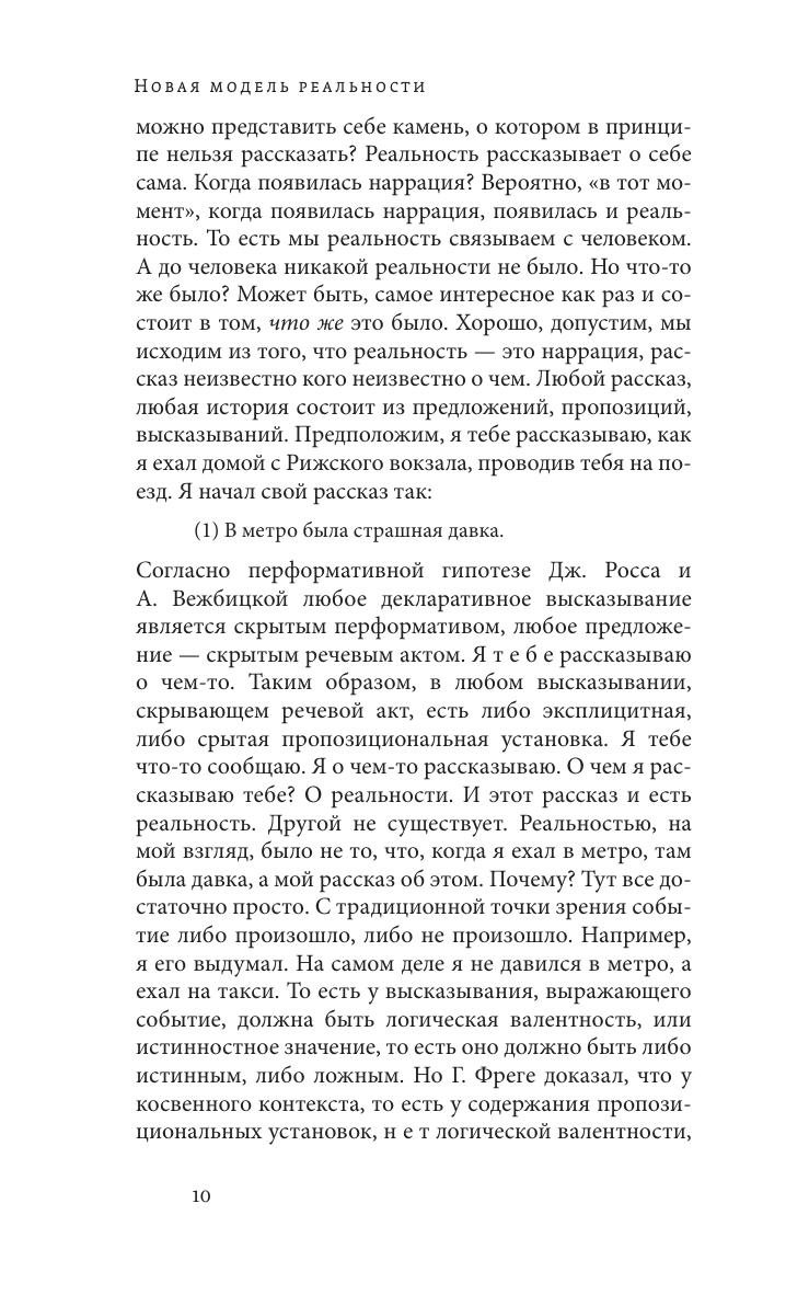 Книга посвящена конструированию новой модели реальности, в основе которой лежит понятие нарративной онтологии. Это понятие подразумевает, что представления об истинном и ложном не играют основополагающей роли в жизни человека. Простые высказывания в пропозициональной логике могут быть истинными и ложными. Но содержание пропозициональной установки (например, «Я говорю, что…», «Я полагаю, что…» и т.д.), в соответствии с правилом Г. Фреге, не имеет истинностного значения. Таким образом, во фразе «Я говорю, что идет дождь» истинностным значением будет обладать только часть «Я говорю…». Отсюда первый закон нарративной онтологии: мы можем быть уверены только в том факте, что мы что-то говорим. Второй закон нарративной онтологии гласит: неважно, имело ли место то или иное событие, важно, насколько оно для нас интересно. Реальность рассказывает нам о чем-то. Если мы правильно прочтем ее послания, то сумеем понять смысл жизни.