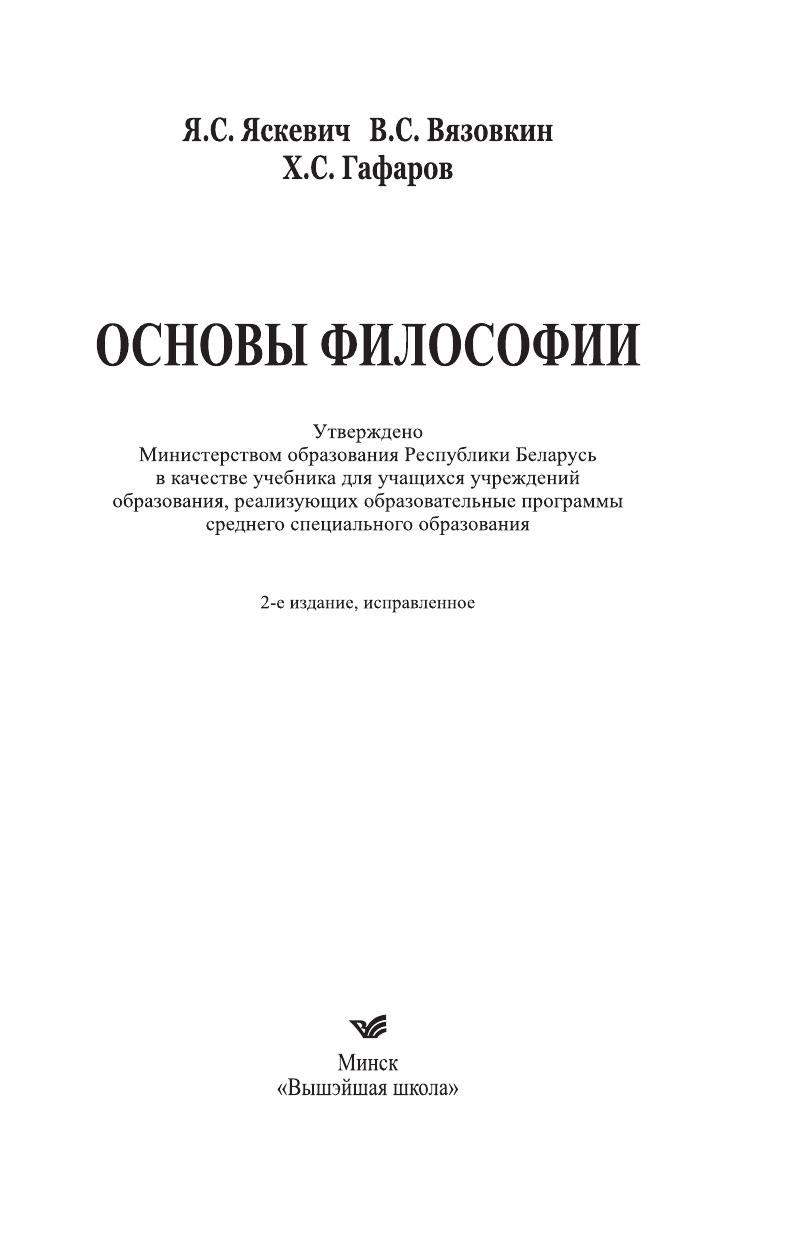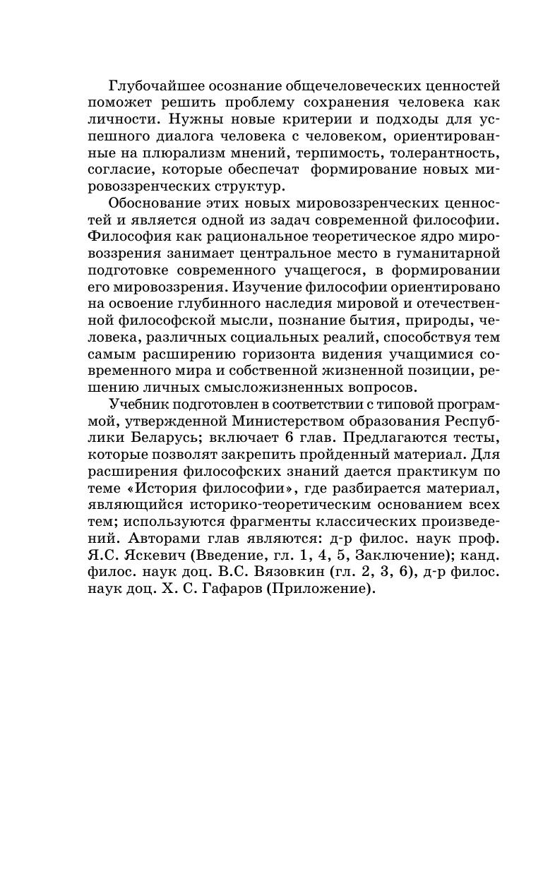 Рассматриваются сущность и содержание основных разделов философского знания (онтология, гносеология, философская антропология, социальная философия), анализируются важнейшие проблемы философии и конкретно-исторические варианты их решения. Подготовлено в соответствии с типовой учебной программой, утвержденной Министерством образования Республики Беларусь. 1-е издание вышло в 2011 г. Для учащихся учреждений образования, реализующих образовательные программы среднего специального образования, а также всех интересующихся проблемами философской мысли.