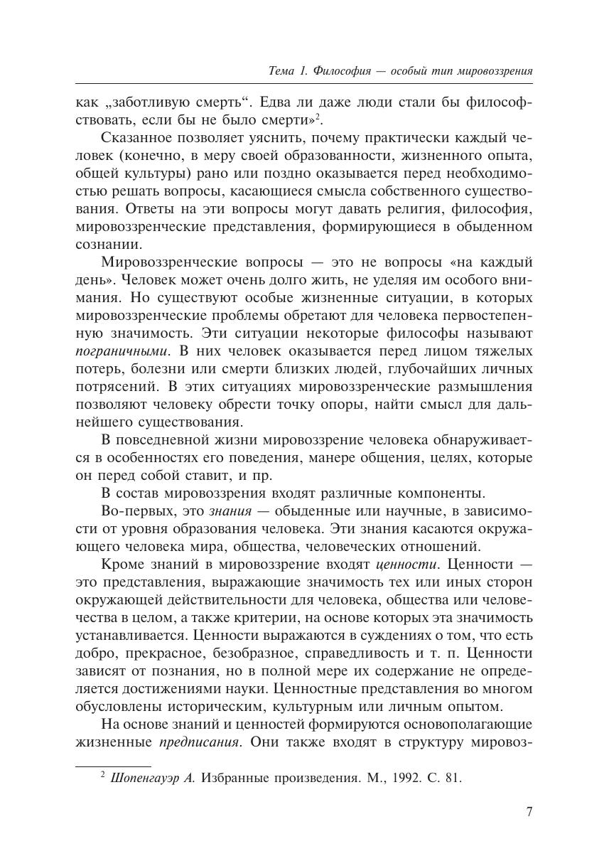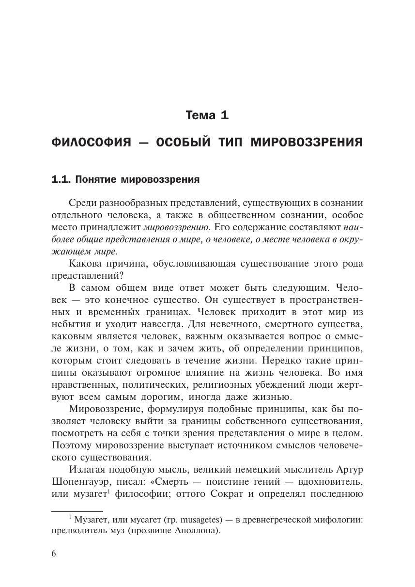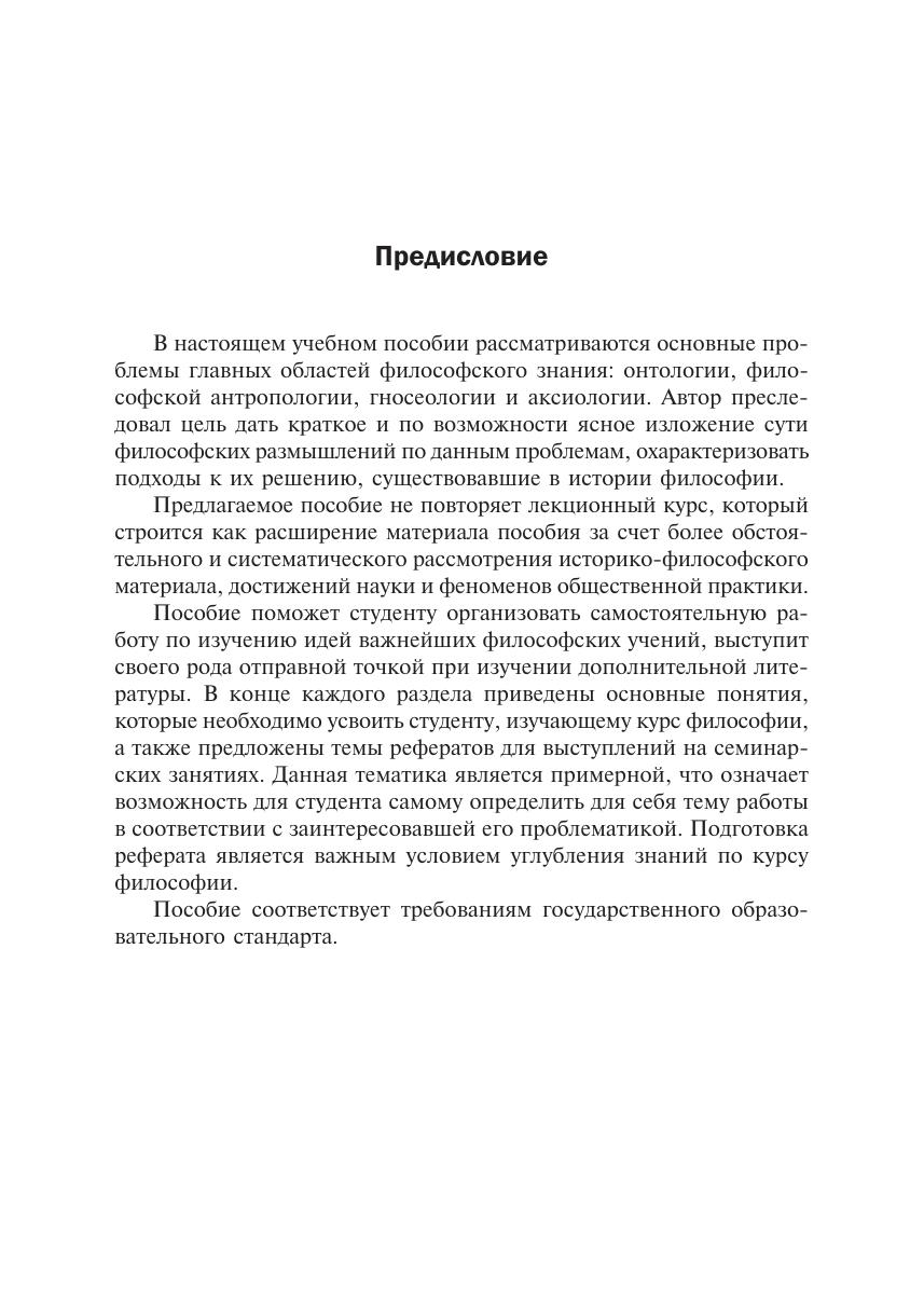 В учебном пособии рассмотрены основные проблемы главных областей философского знания, охарактеризованы подходы к их решению. Дополняя лекционный курс, пособие поможет студенту организовать самостоятельную работу по изучению идей важнейших философских учений. В конце каждого раздела приведены основные понятия, необходимые для усвоения, предложены темы рефератов. Издание соответствует требованиям государственного образовательного стандарта. Учебное пособие предназначено для студентов бакалавриата и для широкого круга читателей, интересующихся философией.
