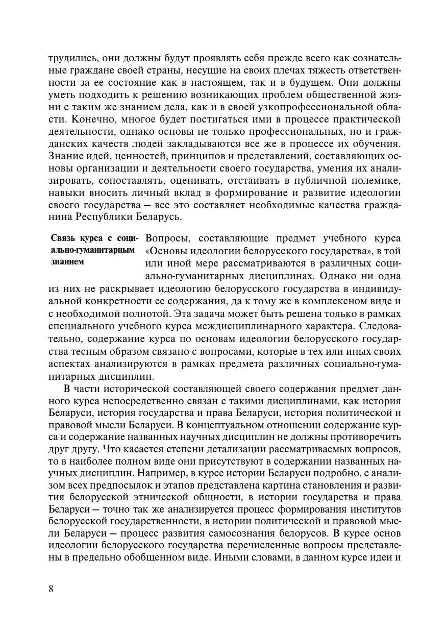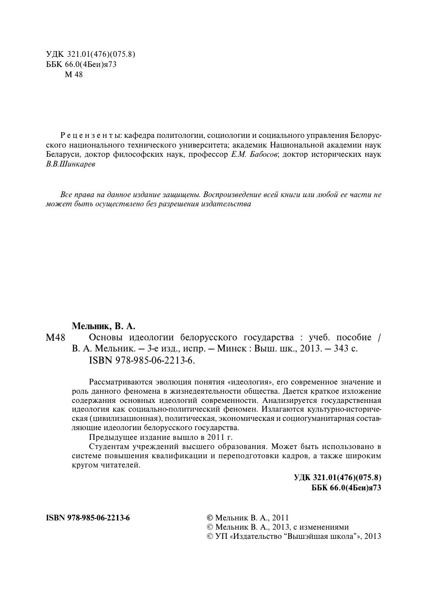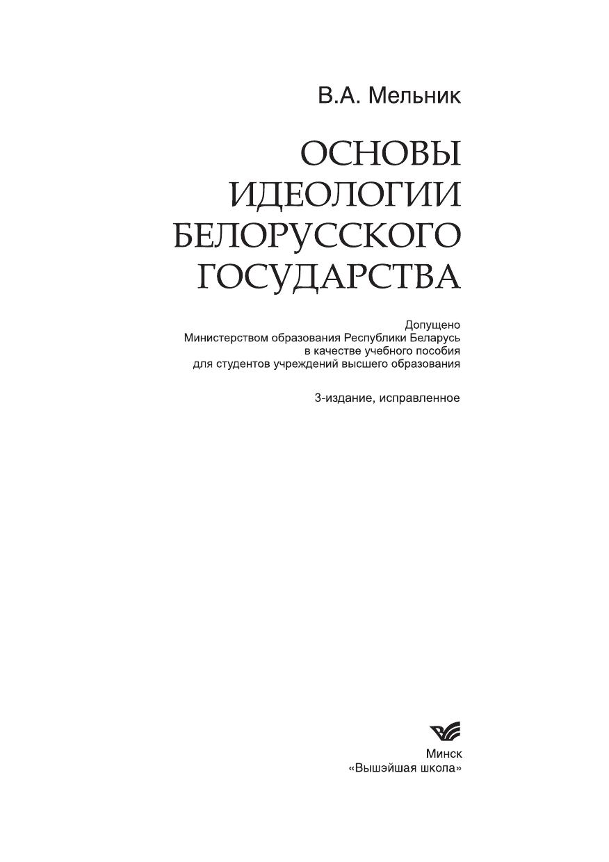 Рассматриваются эволюция понятия "идеология", его современное значение и роль данного феномена в жизнедеятельности общества. Дается краткое изложение содержания основных идеологий современности. Анализируется государственная идеология как социально-политический феномен. Излагаются культурно-историческая (цивилизационная), политическая, экономическая и социогуманитарная составляющие идеологии белорусского государства. Для студентов вузов. Может быть использовано в системе повышения квалификации и переподготовки кадров, а также широким кругом читателей.