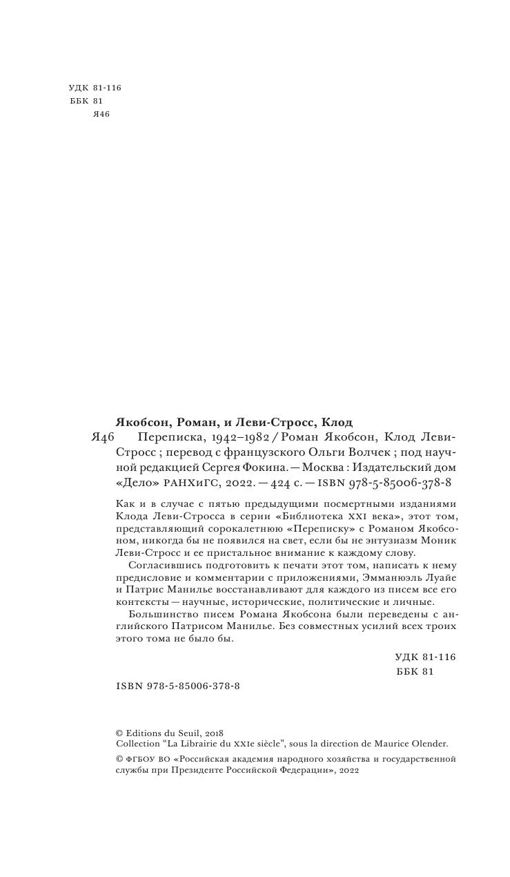 Как и в случае с пятью предыдущими посмертными изданиями Клода Леви-Стросса в серии «Библиотека XXI века», этот том, представляющий сорокалетнюю «Переписку» с Романом Якобсоном, никогда бы не появился на свет, если бы не энтузиазм Моник Леви-Стросс и ее пристальное внимание к каждому слову. Согласившись подготовить к печати этот том, написать к нему предисловие и комментарии с приложениями, Эмманюэль Луайе и Патрис Манилье восстанавливают для каждого из писем все его контексты — научные, исторические, политические и личные. Большинство писем Романа Якобсона были переведены с английского Патрисом Манилье. Без совместных усилий всех троих этого тома не было бы.