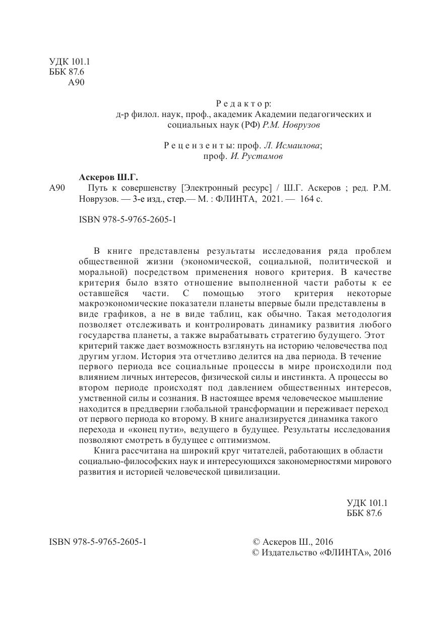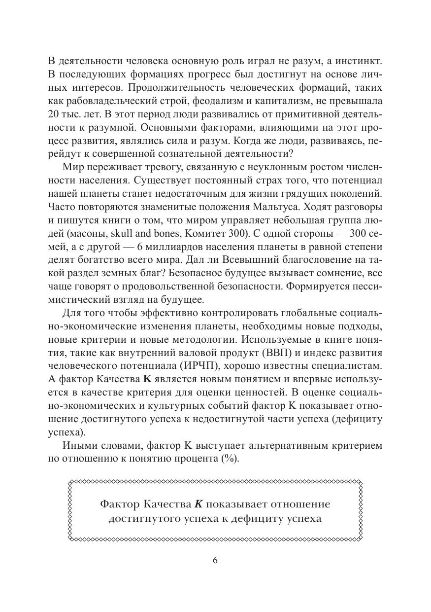 В книге представлены результаты исследования ряда проблем общественной жизни (экономической, социальной, политической и моральной) посредством применения нового критерия. В качестве критерия было взято отношение выполненной части работы к ее оставшейся части. С помощью этого критерия некоторые макроэкономические показатели планеты впервые были представлены в виде графиков, а не в виде таблиц, как обычно. Такая методология позволяет отслеживать и контролировать динамику развития любого государства планеты, а также вырабатывать стратегию будущего. Этот критерий также дает возможность взглянуть на историю человечества под другим углом. История эта отчетливо делится на два периода. В течение первого периода все социальные процессы в мире происходили под влиянием личных интересов, физической силы и инстинкта. А процессы во втором периоде происходят под давлением общественных интересов, умственной силы и сознания. В настоящее время человеческое мышление находится в преддверии глобальной трансформации и переживает переход от первого периода ко второму. В книге анализируется динамика такого перехода и «конец пути», ведущего в будущее. Результаты исследования позволяют смотреть в будущее с оптимизмом.