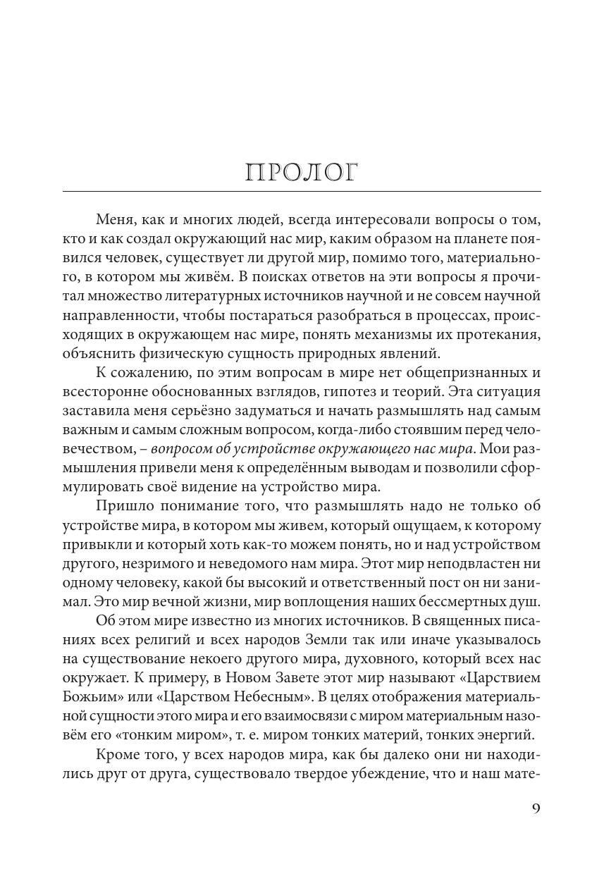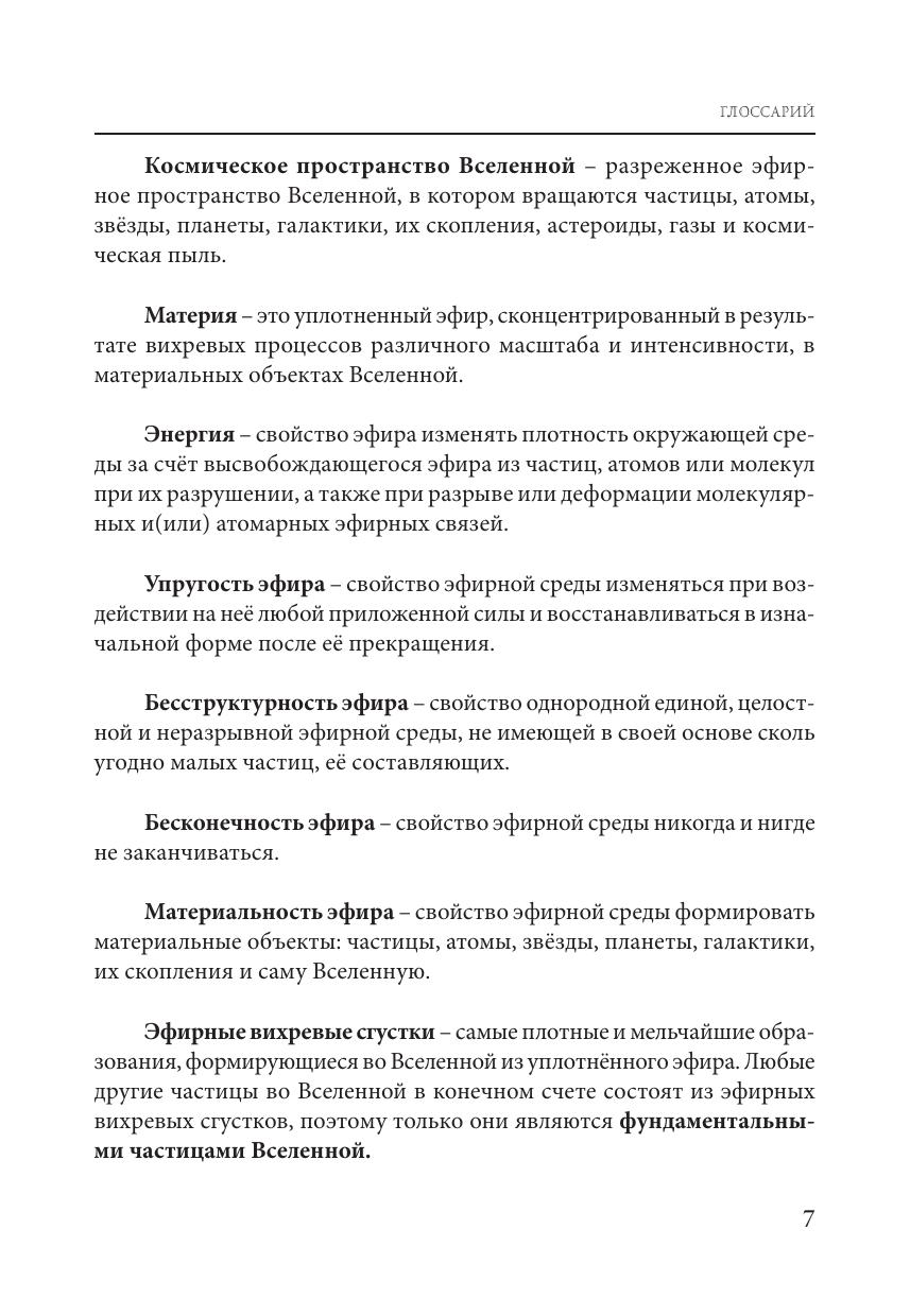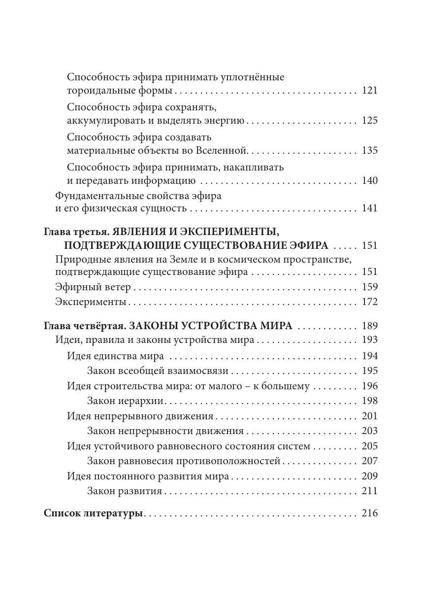 основу. Автор раскрывает свойства эфира и приводит подтверждения его существования на основе анализа природных явлений на Земле и в космосе, а также проведённых им экспериментов. Особое место в книге занимают сформулированные законы устройства мира, которые лежат в основе мироздания.