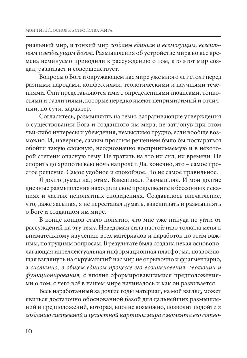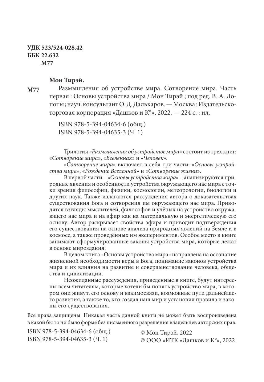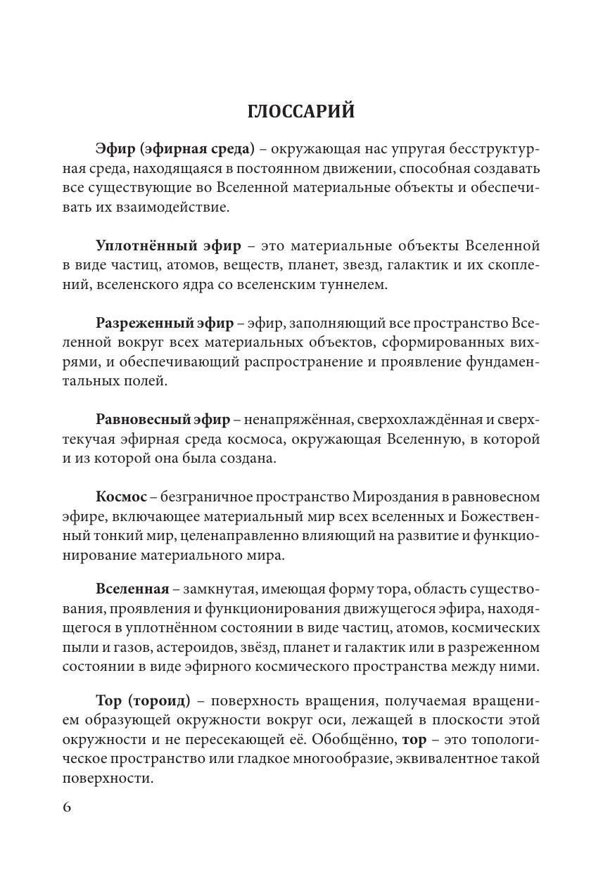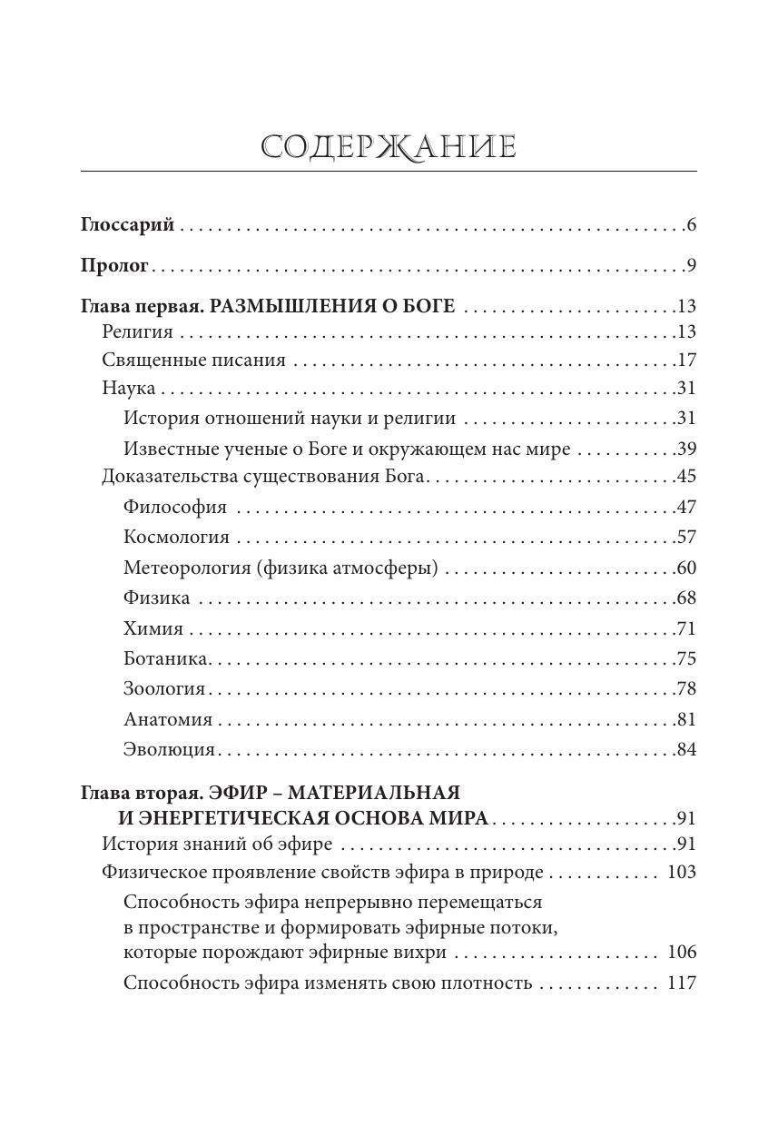 основу. Автор раскрывает свойства эфира и приводит подтверждения его существования на основе анализа природных явлений на Земле и в космосе, а также проведённых им экспериментов. Особое место в книге занимают сформулированные законы устройства мира, которые лежат в основе мироздания.