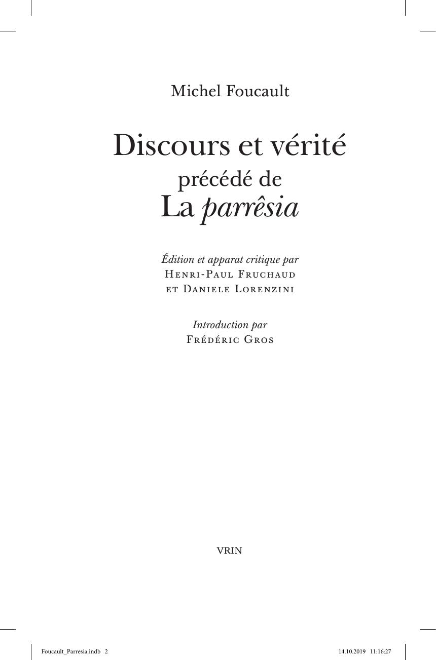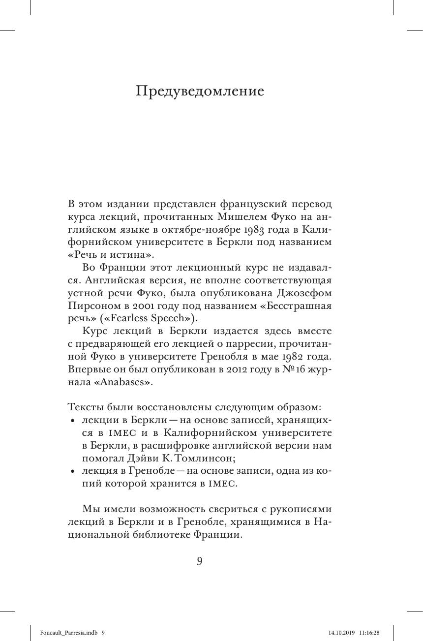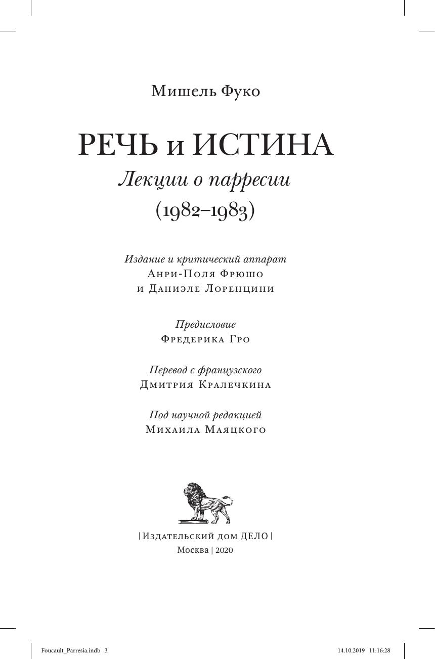 Осенью 1983 года Мишель Фуко читает в Калифорнийском университете в Беркли цикл из шести лекций под названием «Речь и истина», впервые представленный в этой книге в виде полного критического издания. В этих лекциях со всей очевидностью проявляются богатство понятия парресии и его стратегическая роль в этических и политических размышлениях Фуко. В частности, Фуко исследует трансформации этого понятия в античном мире: парресия, первоначально являвшаяся политическим правом афинского гражданина, у Сократа становится одной из главных черт философской речи, а потом, у киников и в философской жизни вообще, в той мере, в какой она может быть провокационной и даже скандальной, наконец, в первые столетия Римской империи парресия превращается в основание отношений между учителем и учеником в культуре себя. Занимаясь анализом парресии, Фуко в то же время развивает свой собственный проект истории настоящего и размечает вехи генеалогии критической установки, свойственной современности и Новому времени. В данном издании публикуется также расшифровка лекции, прочитанной Мишелем Фуко в мае 1982 года в университете Гренобля специалистам по античной философии, она представляет более ранний и несколько отличный этап его размышлений о парресии.