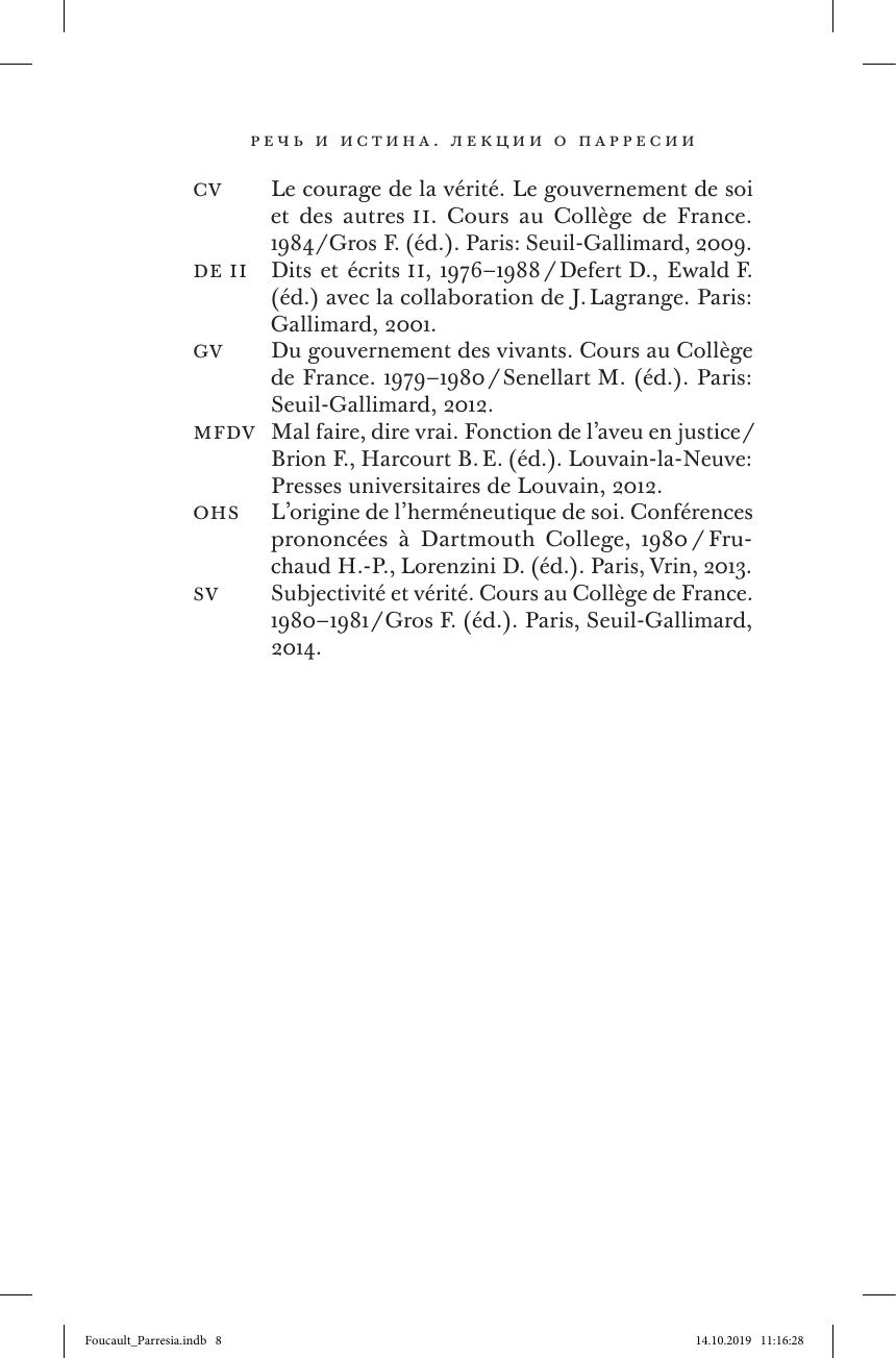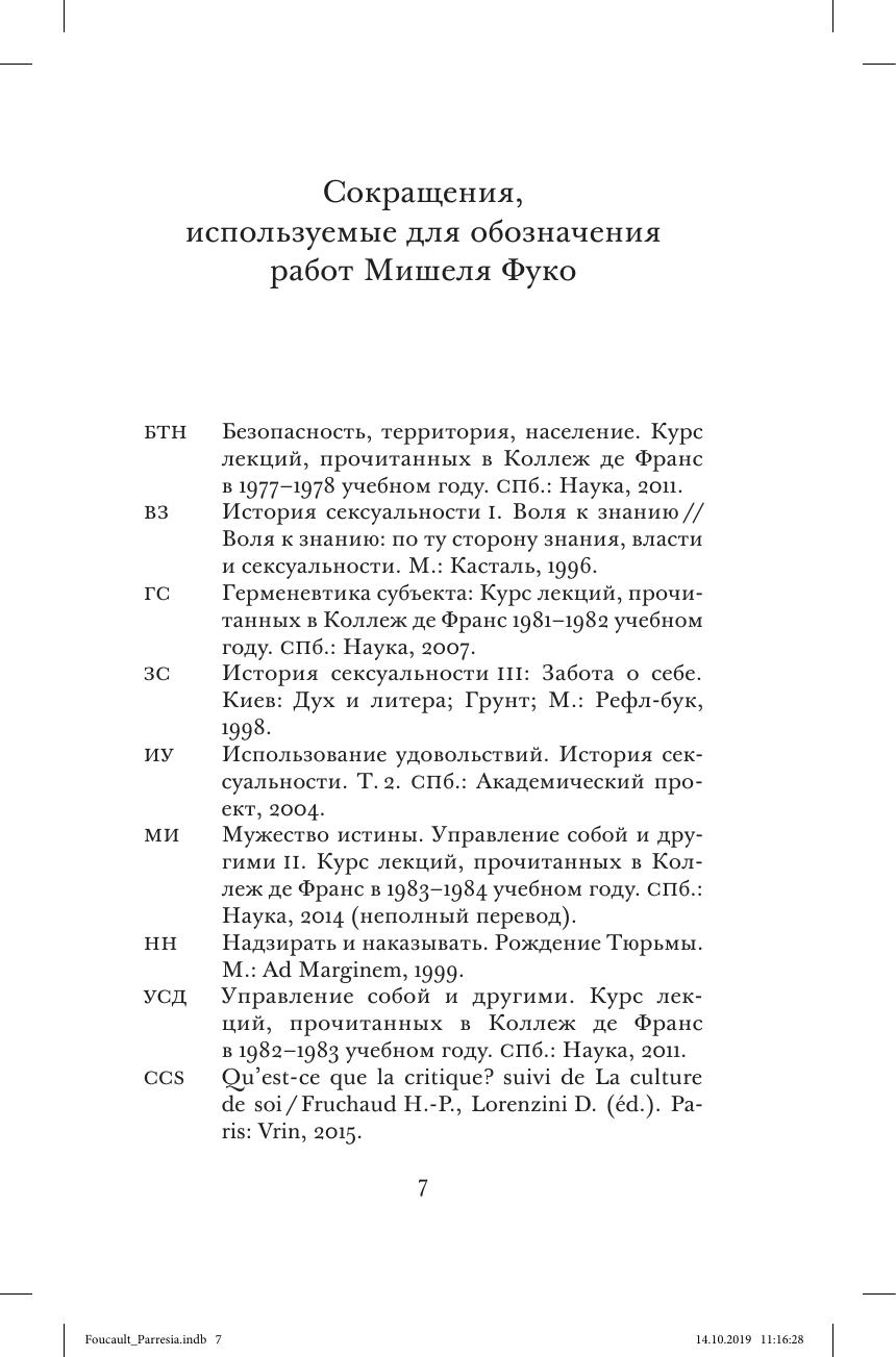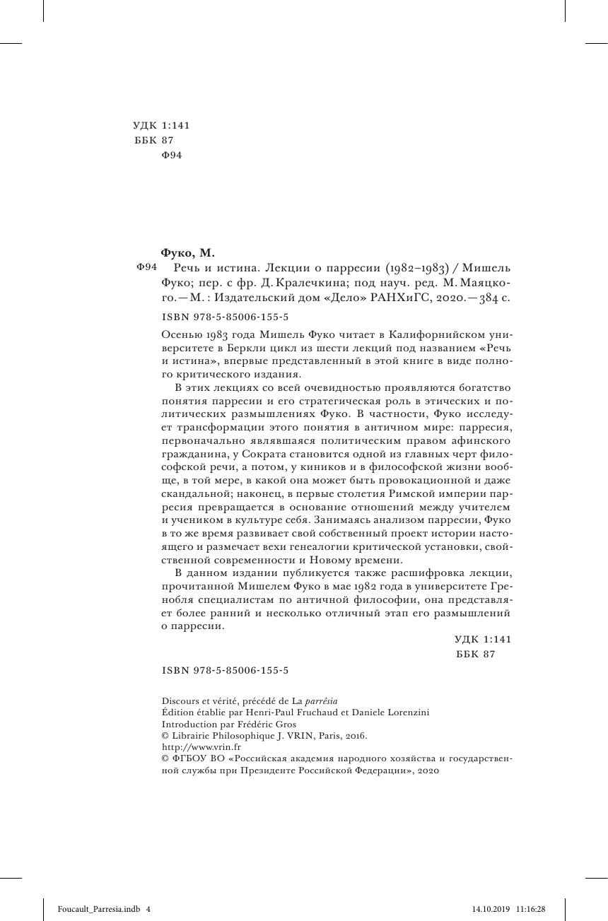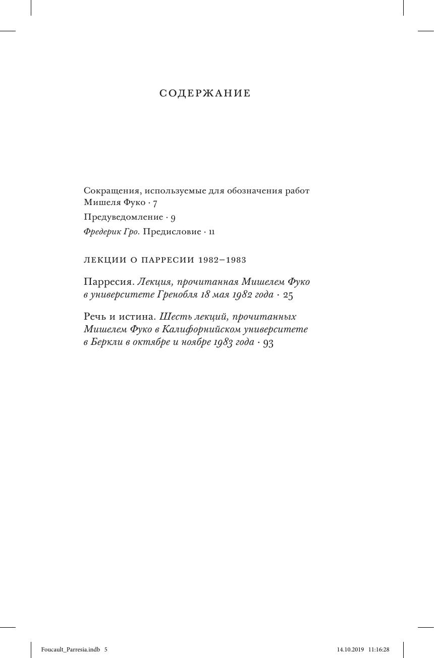 Осенью 1983 года Мишель Фуко читает в Калифорнийском университете в Беркли цикл из шести лекций под названием «Речь и истина», впервые представленный в этой книге в виде полного критического издания. В этих лекциях со всей очевидностью проявляются богатство понятия парресии и его стратегическая роль в этических и политических размышлениях Фуко. В частности, Фуко исследует трансформации этого понятия в античном мире: парресия, первоначально являвшаяся политическим правом афинского гражданина, у Сократа становится одной из главных черт философской речи, а потом, у киников и в философской жизни вообще, в той мере, в какой она может быть провокационной и даже скандальной, наконец, в первые столетия Римской империи парресия превращается в основание отношений между учителем и учеником в культуре себя. Занимаясь анализом парресии, Фуко в то же время развивает свой собственный проект истории настоящего и размечает вехи генеалогии критической установки, свойственной современности и Новому времени. В данном издании публикуется также расшифровка лекции, прочитанной Мишелем Фуко в мае 1982 года в университете Гренобля специалистам по античной философии, она представляет более ранний и несколько отличный этап его размышлений о парресии.