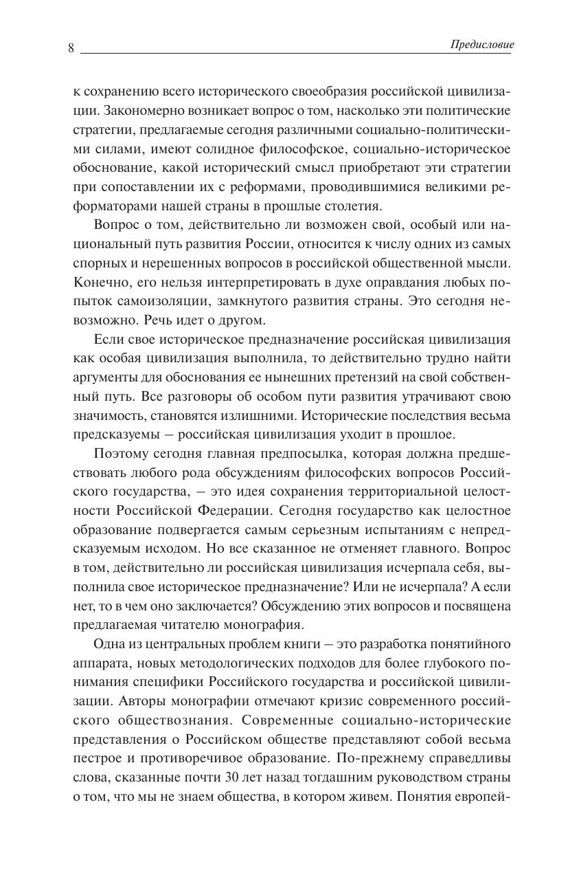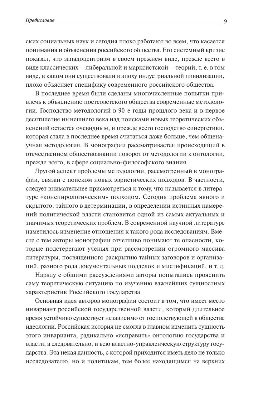В монографии рассматривается одна из вечных и непреходящих проблем отечественной общественной мысли, которая связана с философским осмыслением природы Российского государства, его прошлого, настоящего и будущего. В центре внимания авторов монографии находится остающаяся до сих пор недостаточно раскрытой глубинная взаимосвязь онтологической сущности российской государственности с конкретно-историческими формами Российского государства – Московским царством, Петровской империей, Советским государством, Российской Федерацией. Показываются ключевая роль эпохи Московского царства с точки зрения формирования различных политических стратегий Российского государства в последующие периоды истории, роль российской бюрократии как проводника и как тормоза реформ, возможные пути трансформации российской государственности в XXI веке и будущее российской цивилизации. Монография предназначена для философов, историков, ученых социально-гуманитарного профиля, для всех, кому интересны спорные и нерешенные вопросы российской истории и Российского государства.