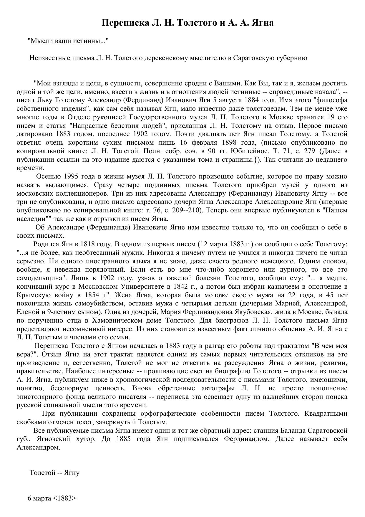 Переписка Л. Н. Толстого и А. А. Ягна