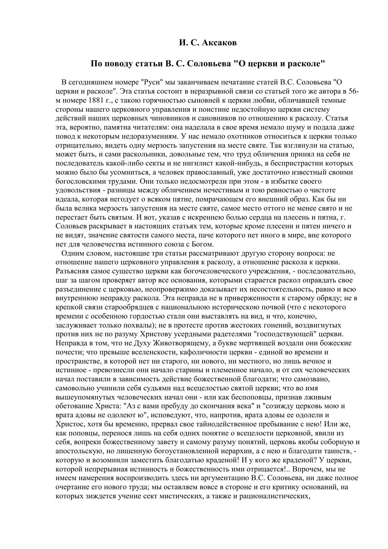 По поводу статьи B.C. Соловьева «О церкви и расколе»