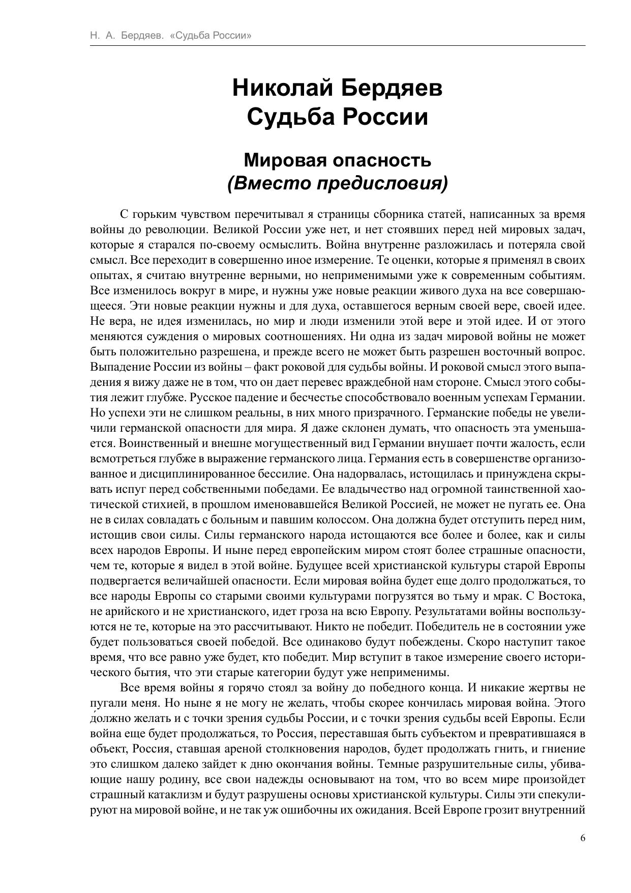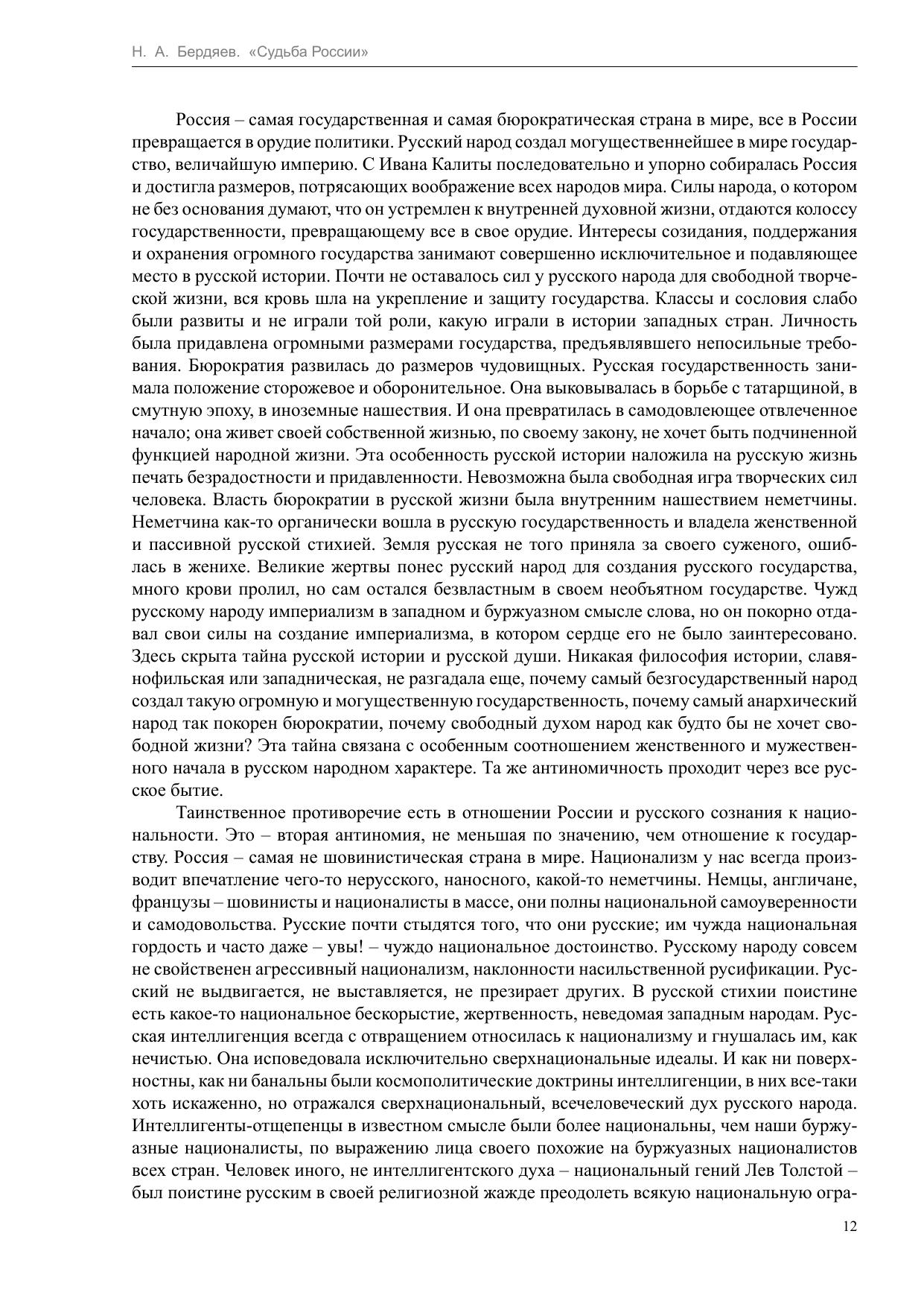 Известный русский философ и публицист Н.А.Бердяев в книге «Судьба России» обобщил свои размышления и прозрения о судьбе русского народа и о судьбе российского государства. Государство изменило название, политическое управление, идеологию, но изменилась ли душа народа? Что есть народ как государство и что есть народ в не зависимости от того, кто и как им управляет? Каково предназначение русского народа в семье народов планеты, какова его роль в мировой истории и в духовной жизни человечества? Эти сложнейшие и острейшие вопросы Бердяев решает по-своему: проповедуя мессианизм русского народа и веруя в его великое предназначение, но одновременно отрицая приоритет государственности над духовной жизнью человека.
