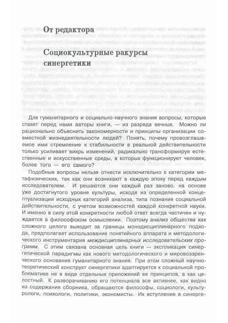 В сборник включены материалы отечественных и зарубежных исследователей, для которых эвристичность междисциплинарных и трансдисциплинарных стратегий, философско-методологических и мировоззренческих возможностей синергетики вполне очевидна. Сложный научно-теоретический конструкт синергетики адаптируется к социальной проблематике, поэтому из всего многообразия подходов и идей, складывающихся в синергетике как широком научном направлении постнеклассического знания, в книге представлен один из актуальных и наименее разработанных разделов синергетики — социальная синергетика.