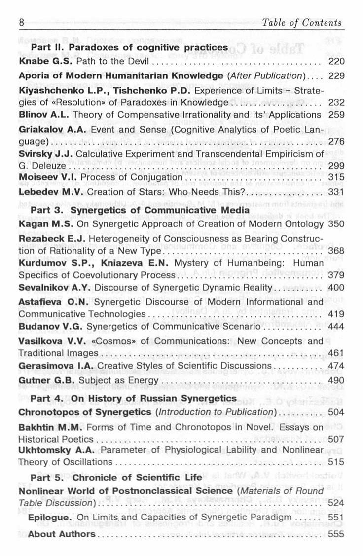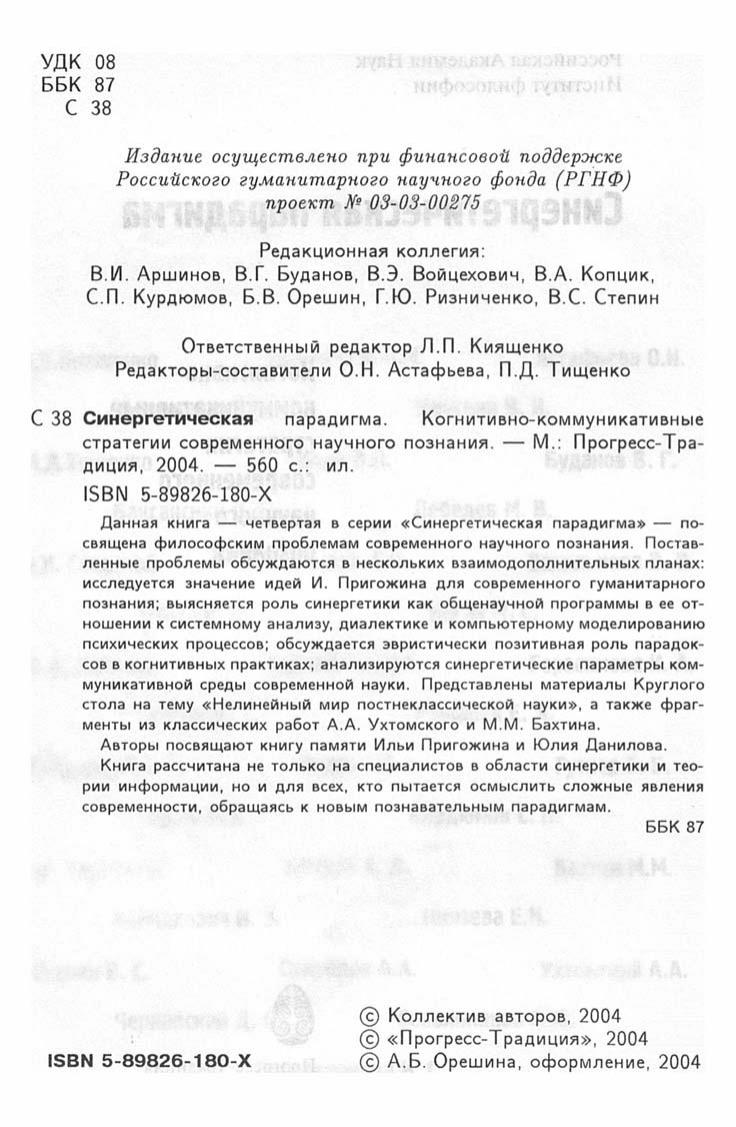 Данная книга - четвертая в серии "Синергетическая парадигма" - посвящена философским проблемам современного научного познания. Поставленные проблемы обсуждаются в нескольких взаимодополнительных планах: исследуется значение идей И.Пригожина для современного гуманитарного познания; выясняется роль синергетики как общенаучной программы в ее отношении к системному анализу, диалектике и компьютерному моделированию психических процессов; обсуждается эвристически позитивная роль парадоксов в когнитивных практиках; анализируются синергетические параметры коммуникативной среды современной науки. Представлены материалы Круглого стола на тему "Нелинейный мир постнеклассической науки", а также фрагменты из классических работ А.А. Ухтомского и М.М. Бахтина.Авторы посвящают книгу памяти Ильи Пригожина и Юлия Данилова.Книга рассчитана не только на специалистов в области синергетики и теории информации, но и на всех, кто пытается осмыслить сложные явления современности, обращаясь к новым познавательным парадигмам.