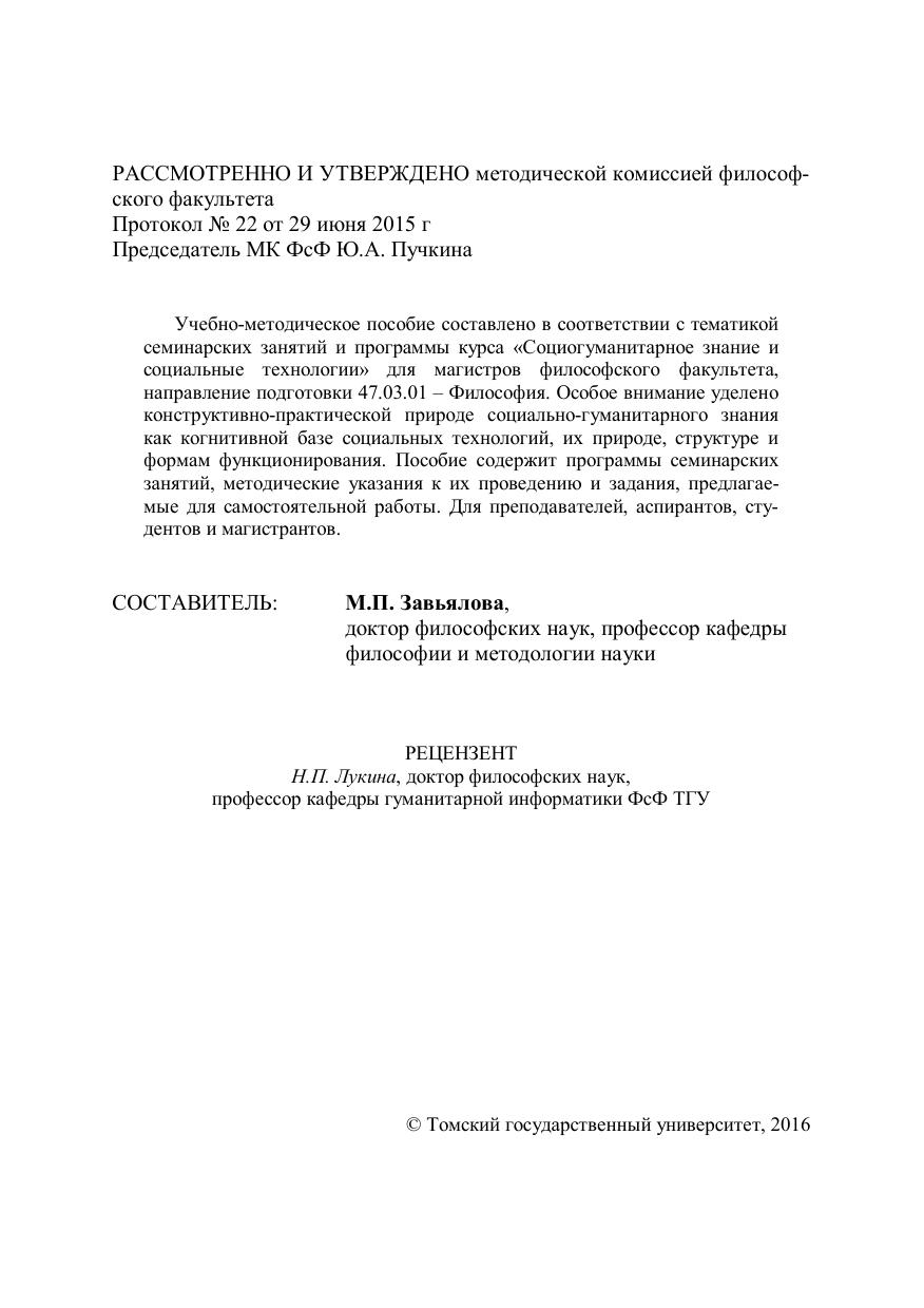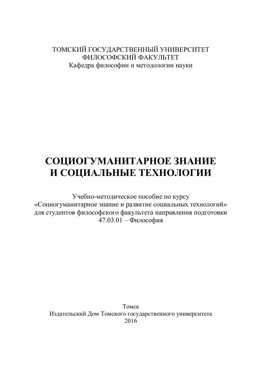 Учебно-методическое пособие составлено в соответствии с тематикой семинарских занятий и программы курса «Социогуманитарное знание и социальные технологии» для магистров философского факультета, направление подготовки 47.03.01 – Философия. Особое внимание уделено конструктивно-практической природе социально-гуманитарного знания как когнитивной базе социальных технологий, их природе, структуре и формам функционирования. Пособие содержит программы семинарских занятий, методические указания к их проведению и задания, предлагаемые для самостоятельной работы. Для преподавателей, аспирантов, студентов и магистрантов.