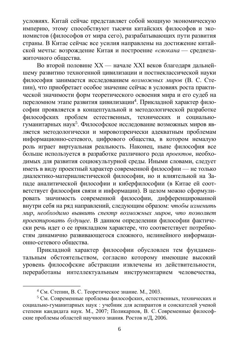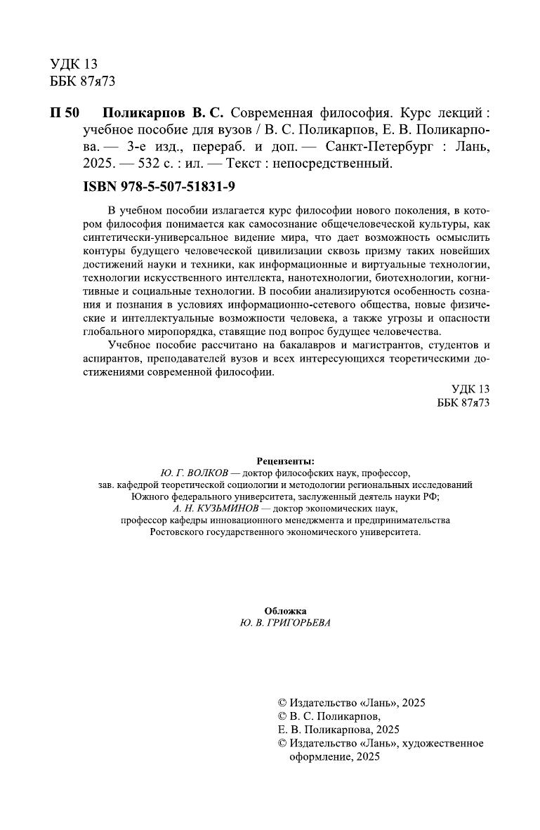 В учебном пособии излагается курс философии нового поколения, в котором философия понимается как самосознание общечеловеческой культуры, как синтетически-универсальное видение мира, что дает возможность осмыслить контуры будущего человеческой цивилизации сквозь призму таких новейших достижений науки и техники, как информационные и виртуальные технологии, технологии искусственного интеллекта, нанотехнологии, биотехнологии, когнитивные и социальные технологии. В пособии анализируются особенность сознания и познания в условиях информационно-сетевого общества, новые физические и интеллектуальные возможности человека, а также угрозы и опасности глобального миропорядка, ставящие под вопрос будущее человечества. Учебное пособие рассчитано на бакалавров и магистрантов, студентов и аспирантов, преподавателей вузов и всех интересующихся теоретическими достижениями современной философии.