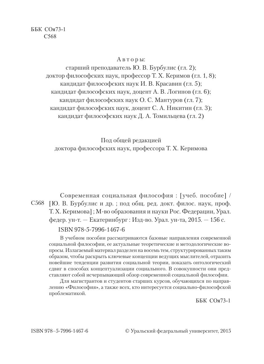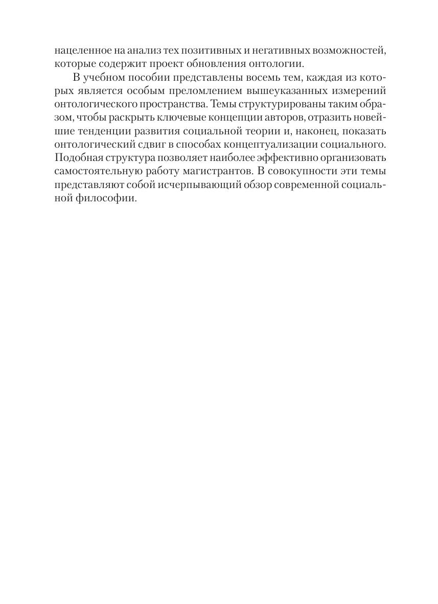 В учебном пособии рассматриваются базовые направления современной социальной философии, ее актуальные теоретические и методологические вопросы. Излагаемый материал разделен на восемь тем, структурированных таким образом, чтобы раскрыть ключевые концепции ведущих мыслителей, отразить новейшие тенденции развития социальной теории, показать онтологический сдвиг в способах концептуализации социального. В совокупности они представляют собой исчерпывающий обзор современной социальной философии. Для магистрантов и студентов старших курсов, обучающихся по направлению «Философия», а также всех, кто интересуется социально-философской проблематикой.