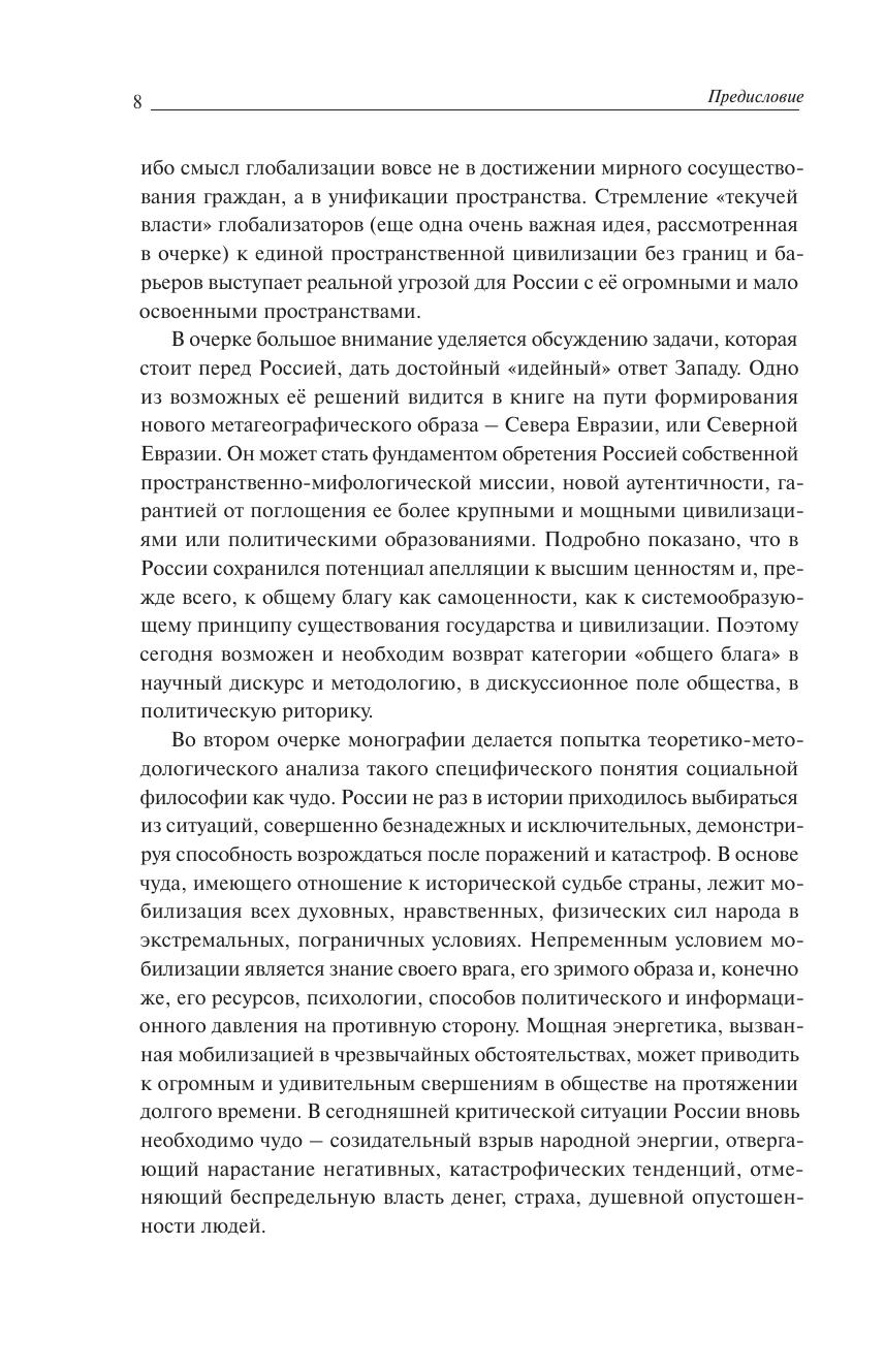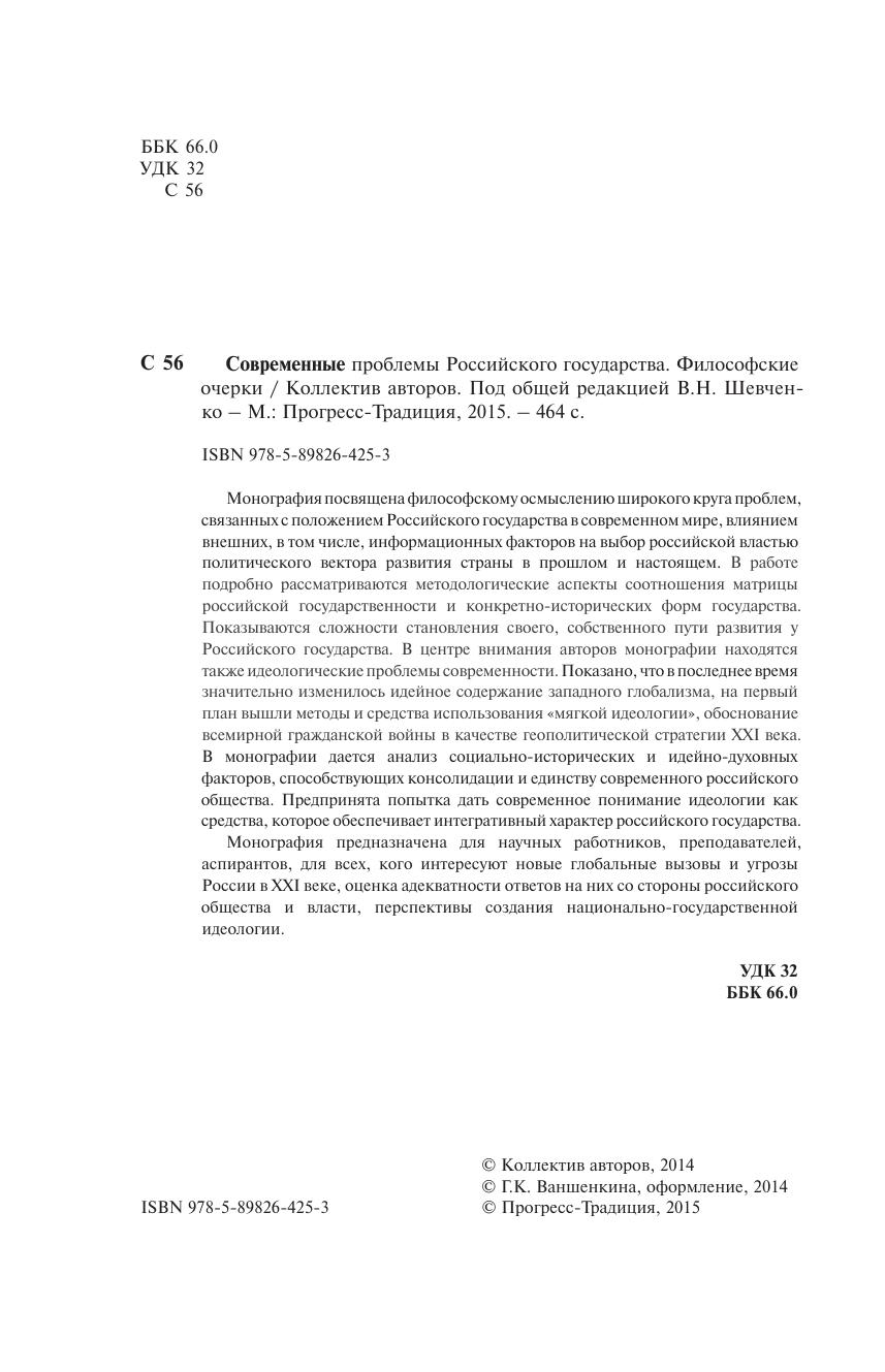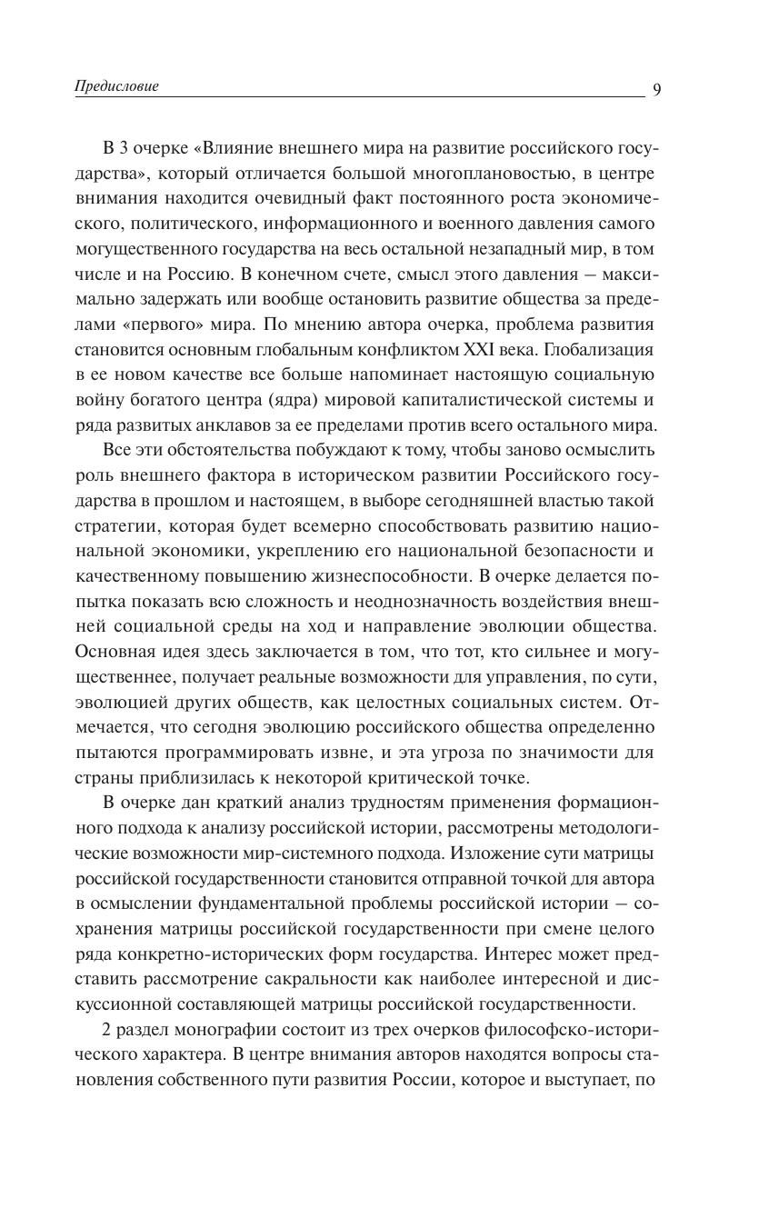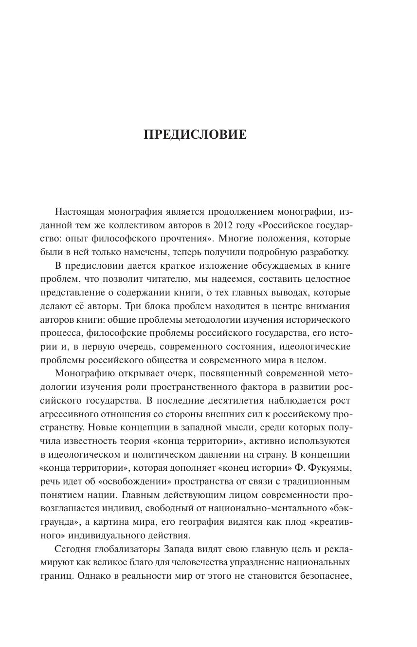 Монография посвящена философскому осмыслению широкого круга проблем, связанных с положением Российского государства в современном мире, влиянием внешних, в том числе, информационных факторов на выбор российской властью политического вектора развития страны в прошлом и настоящем. В работе подробно рассматриваются методологические аспекты соотношения матрицы российской государственности и конкретно-исторических форм государства. Показываются сложности становления своего, собственного пути развития у Российского государства. В центре внимания авторов монографии находятся также идеологические проблемы современности. Показано, что в последнее время значительно изменилось идейное содержание западного глобализма, на первый план вышли методы и средства использования "мягкой идеологии", обоснование всемирной гражданской войны в качестве геополитической стратегии XXI века. В монографии дается анализ социально-исторических и идейно-духовных факторов, способствующих консолидации и единству современного российского общества. Предпринята попытка дать современное понимание идеологии как средства, которое обеспечивает интегративный характер российского государства.