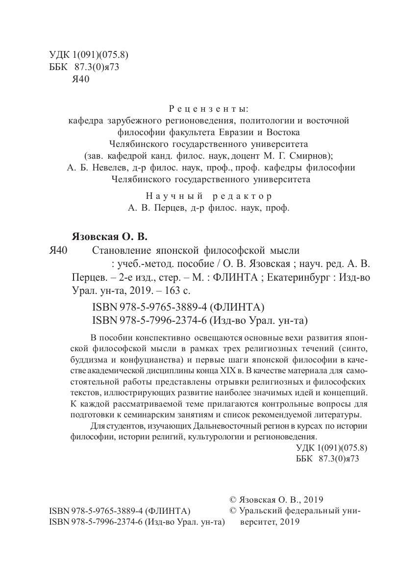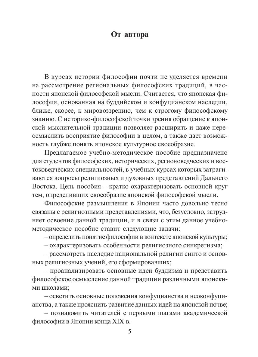 В пособии конспективно освещаются основные вехи развития японской философской мысли в рамках трех религиозных течений (синто, буддизма и конфуцианства) и первые шаги японской философии в качестве академической дисциплины конца XIX в. В качестве материала для самостоятельной работы представлены отрывки религиозных и философских текстов, иллюстрирующих развитие наиболее значимых идей и концепций. К каждой рассматриваемой теме прилагаются контрольные вопросы для подготовки к семинарским занятиям и список рекомендуемой литературы.
