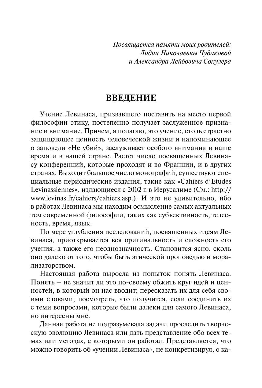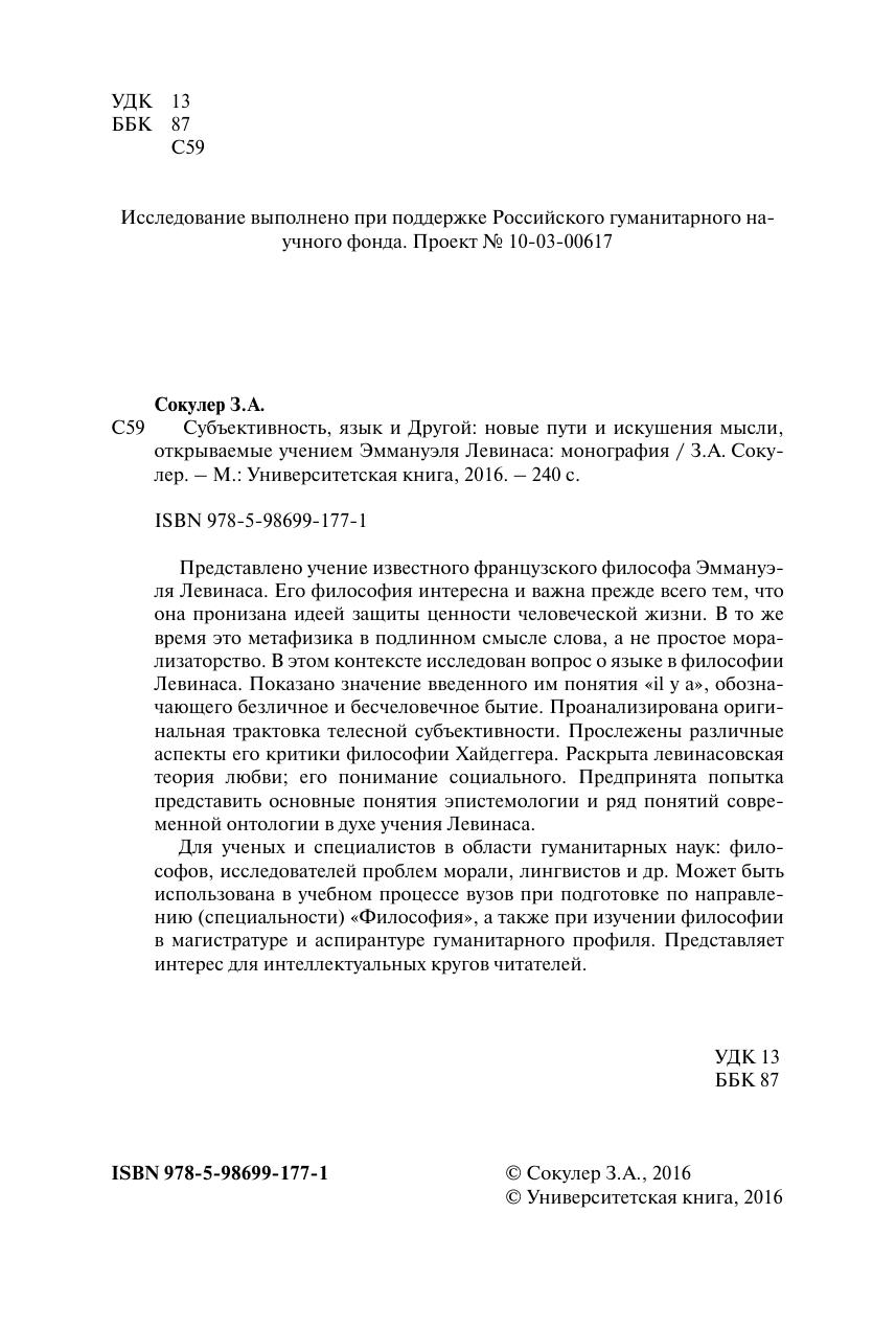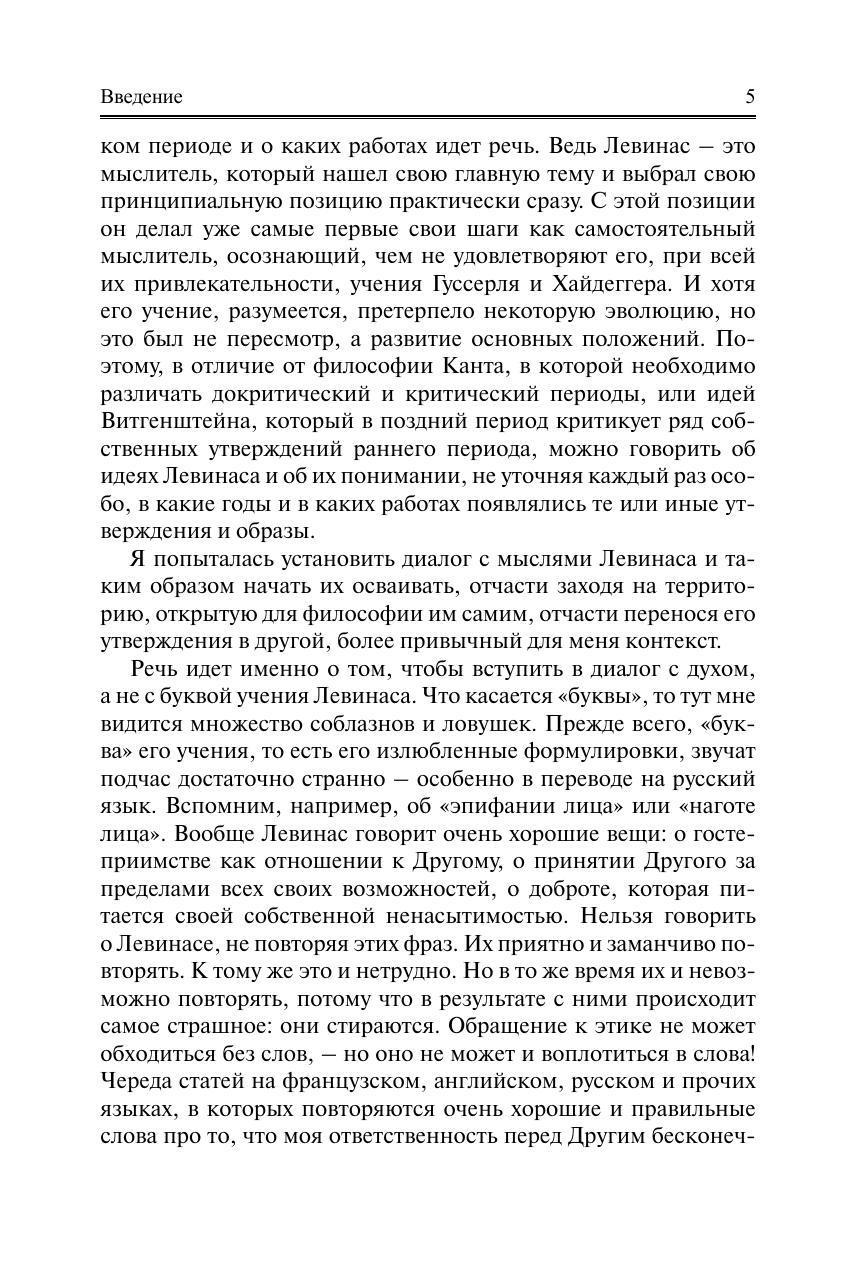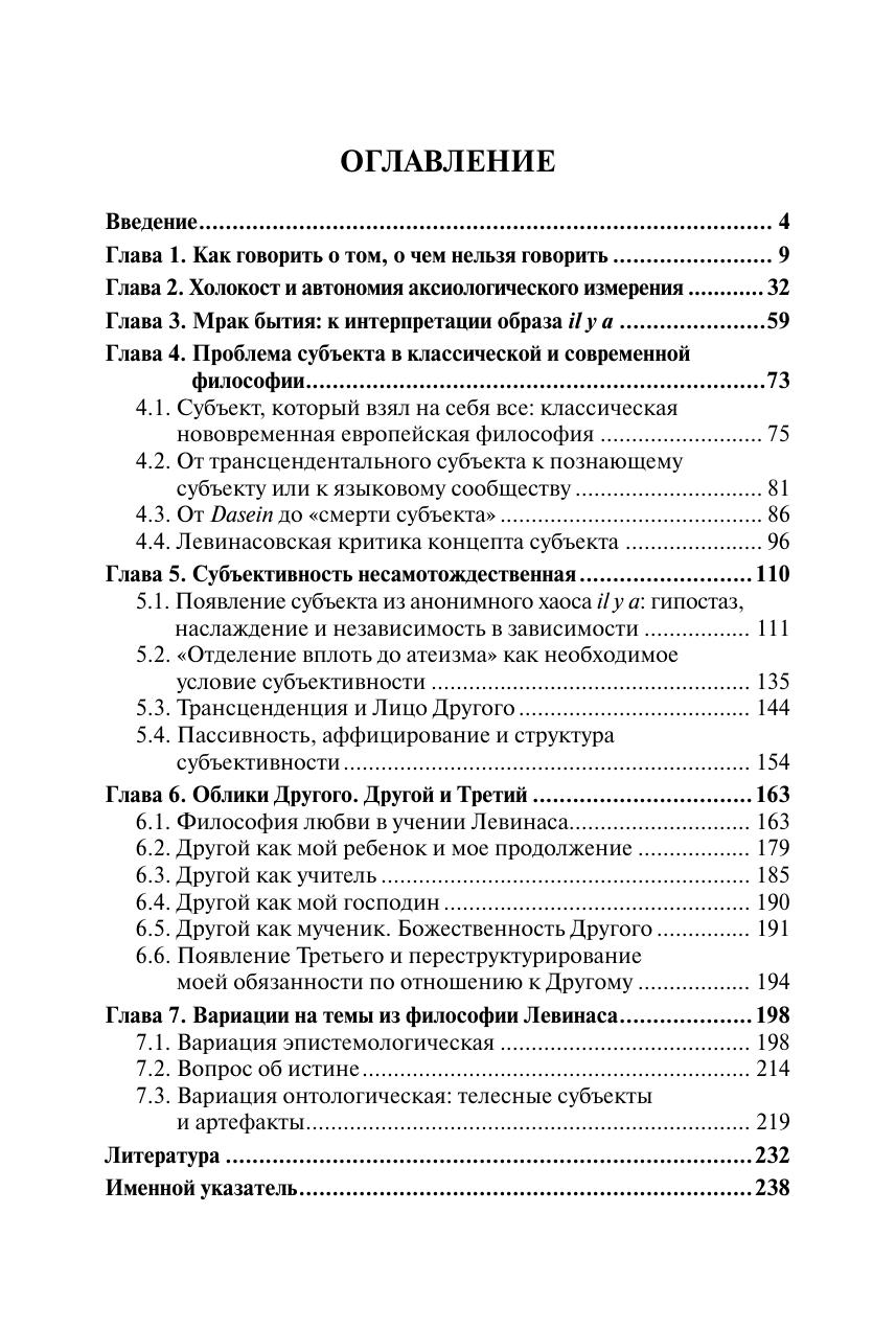 Представлено учение известного французского философа Эммануэля Левинаса. Его философия интересна и важна прежде всего тем, что она пронизана идеей защиты ценности человеческой жизни. В то же время это метафизика в подлинном смысле слова, а не простое морализаторство. В этом контексте исследован вопрос о языке в философии Левинаса. Показано значение введенного им понятия «il y a», обозначающего безличное и бесчеловечное бытие. Проанализирована оригинальная трактовка телесной субъективности. Прослежены различные аспекты его критики философии Хайдеггера. Раскрыта левинасовская теория любви, его понимание социального. Предпринята попытка представить основные понятия эпистемологии и ряд понятий современной онтологии в духе учения Левинаса. Для ученых и специалистов в области гуманитарных наук: философов, исследователей проблем морали, лингвистов и др. Может быть использована в учебном процессе вузов при подготовке по направлению (специальности) «Философия», а также при изучении философии в магистратуре и аспирантуре гуманитарного профиля. Представляет интерес для интеллектуальных кругов читателей.