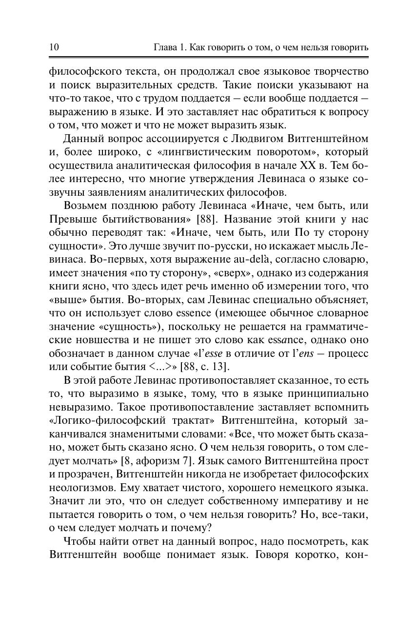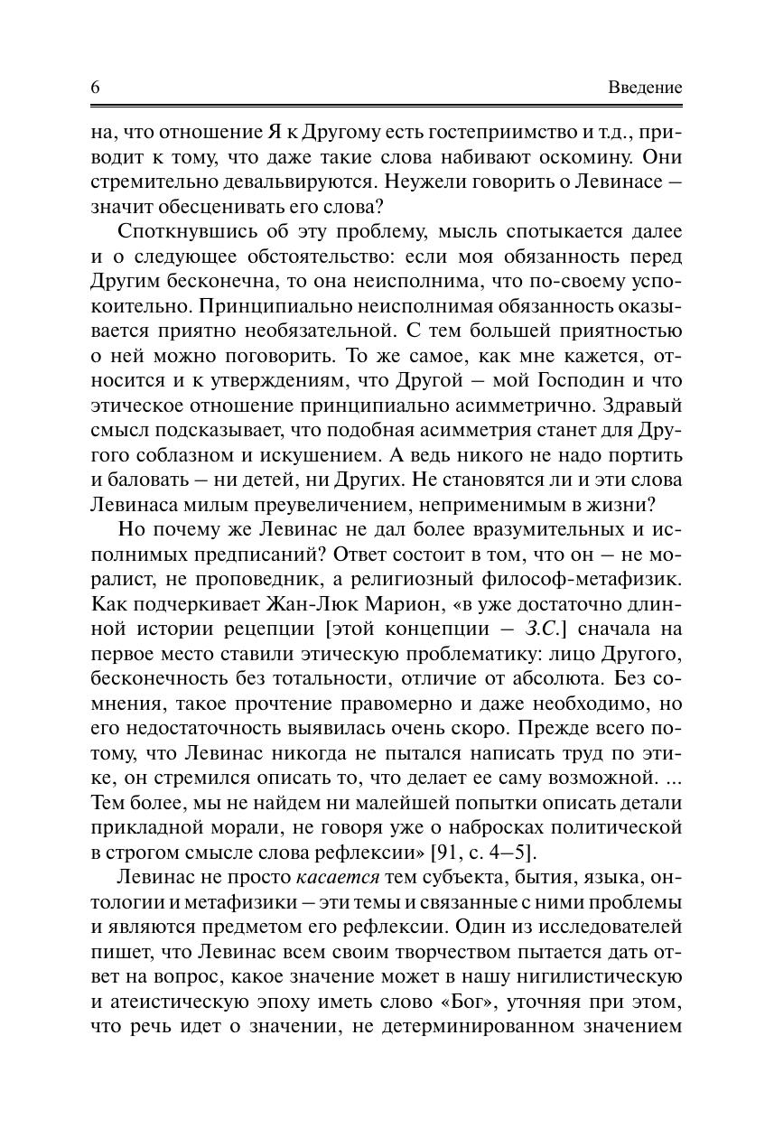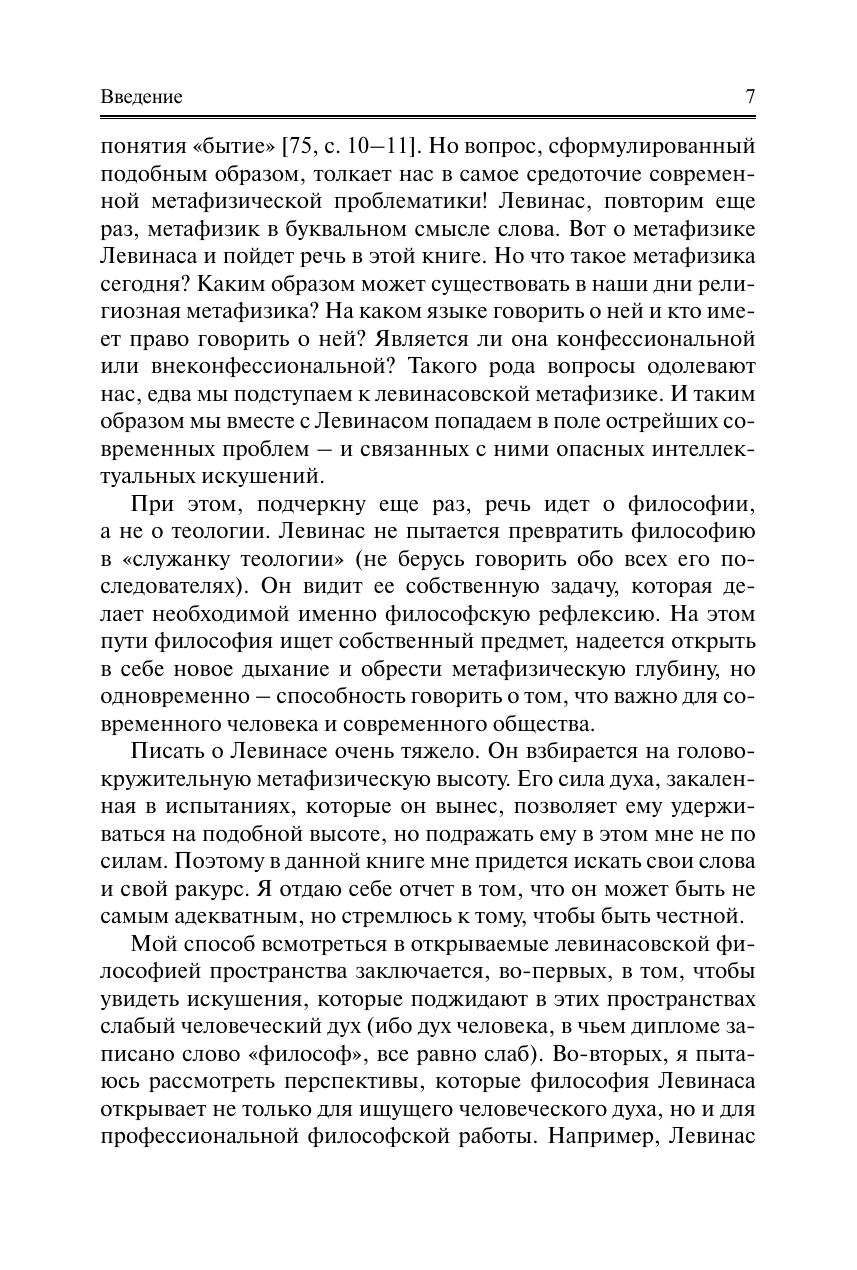Представлено учение известного французского философа Эммануэля Левинаса. Его философия интересна и важна прежде всего тем, что она пронизана идеей защиты ценности человеческой жизни. В то же время это метафизика в подлинном смысле слова, а не простое морализаторство. В этом контексте исследован вопрос о языке в философии Левинаса. Показано значение введенного им понятия «il y a», обозначающего безличное и бесчеловечное бытие. Проанализирована оригинальная трактовка телесной субъективности. Прослежены различные аспекты его критики философии Хайдеггера. Раскрыта левинасовская теория любви, его понимание социального. Предпринята попытка представить основные понятия эпистемологии и ряд понятий современной онтологии в духе учения Левинаса. Для ученых и специалистов в области гуманитарных наук: философов, исследователей проблем морали, лингвистов и др. Может быть использована в учебном процессе вузов при подготовке по направлению (специальности) «Философия», а также при изучении философии в магистратуре и аспирантуре гуманитарного профиля. Представляет интерес для интеллектуальных кругов читателей.