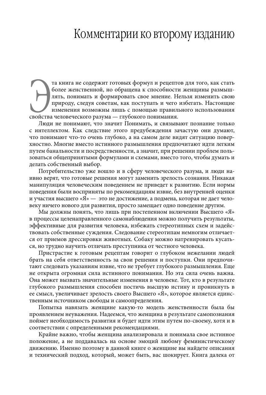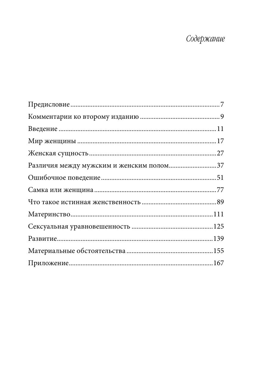 Эта книга дает новое представление о сущности женщины, ее внутреннем мире, сексуальной природе, особенностях поведения, роли в социуме. В книге автор стремится дать развернутый ответ на вопрос, что такое истинная женственность, то есть тот идеал, к которому каждая женщина должна стремиться. По словам автора, книга «не содержит готовых формул и рецептов того, как стать более женственной, но обращена к способности женщины размышлять, понимать и формировать свое мнение». Для широкого круга читателей.