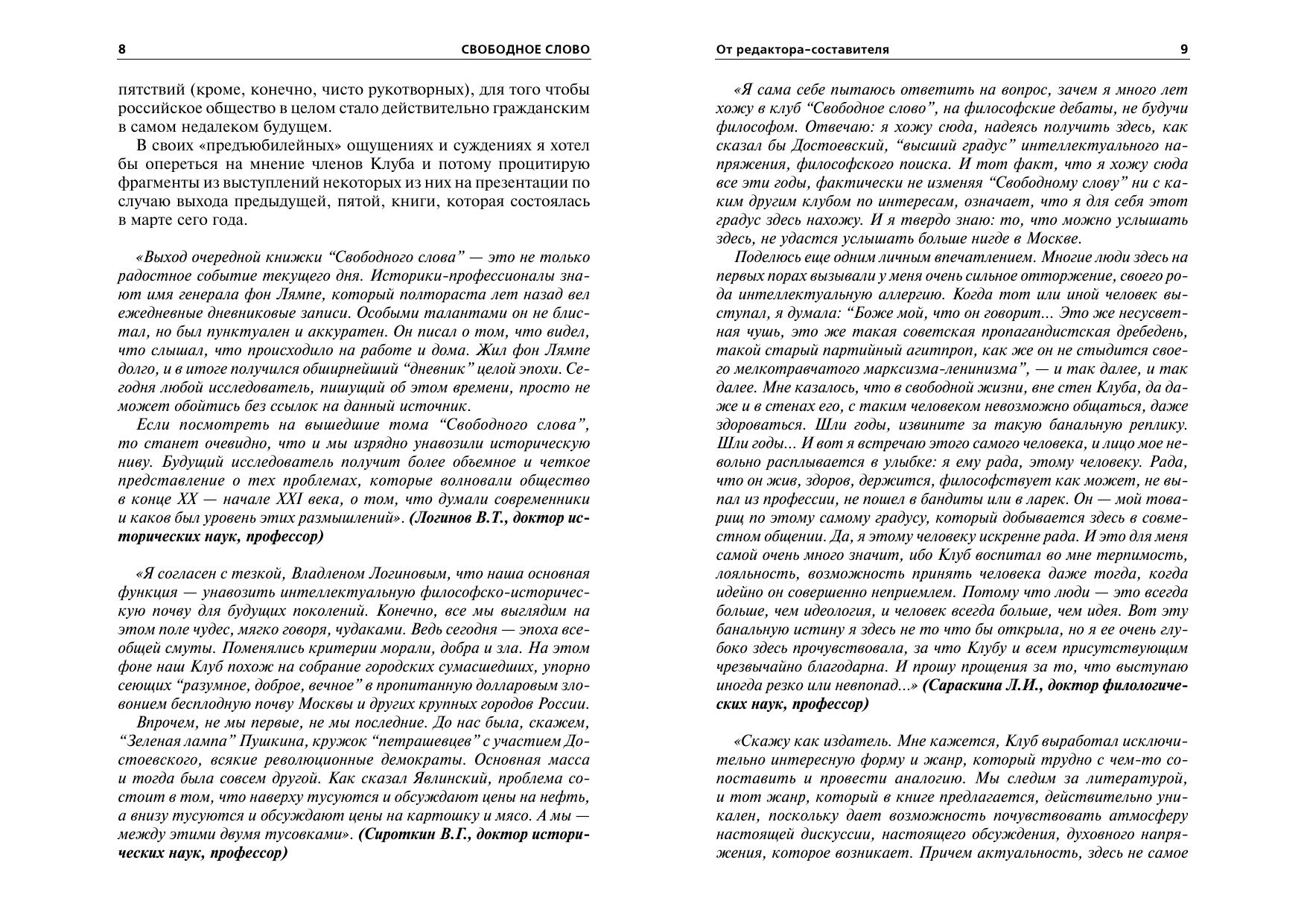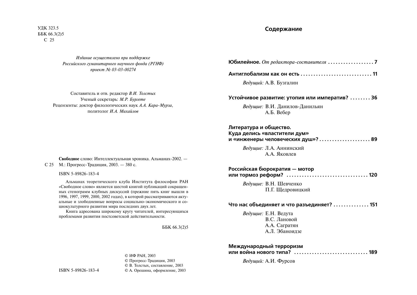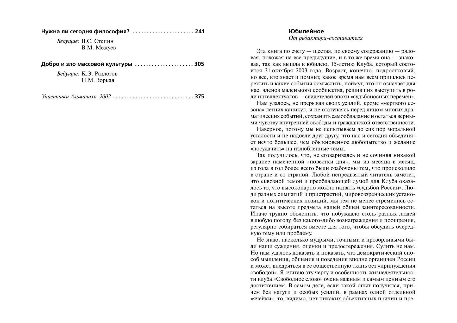 Альманах теоретического клуба Института философии РАН "Свободное слово" является шестой книгой публикаций сокращенных стенограмм клубных дискуссий (прежние пять книг вышли в 1996, 1997, 1999, 2000, 2002 годах), в которой рассматриваются актуальные и злободневные вопросы социально-экономического и социокультурного развития мира последних двух лет.
