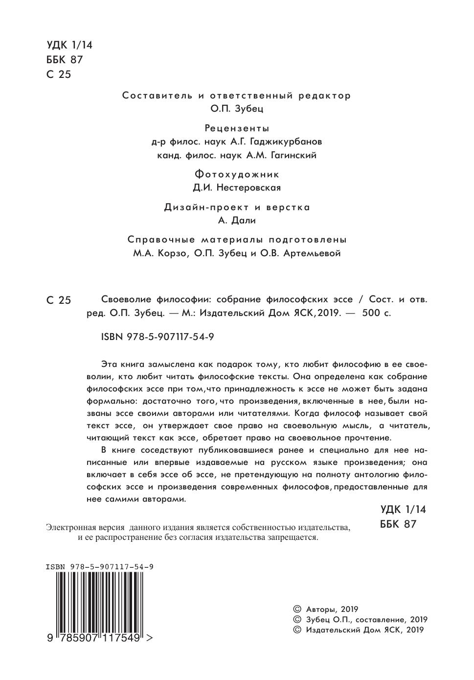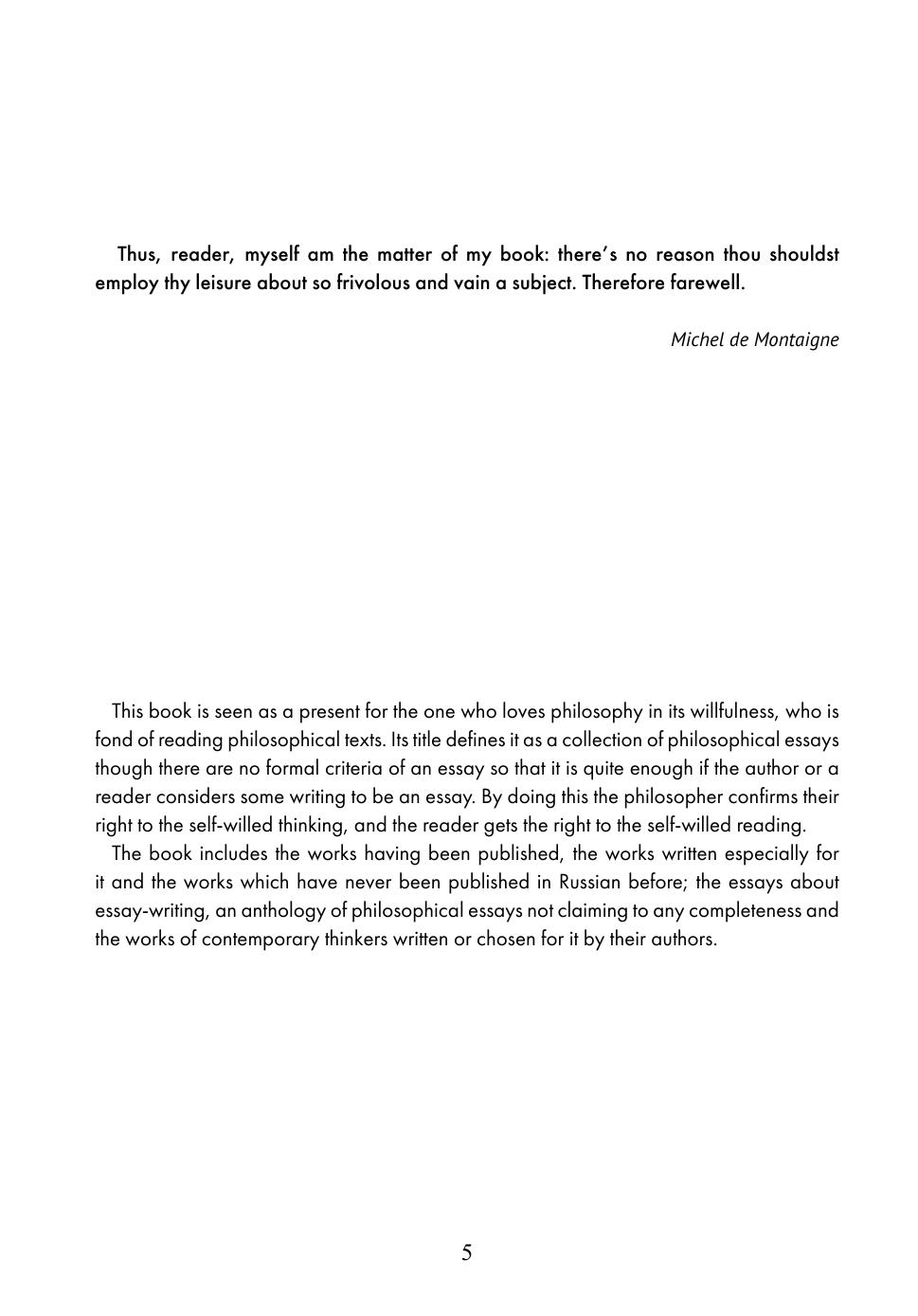 Эта книга замыслена как подарок тому, кто любит философию в ее своеволии, кто любит читать философские тексты. Она определена как собрание философских эссе при том,что принадлежность к эссе не может быть задана формально: достаточно того,что произведения, включенные в нее,были названы эссе своими авторами или читателями. Когда философ называет свой текст эссе, он утверждает свое право на своевольную мысль, а читатель, читающий текст как эссе, обретает право на своевольное прочтение. В книге соседствуют публиковавшиеся ранее и специально для нее написанные или впервые издаваемые на русском языке произведения, она включает в себя эссе об эссе, не претендующую на полноту антологию философских эссе и произведения современных философов, предоставленные для нее самими авторами.