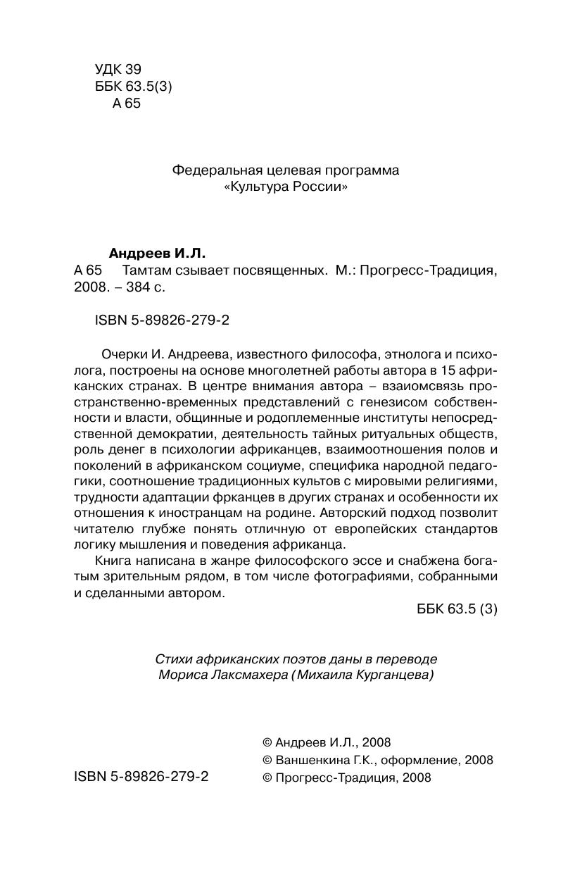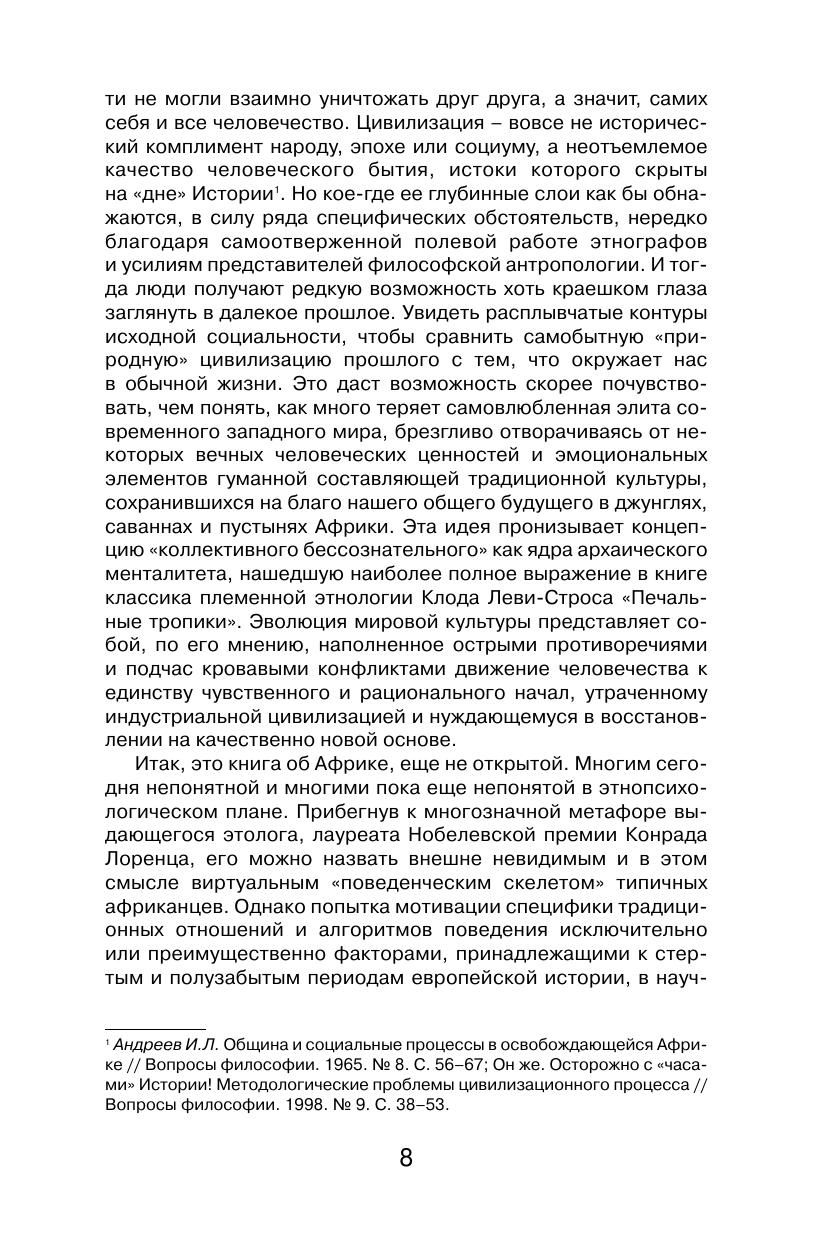 Очерки И. Андреева, известного философа, этнолога и психолога, построены на основе многолетней работы автора в 15 африканских странах. В центре внимания автора – взаимосвязь пространственно-временных представлений с генезисом собственности и власти, общинные и родоплеменные институты непосредственной демократии, деятельность тайных ритуальных обществ, роль денег в психологии африканцев, взаимоотношения полов и поколений в африканском социуме, специфика народной педагогики, соотношение традиционных культов с мировыми религиями, трудности адаптации африканцев в других странах и особенности их отношения к иностранцам на родине. Авторский подход позволит читателю глубже понять отличную от европейских стандартов логику мышления и поведения африканца.