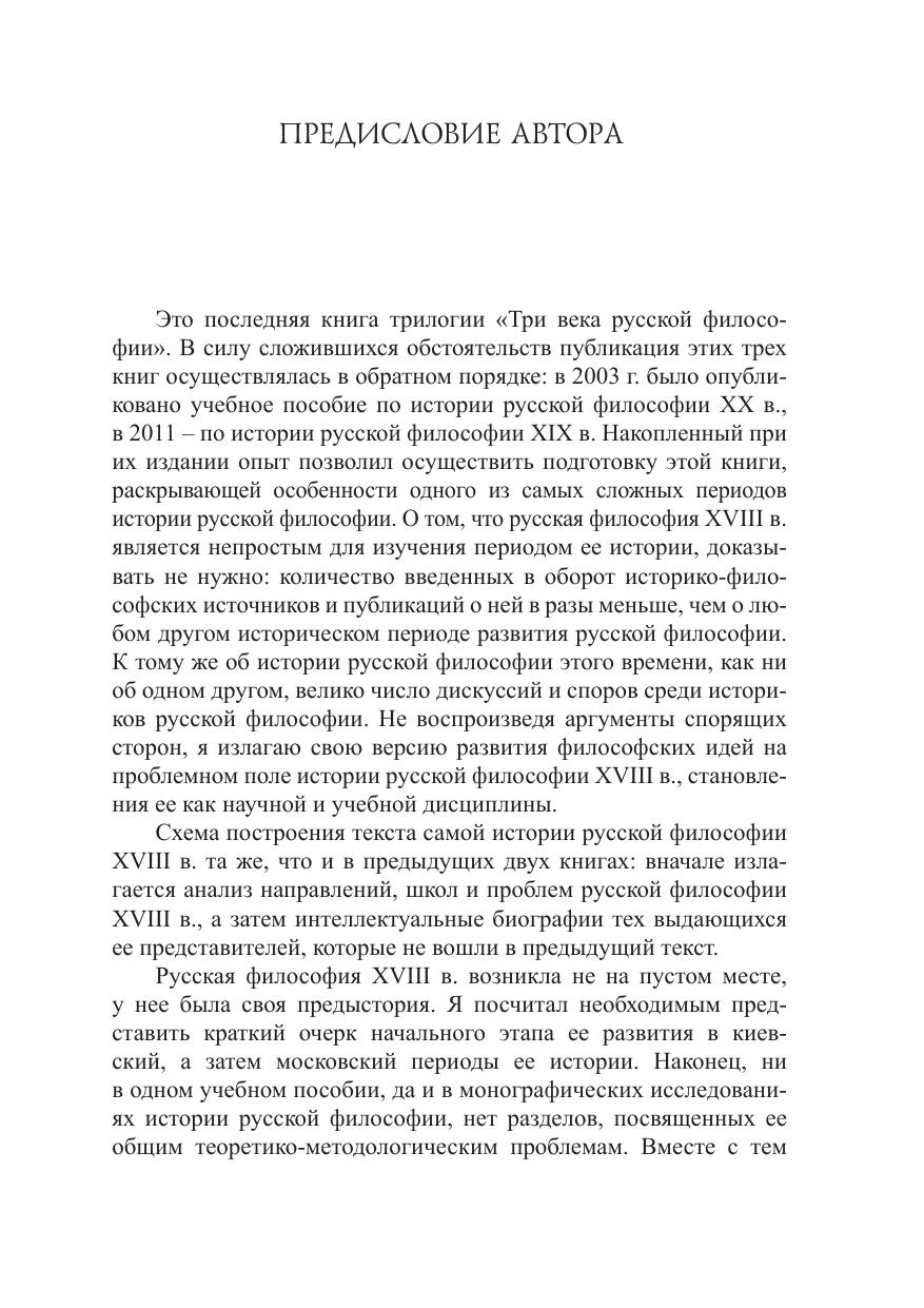 Анализируются различные аспекты содержания и развития русской философии XVIII в., выразившиеся в трудах и идеях ее школ и выдающихся представителей. Рассмотрена ее предыстория – русская средневековая философия XI–XVII вв. Книгу предваряет анализ общих проблем истории русской философии – ее национальных особенностей, источниковедения, историографии.