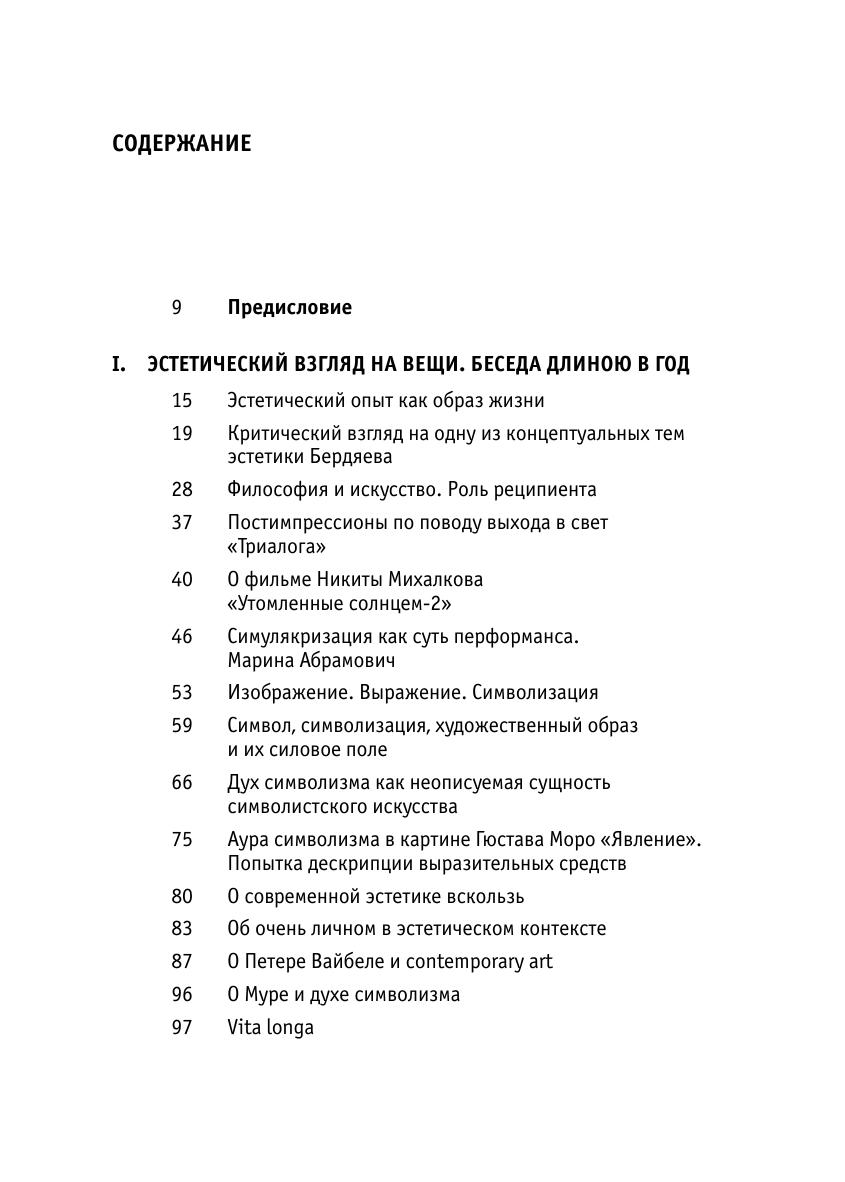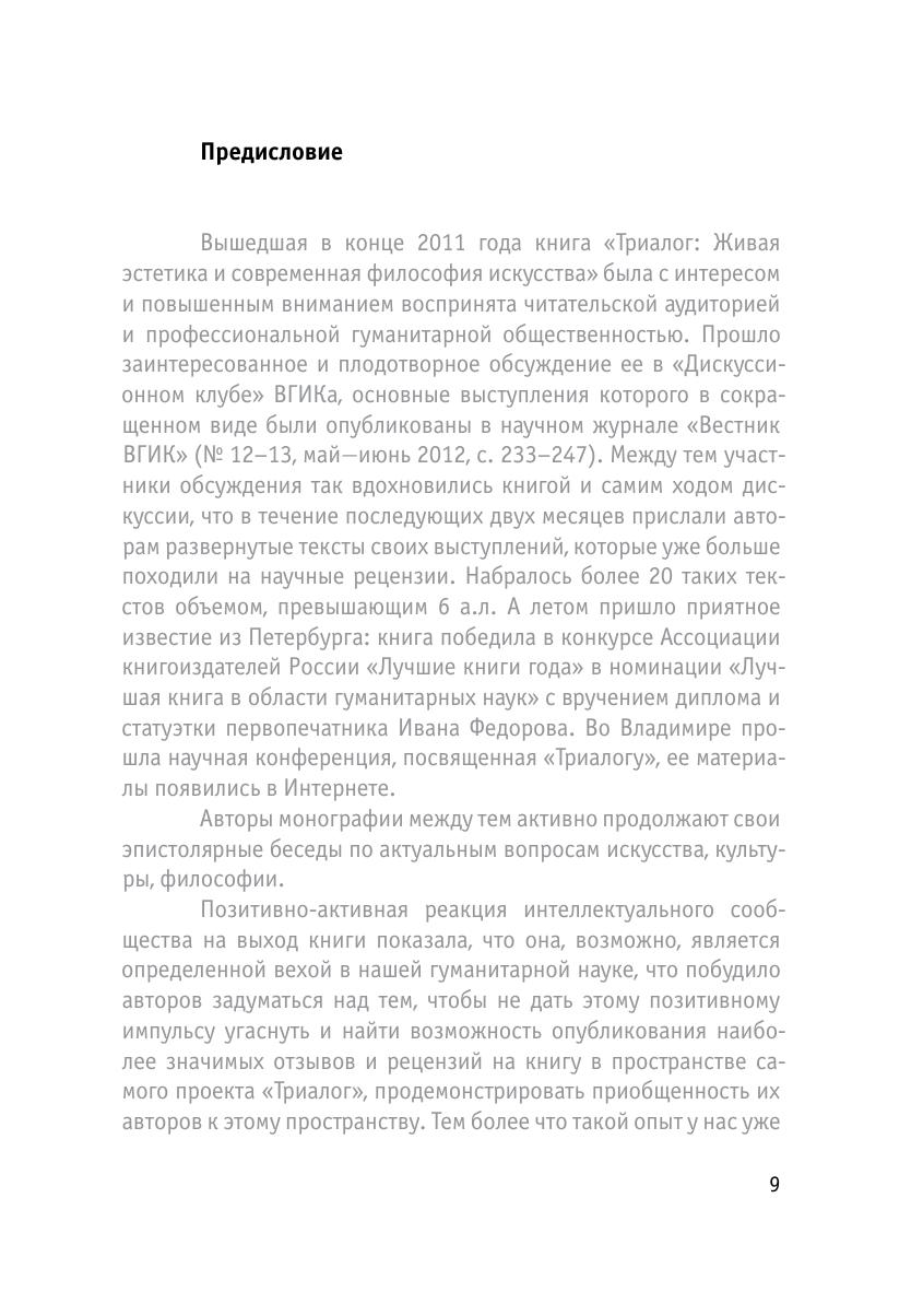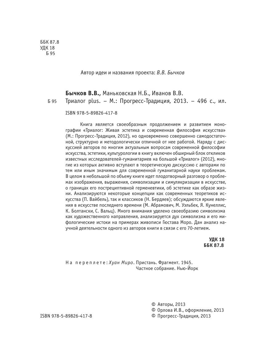 Книга является своеобразным продолжением и развитием монографии "Триалог: Живая эстетика и современная философия искусства" (М.: Прогресс-Традиция, 2012), но одновременно совершенно самодостаточной, структурно и методологически отличной от нее работой. Наряду с дискуссией авторов по многим актуальным вопросам современной философии искусства, эстетики, культурологии в книгу включен обширный блок откликов известных исследователей-гуманитариев на большой "Триалог" (2012), многие из которых активно вступают в теоретическую дискуссию с авторами по тем или иным значимым для современной гуманитарной науки проблемам. В целом в небольшой по объему книге идет плодотворный разговор о проблемах изображения, выражения, символизации и симулякризации в искусстве, о границах его пострециптивной герменевтики, об эстетике как образе жизни. Анализируются некоторые концепции как современных теоретиков искусства (П. Вайбель), так и классиков (Н. Бердяев); обсуждаются яркие явления в искусстве последнего времени (М. Абрамович, М. Уэльбек, Я. Кунеллис, К. Болтански, С. Вальц). Много внимания уделено своеобразию символизма как художественного направления, анализируется дух символизма и его мифологические истоки на примерах живописи Гюстава Моро. Дан анализ научной деятельности одного из авторов книги в связи с его 70-летием.