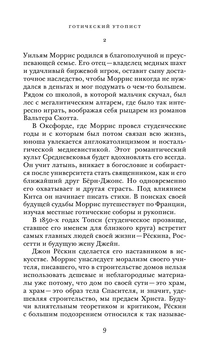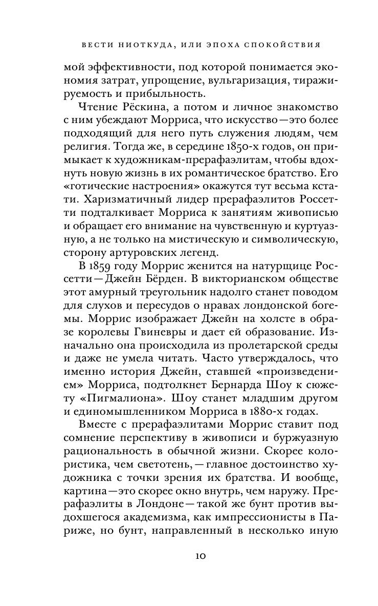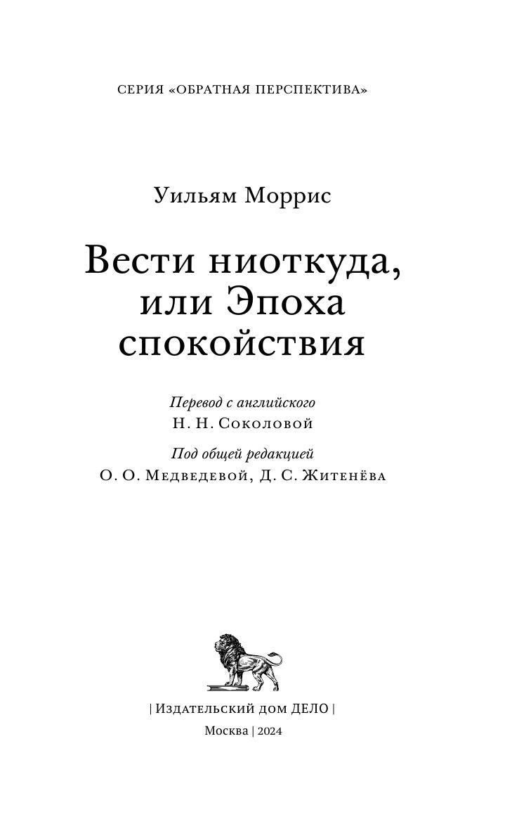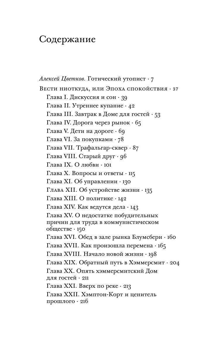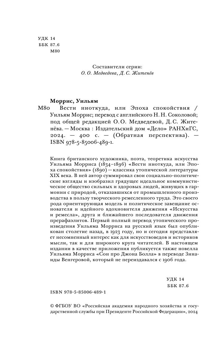 Книга британского художника, поэта, теоретика искусства Уильяма Морриса (1834–1896) «Вести ниоткуда, или Эпоха спокойствия» (1890) — классика утопической литературы XIX века. В ней автор суммировал свои социально-политические взгляды и изобразил грядущее идеальное коммунистическое общество сильных и здоровых людей, живущих в гармонии с природой, отказавшихся от промышленного производства в пользу творческого ремесленного труда. Это своего рода ориентирующая модель и политическое завещание основателя и идейного вдохновителя движения «Искусства и ремесла», друга и ближайшего последователя движения прерафаэлитов. Первый полный перевод утопического произведения Уильяма Морриса на русский язык был опубликован столетие назад, в 1923 году, но и сегодня представляет несомненный интерес как для искусствоведов и историков мысли, так и для широкого круга читателей. В настоящем издании в качестве приложения публикуется также новелла Уильяма Морриса «Сон про Джона Болла» в переводе Зинаиды Венгеровой, который не переиздавался с 1906 года.