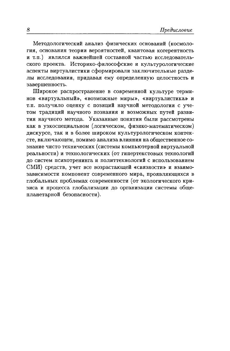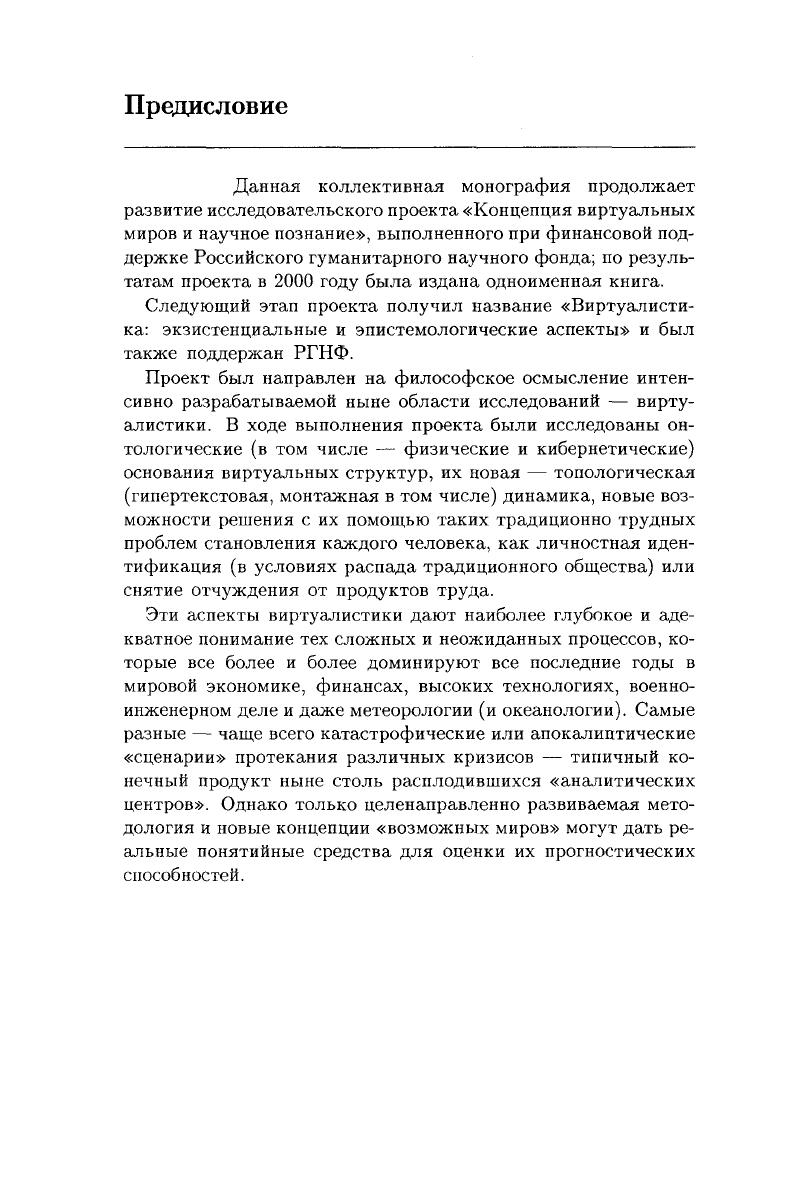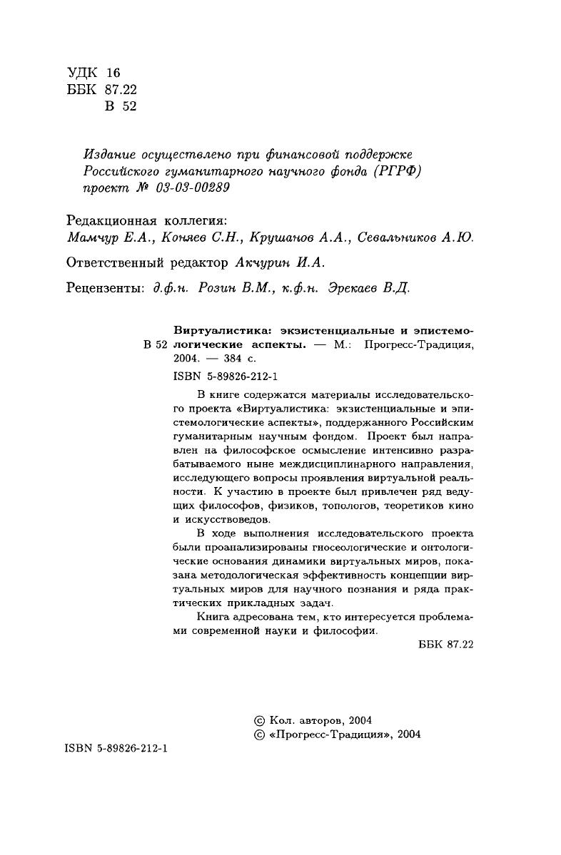 В книге содержатся материалы исследовательского проекта "Виртуалистика. Экзистенциальные и эпистемологические аспекты", поддержанного Российским гуманитарным научным фондом. Проект был направлен на философское осмысление интенсивно разрабатываемого ныне междисциплинарного направления, исследующего вопросы проявления виртуальной реальности. К участию в проекте был привлечен ряд ведущих философов, физиков, топологов, теоретиков кино и искусствоведов.
