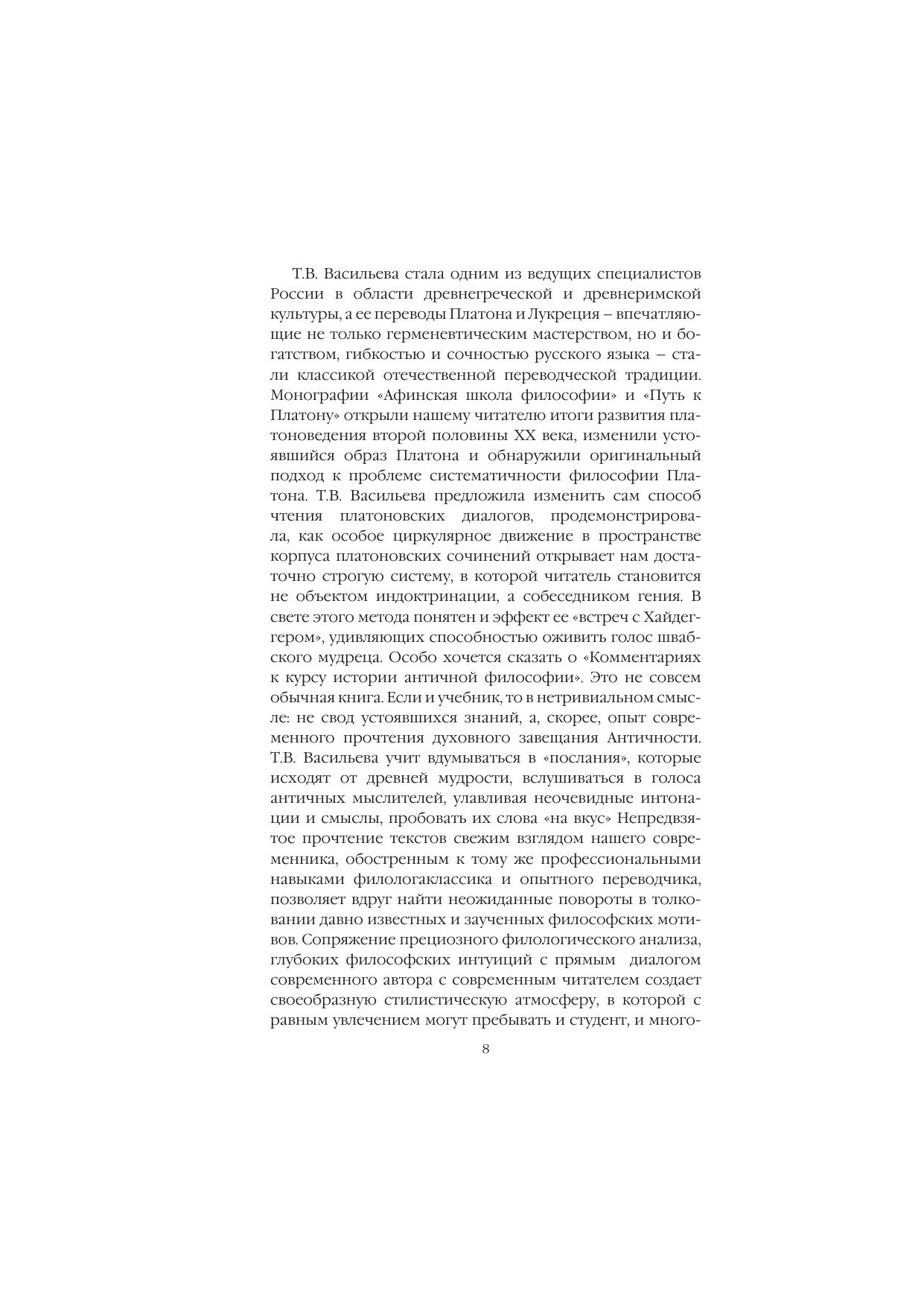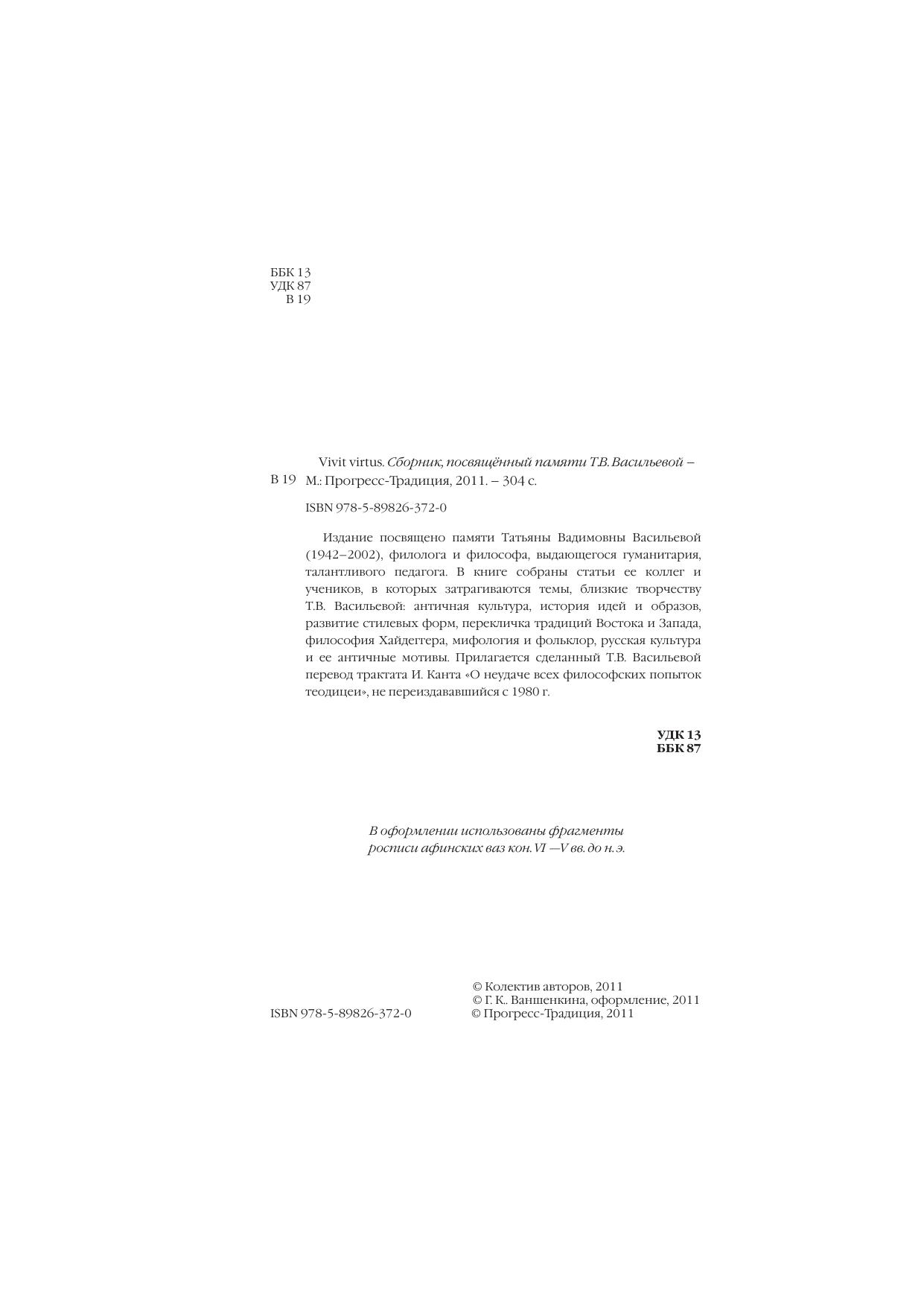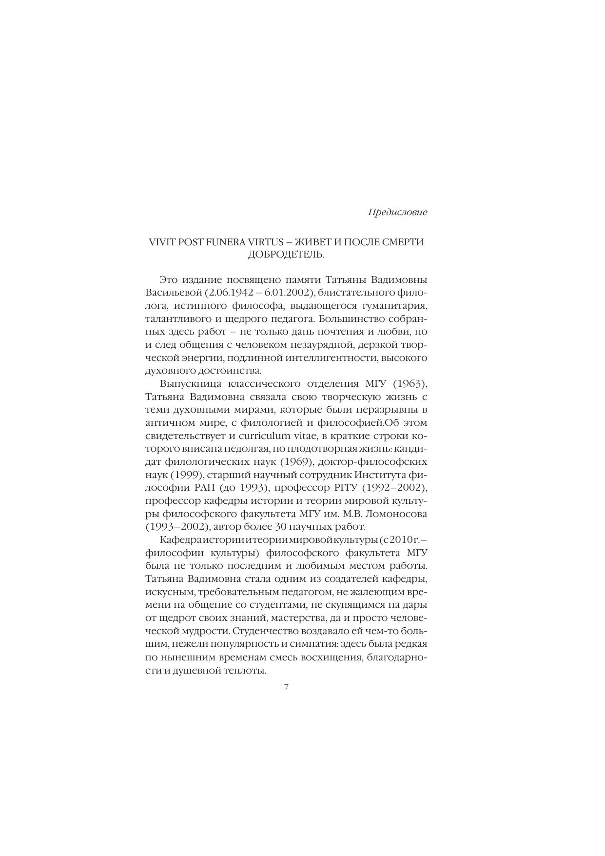 Издание посвящено памяти Татьяны Вадимовны Васильевой (1942–2002), филолога и философа, выдающегося гуманитария, талантливого педагога. В книге собраны статьи ее коллег и учеников, в которых затрагиваются темы, близкие творчеству Т.В. Васильевой: античная культура, история идей и образов, развитие стилевых форм, перекличка традиций Востока и Запада, философия Хайдеггера, мифология и фольклор, русская культура и ее античные мотивы. Прилагается сделанный Т.В. Васильевой перевод трактата И. Канта "О неудаче всех философских попыток теодицеи", не переиздававшийся с 1980 г.