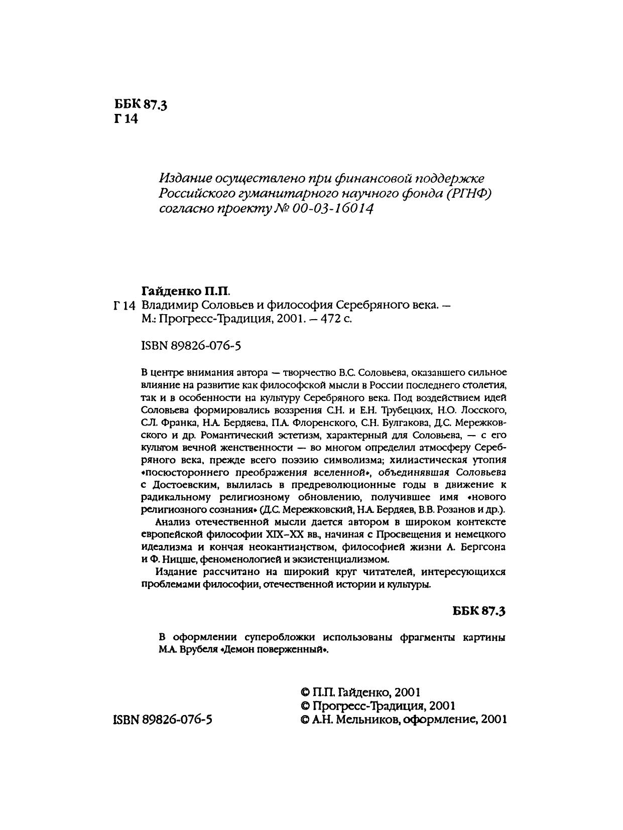 Книга посвящена исследованию русской религиозной философии конца XIX – начала XX вв. В центре внимания автора – творчество В.С. Соловьева, оказавшего сильное влияние на развитие как философской мысли в России последнего столетия, так и в особенности на культуру Серебряного века. Под воздействием идей Соловьева формировались воззрения С.Н. и Е.Н. Трубецких, Н.О. Лосского, С.Л. Франка, Н.А. Бердяева, П.А. Флоренского, С.Н. Булгакова, Д.С. Мережковского и др. Романтический эстетизм, характерный для Соловьева, с его культом вечной женственности, во многом определил атмосферу Серебряного века, прежде всего поэзию символизма; хилиастическая утопия "посюстороннего преображения вселенной", объединявшая Соловьева с Достоевским, вылилась в предреволюционные годы в движение к радикальному религиозному обновлению, получившее имя "нового религиозного сознания" (Д.С. Мережковский, Н.А. Бердяев, В.В. Розанов и др.).