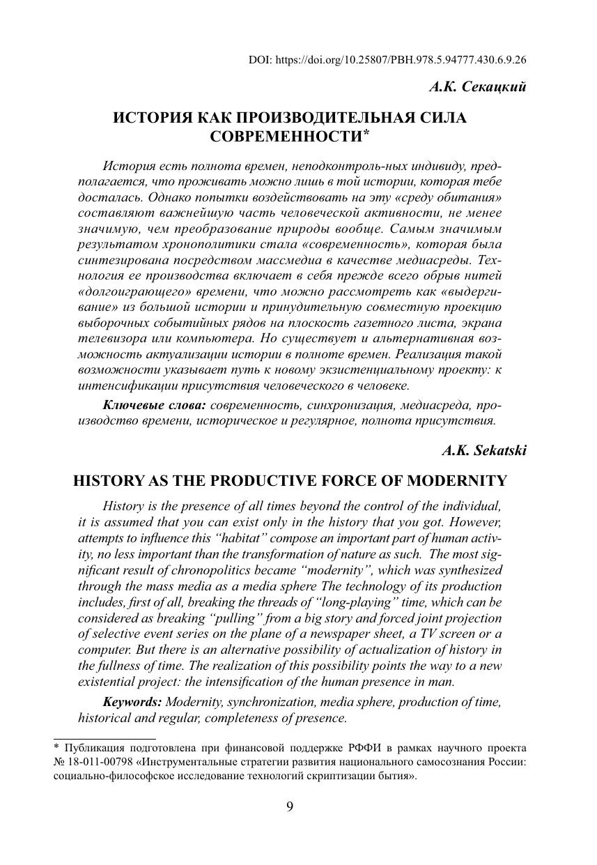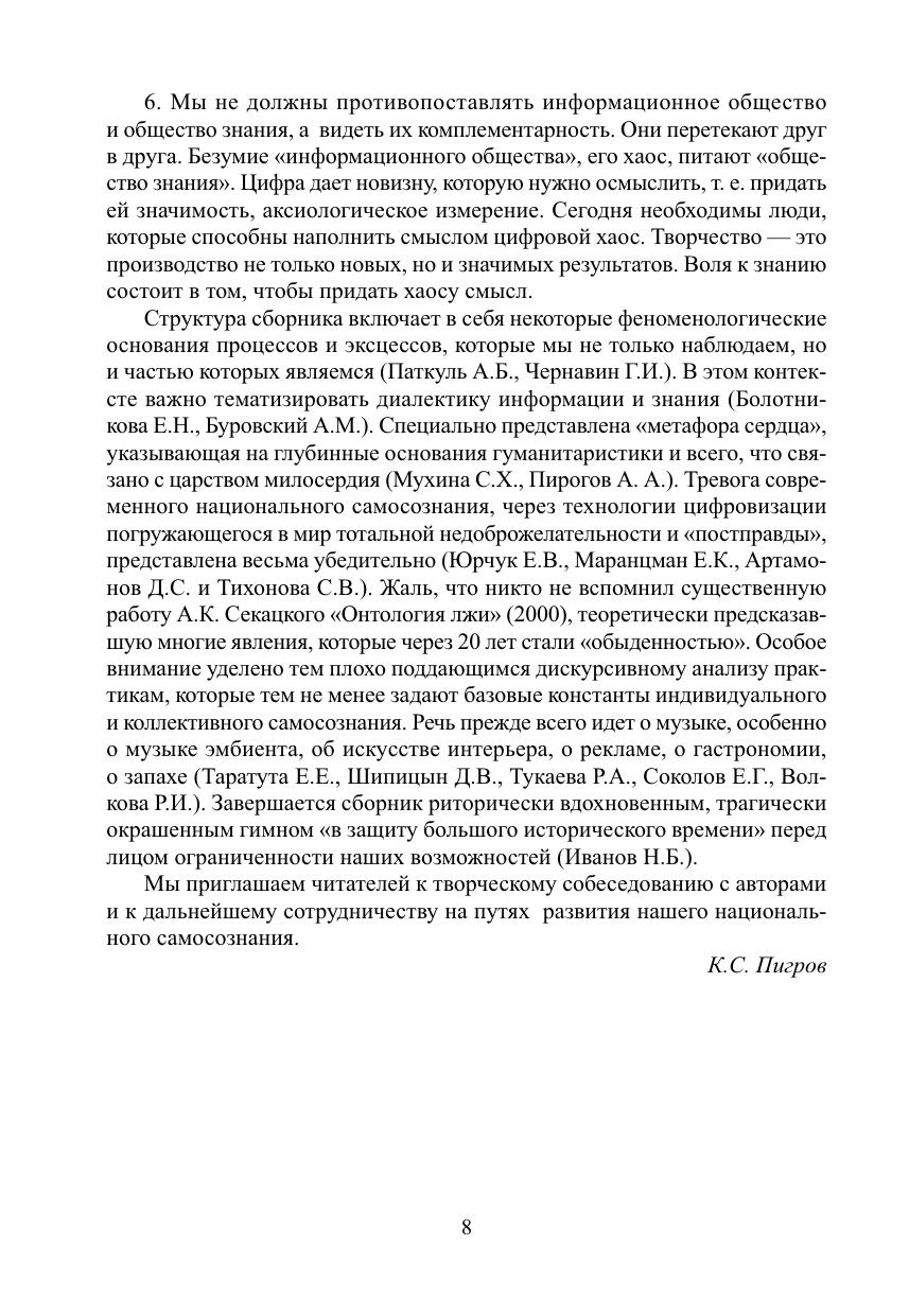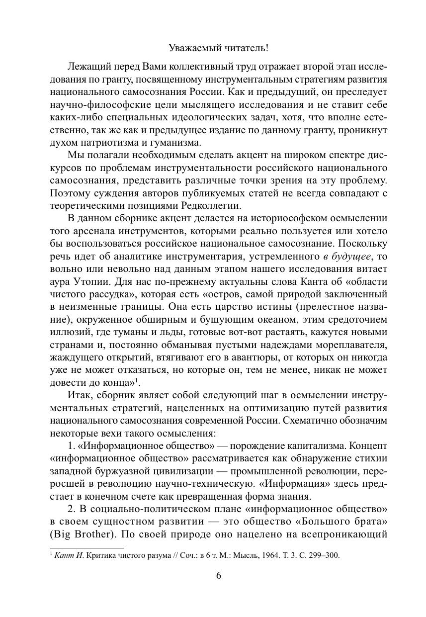 Коллективный труд отражает второй этап исследования по гранту, посвященному инструментальным стратегиям развития национального самосознания России. В сборнике представлен широкий спектр дискурсов российского национального самосознания. Акцент делается на историософском осмыслении того арсенала инструментальных стратегий, которыми реально пользуется или хотело бы воспользоваться российское национальное самосознание. Анализируются инструментальные стратегии, нацеленные на оптимизацию путей развития национального самосознания современной России. Подчеркивается причинная взаимосвязь информационного общества с западной цивилизацией и промышленной революцией, переросшей в революцию научно-техническую. Авторы обращают внимание на то, что традиция современного гуманитарного знания генеалогически восходит не к промышленной революции, а к «осевому времени», конституировавшему сам «абсолютный дух»: искусство, религию и философию. Авторы озабочены тем, что «цифровизация», стихия массовой коммуникации, подчас предстает как враг самосознания, самоуглубления, молчания, недеяния (у вэй), внутренней самодисциплины, тайны, т. е. тех достижений, которые были мучительно выстраданы в «осевое время» и в последующие эпохи, продолжавшие эту традицию. Сборник адресован философам, культурологам, политологам, педагогам, которые заинтересованы в историософском анализе происходящих в современном мире процессов и эксцессов.