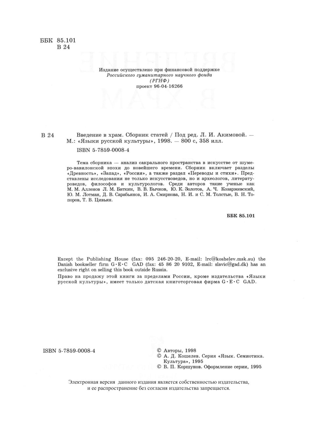 Тема сборника - анализ сакрального пространства в искусстве от шумеро-вавилонской эпохи до новейшего времени. Сборник включает разделы "Древность", "Запад", "Россия", а также раздел "Переводы и стихи". Представлены исследования не только искусствоведов, но и археологов, литературоведов, философов и культурологов. Среди авторов такие ученые как М. М. Алленов Л. М. Баткин, В. В. Бычков, Ю. К. Золотов, А. Ч. Козаржевский, Ю. М. Лотман, Д. В. Сарабьянов, И. А. Смирнова, Н. И. и С. М. Толстые, В. Н. Топоров, Т. В. Цивьян.