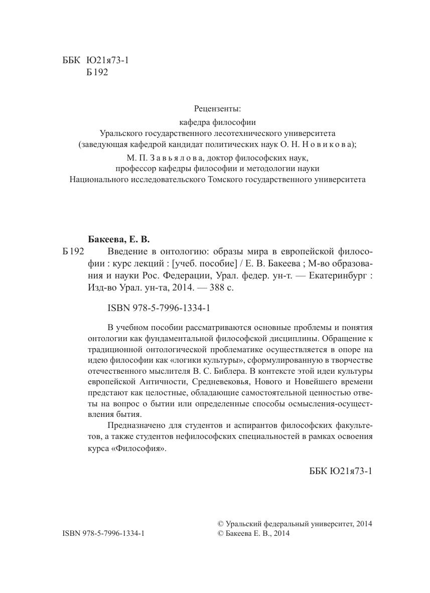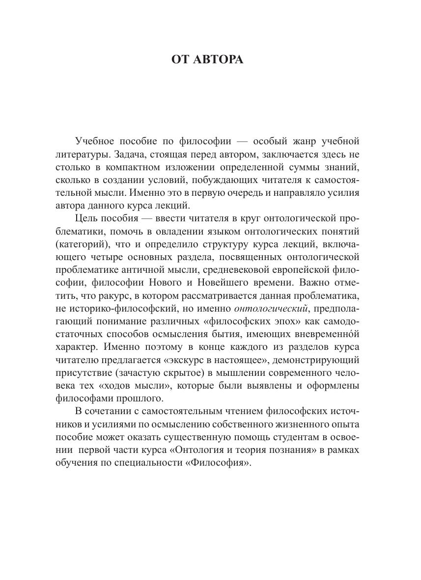 В учебном пособии рассматриваются основные проблемы и понятия онтологии как фундаментальной философской дисциплины. Обращение к традиционной онтологической проблематике осуществляется в опоре на идею философии как «логики культуры», сформулированную в творчестве отечественного мыслителя В. С . Б иблера. В контексте этой идеи культуры европейской Античности, Средневековья, Нового и Новейшего времени предстают как целостные, обладающие самостоятельной ценностью ответы на вопрос о бытии или определенные способы осмысления-осуществления бытия. Предназначено для студентов и аспирантов философских факультетов, а также студентов нефилософских специальностей в рамках освоения курса «Философия».