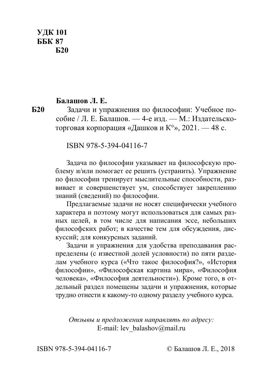 Задача по философии указывает на философскую проблему и/или помогает ее решить (устранить). Упражнение по философии тренирует мыслительные способности, развивает и совершенствует ум, способствует закреплению знаний (сведений) по философии. Предлагаемые задачи не носят специфически учебного характера и поэтому могут использоваться для самых разных целей, в том числе для написания эссе, небольших философских работ, в качестве тем для обсуждения, дискуссий, для конкурсных заданий. Задачи и упражнения для удобства преподавания распределены (с известной долей условности) по пяти разделам учебного курса («Что такое философия?», «История философии», «Философская картина мира», «Философия человека», «Философия деятельности»). Кроме того, в отдельный раздел помещены задачи и упражнения, которые трудно отнести к какому-то одному разделу учебного курса.