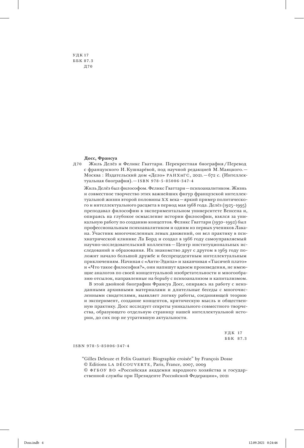 В этой двойной биографии Франсуа Досс, опираясь на работу с неизданными архивными материалами и длительные беседы с многочисленными свидетелями, выявляет логику работы, соединяющей теорию и эксперимент, создание концептов, критическую мысль и общественную практику. Досс исследует секреты уникального совместного творчества, образующего отдельную страницу нашей интеллектуальной истории, до сих пор не утратившую актуальности.