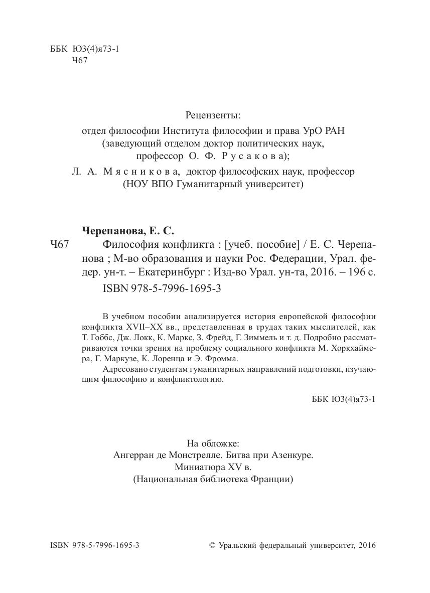 В учебном пособии анализируется история европейской философии конфликта XVII–XX вв., представленная в трудах таких мыслителей, как Т. Гоббс, Дж. Локк, К. Маркс, З. Фрейд, Г. Зиммель и т. д. Подробно рассматриваются точки зрения на проблему социального конфликта М. Хоркхаймера, Г. Маркузе, К. Лоренца и Э. Фромма. Адресовано студентам гуманитарных направлений подготовки, изучающим философию и конфликтологию.