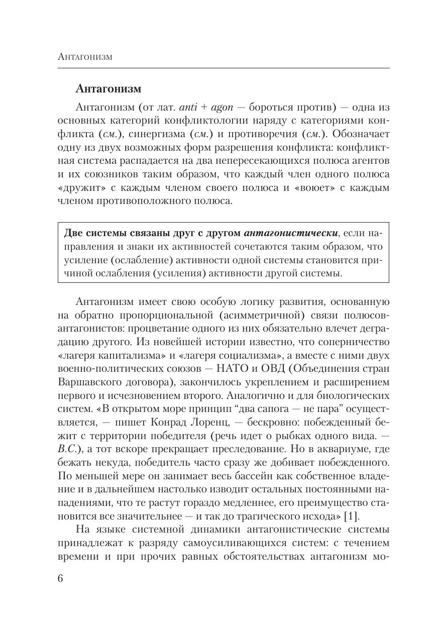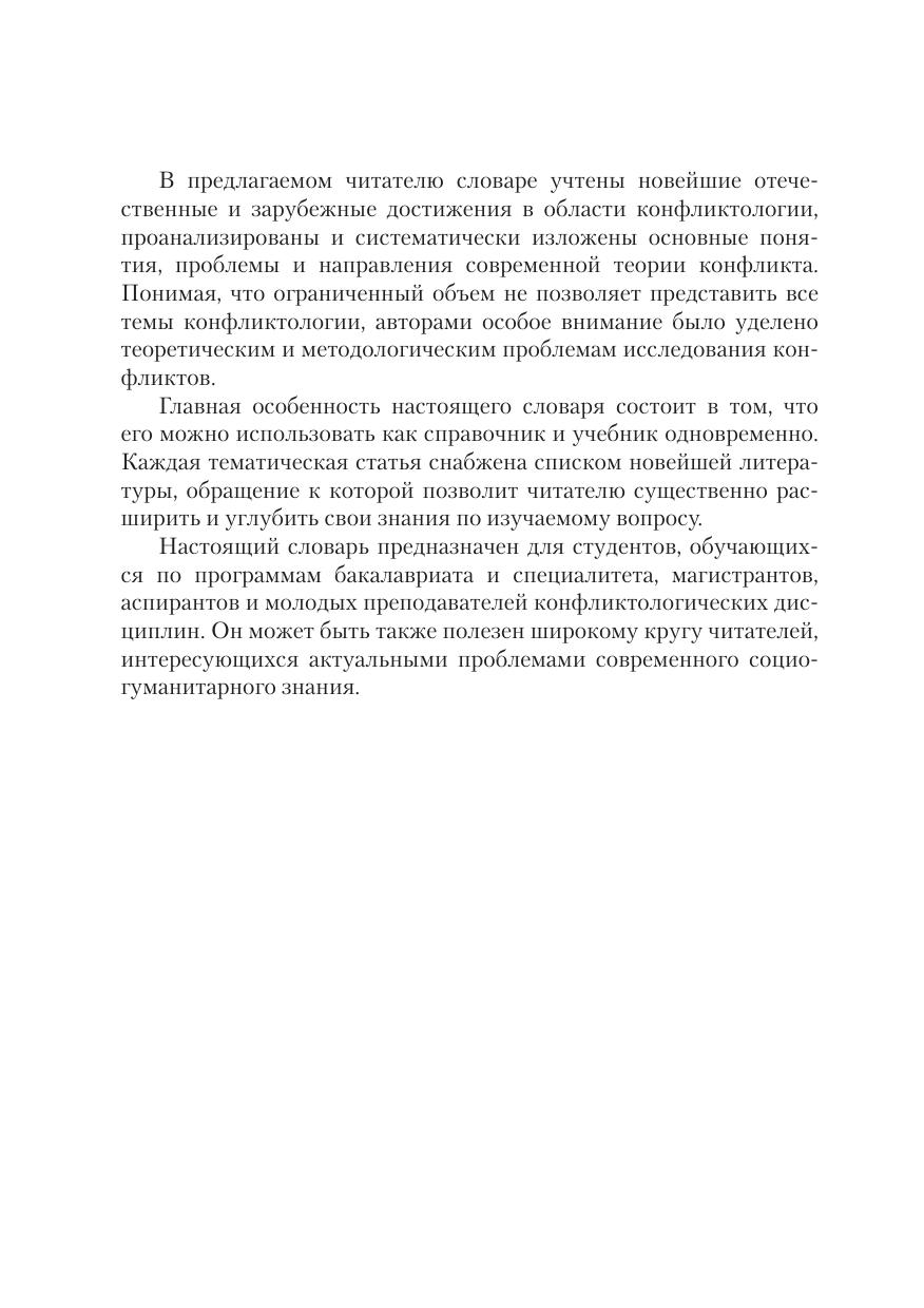 Основная проблема современной конфликтологии в том, что она до сих пор не является самостоятельной наукой. Ее понятийный аппарат, методы и даже проблемы заимствованы из смежных наук. Настоящий словарь призван доказать возможность развития конфликтологии как полноценной науки. Авторский коллектив, озабоченный низким качеством преподавания конфликтологии, представляет на суд читателей новую модель словаря по конфликтологии. Его главная особенность – научность и оригинальность всех статей. Авторы стремились отразить новейшие достижения конфликтологии в том объеме, который принят в рамках данного формата.