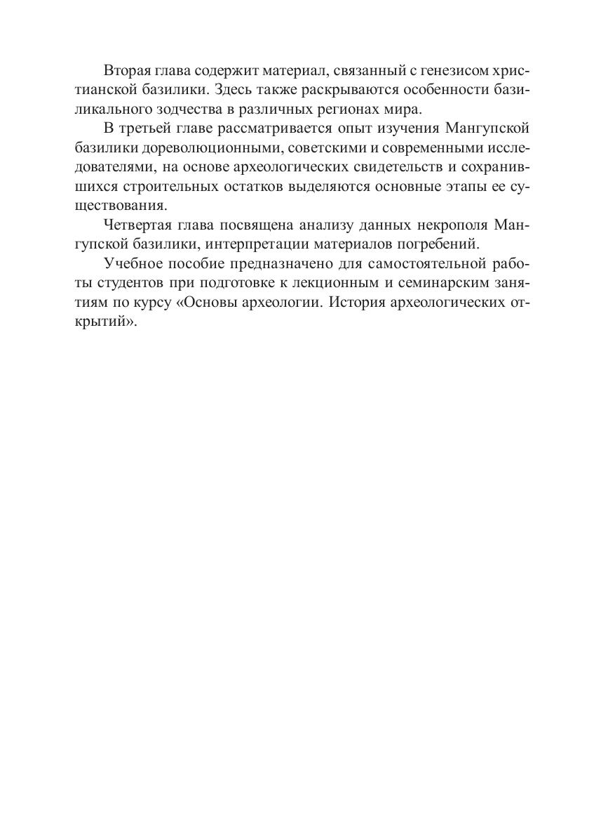 В учебном пособии раскрываются особенности археологического изучения светских и христианских базилик Античности и Средневековья. Особое внимание уделено рассмотрению Мангупской базилики – храма, расположенного в горном Крыму. Для студентов, изучающих основы археологии, историю археологических открытий, а также для преподавателей высших учебных заведений, археологов, историков, искусствоведов, культурологов и священнослужителей.