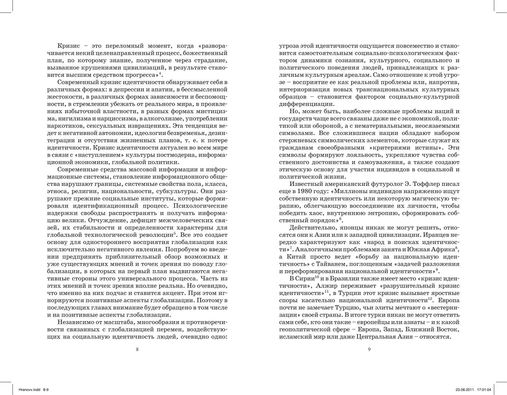 Авторами рассматриваются теоретические аспекты цивилизационной идентичности (своеобразие цивилизационного подхода в гуманитарных исследованиях, типы коллективной идентичности, структура цивилизационной идентичности, менталитет и глобалитет как разные аспекты цивилизационной идентичности) и проблемы цивилизационной идентичности в исторической динамике (трансформация коллективных идентичностей в индустриальную и постиндустриальную эпохи, роль идеологии и социальной психологии в трансформации цивилизационной идентичности, тоталитаризм как ответ на кризис цивилизационной идентичности в ХХ в., субкультурная стратификация в эпоху глобализации). Особое место в монографии занимает обсуждение проблем цивилизационной идентичности России (Россия как тип цивилизации, этногенез российской цивилизационной идентичности, роль российского природного и культурного наследия в становлении цивилизационной идентичности России, динамика цивилизационной идентичности России, евроидентичность и глобалитет России).