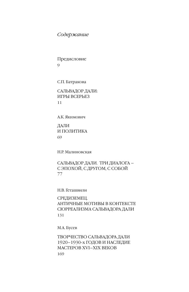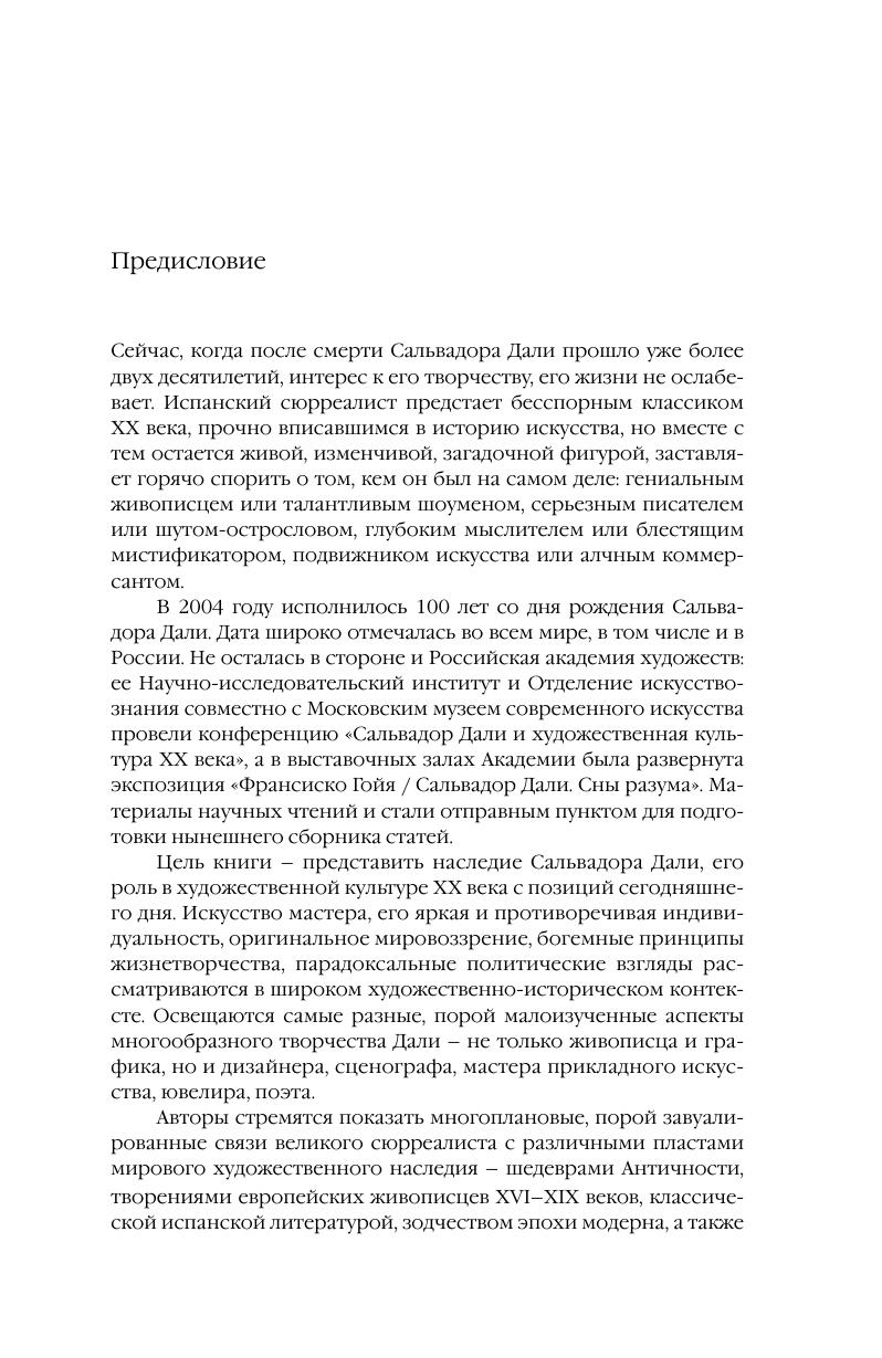 Искусство Сальвадора Дали, его роль в художественной культуре ХХ века рассматриваются в широком художественно-историческом контексте. Анализируются различные аспекты многообразного творчества испанского сюрреалиста – не только живописца и графика, но и дизайнера, сценографа, мастера прикладного искусства, ювелира, поэта. Показаны связи Дали с различными пластами мирового художественного наследия, а также с архитектурой, театром, фотографией. Раскрывается тема влияния испанского мастера на творческие поиски некоторых российских живописцев. Книга предназначена для специалистов и широкого круга читателей.
