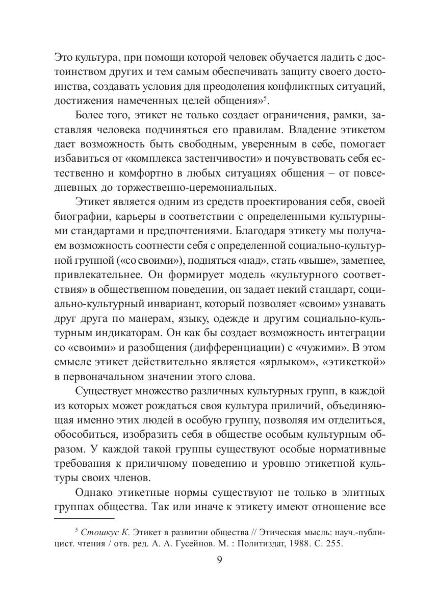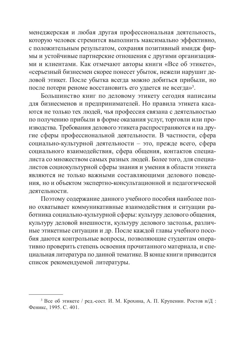 Учебное пособие знакомит читателей с основными принципами современного делового этикета и правилами поведения в различных ситуациях общения: как завязать и поддержать деловые и светские беседы, как одеться на презентацию, как не испугаться разнообразия столовых приборов на банкете, как не ошибиться в выборе подарков, кто платит и кто уходит первым, а также многими другими вопросами, знание которых помогает производить благоприятное впечатление в обществе и добиваться успеха в деловой сфере. Для студентов, обучающихся по направлениям «Культурология», «Социально-культурная деятельность».