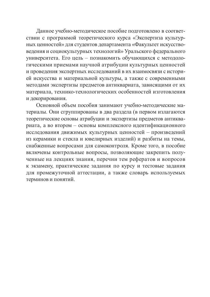 Учебно-методическое пособие посвящено комплексному рассмотрению вопросов атрибуции и экспертизы культурных ценностей. Особое внимание уделено методологии атрибуции, развитию и совершенствованию технологий экспертных исследований применительно к произведениям из керамики и стекла и к ювелирным изделиям.