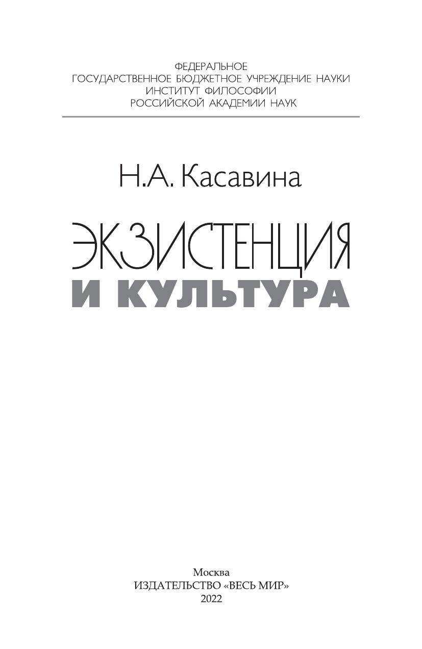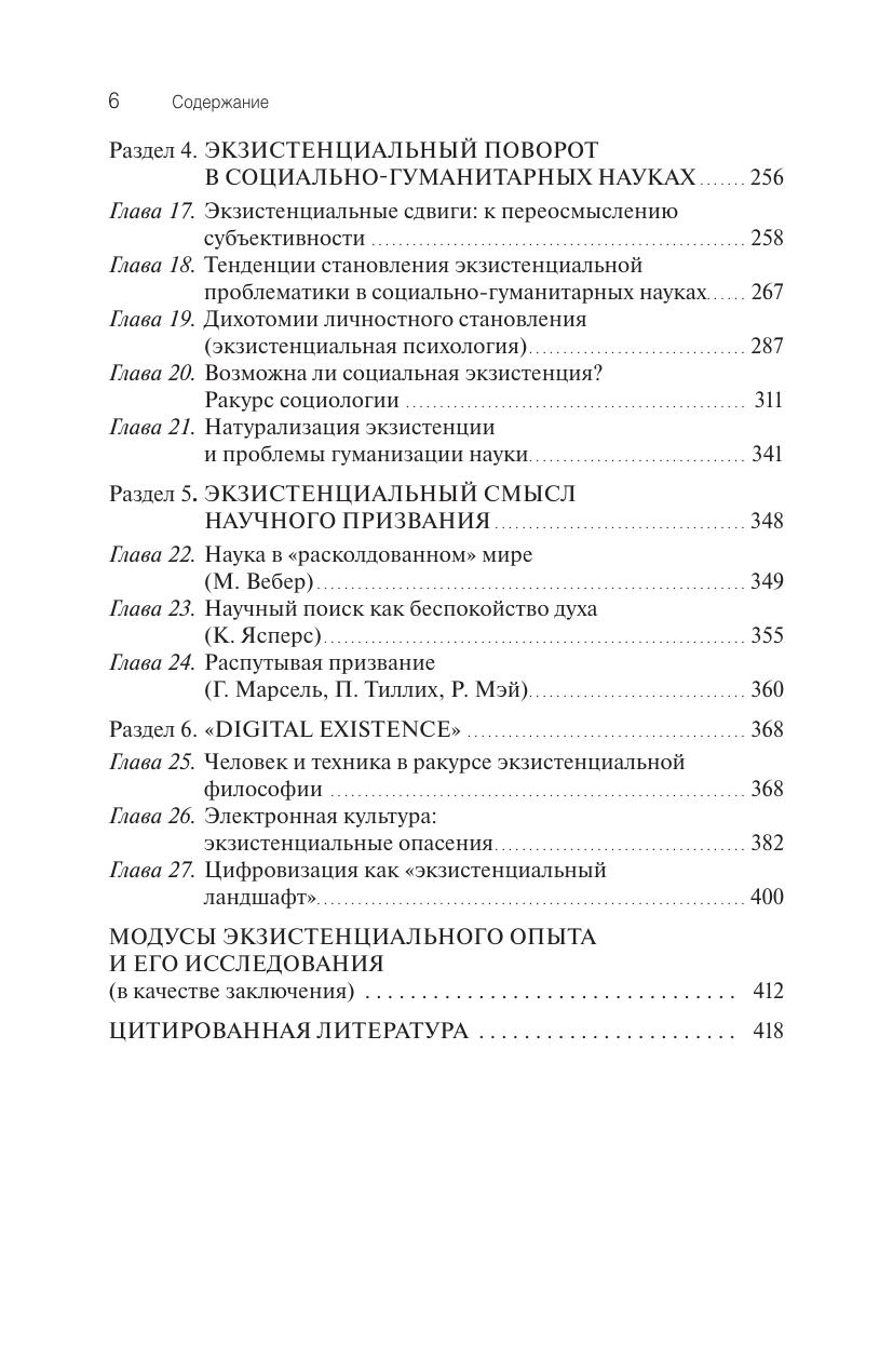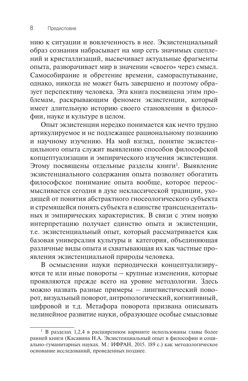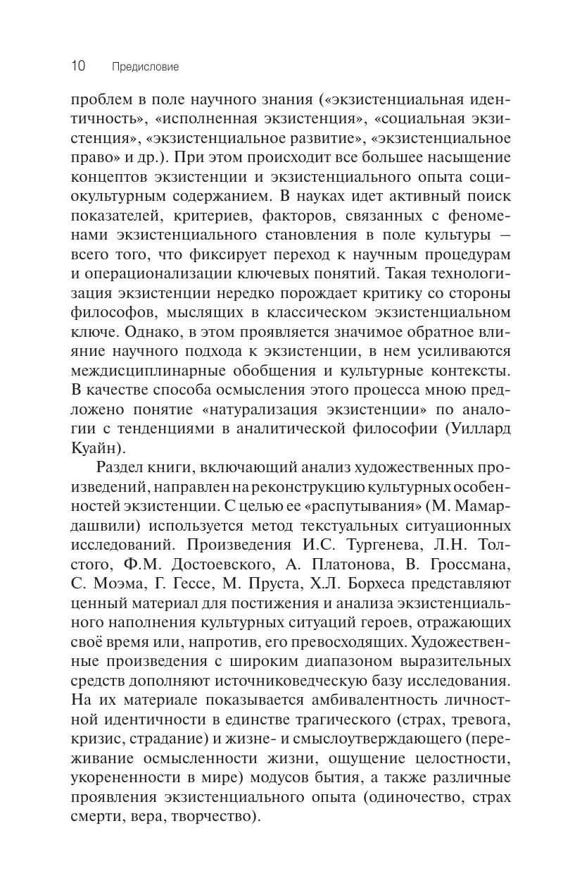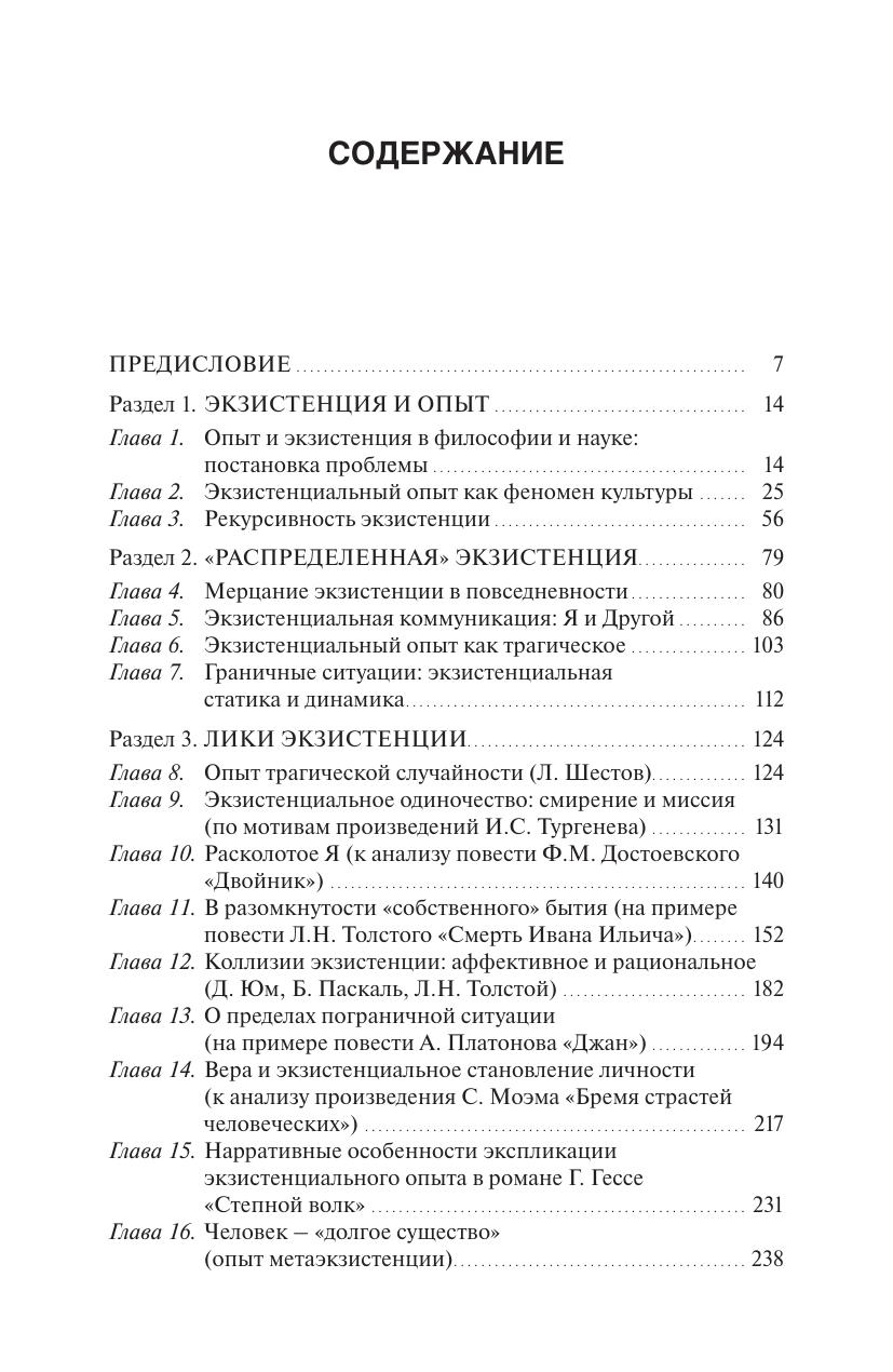 Книга посвящена исследованию феномена экзистенции как сферы переживания человеком собственной ситуации в мире, пограничности существования, самопонимания субъекта и его самоопределения по отношению к смыслам и ценностям культуры. Культура предстает как пространство конструирования личностью своего бытия, его субъектный горизонт, в котором разворачивается личная история. Экзистенциальный опыт понимается как основа концептуализации непрерывности жизненного пути, имеющая рекурсивную природу. Предлагается трактовка влияния экзистенциализма на современную культуру, в центре которого – поворот социально- гуманитарных наук к смысложизненным составляющим человеческого бытия. Реконструкция культурных особенностей экзистенции дополнена обращением к произведениям мировой художественной литературы. Результаты исследования позволяют расширить горизонт философии науки и культуры, включив в него значительный пласт тематики, связанной с проблемой экзистенциального опыта.