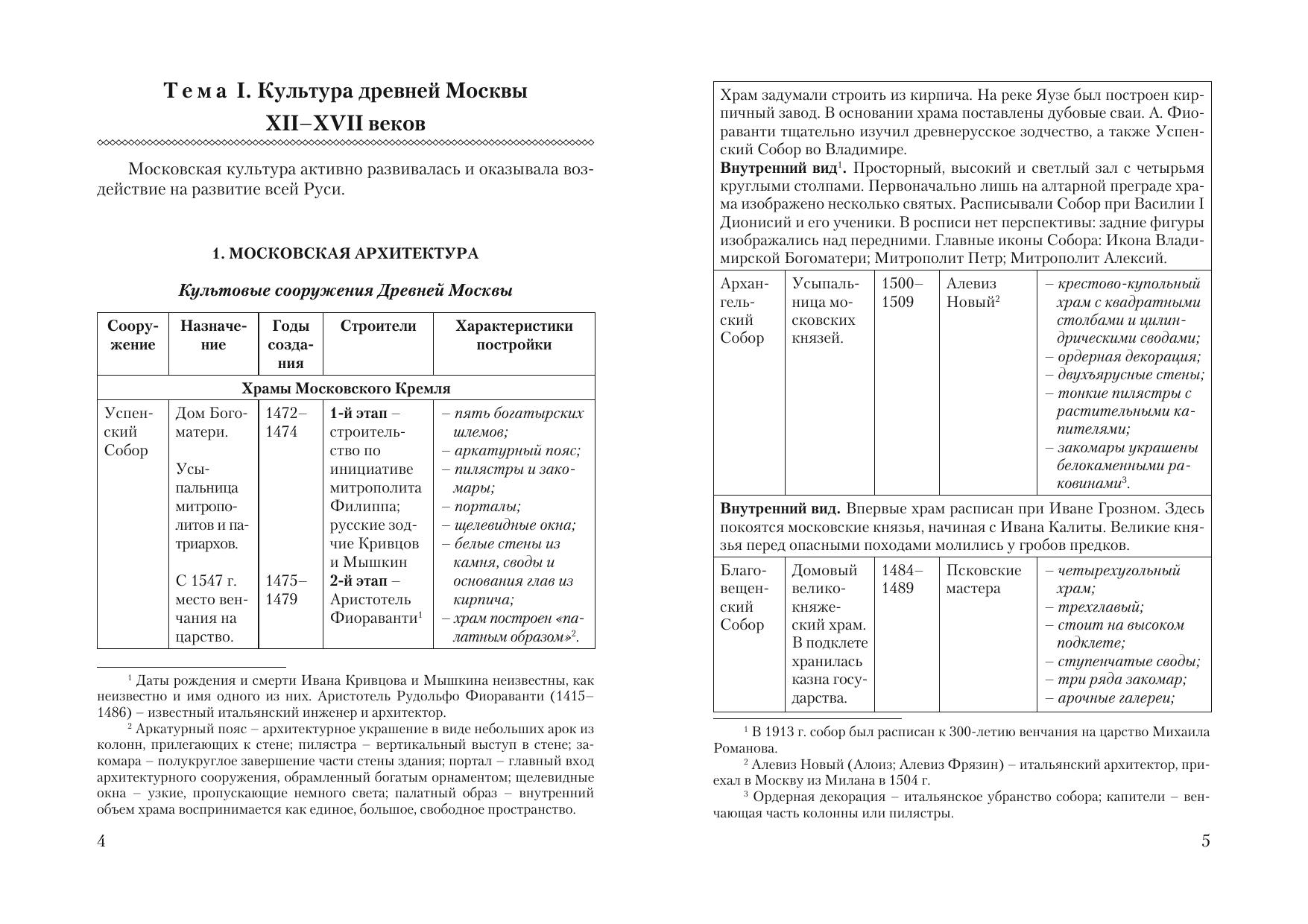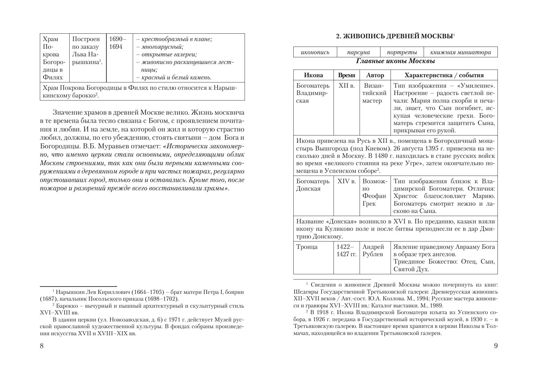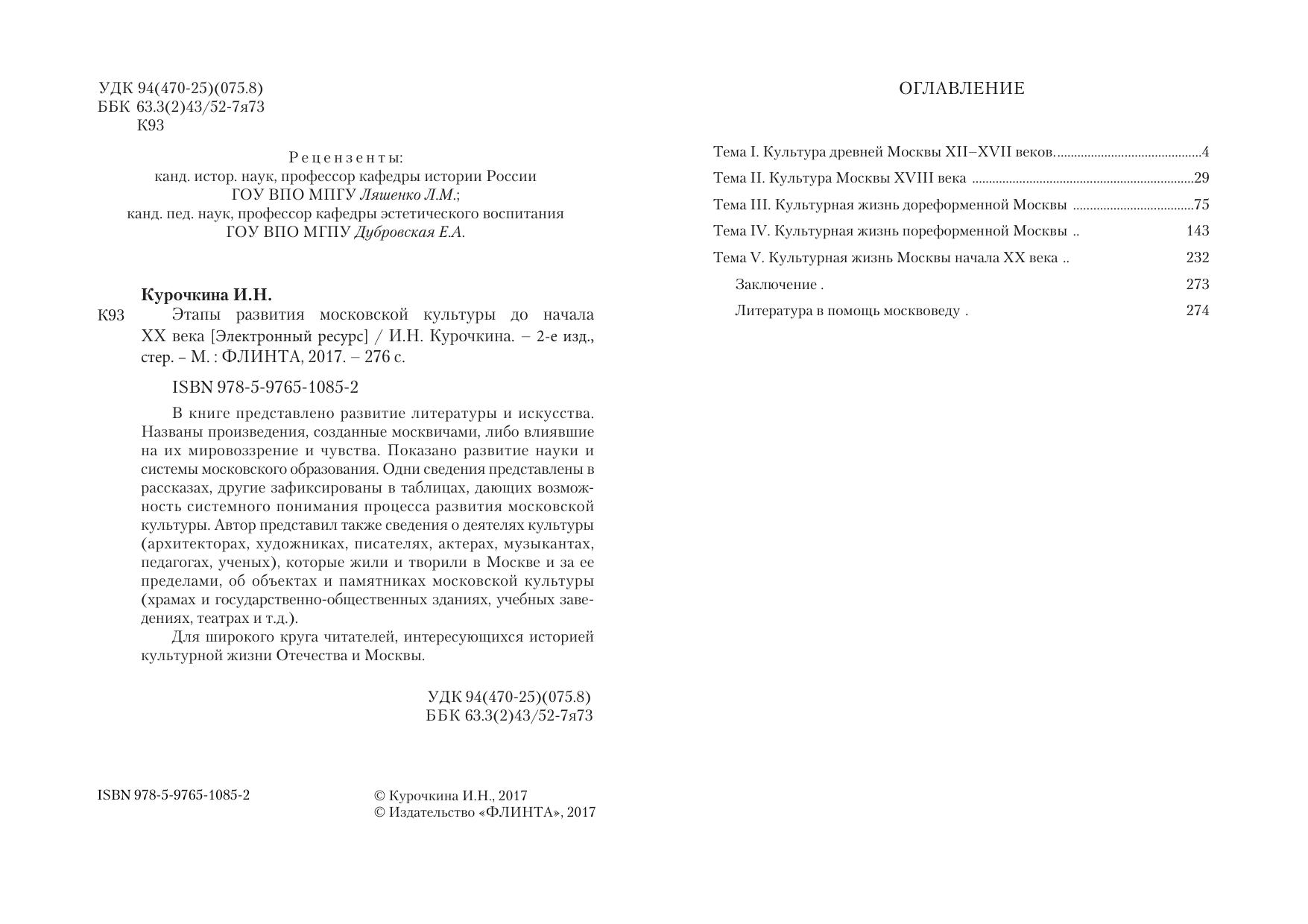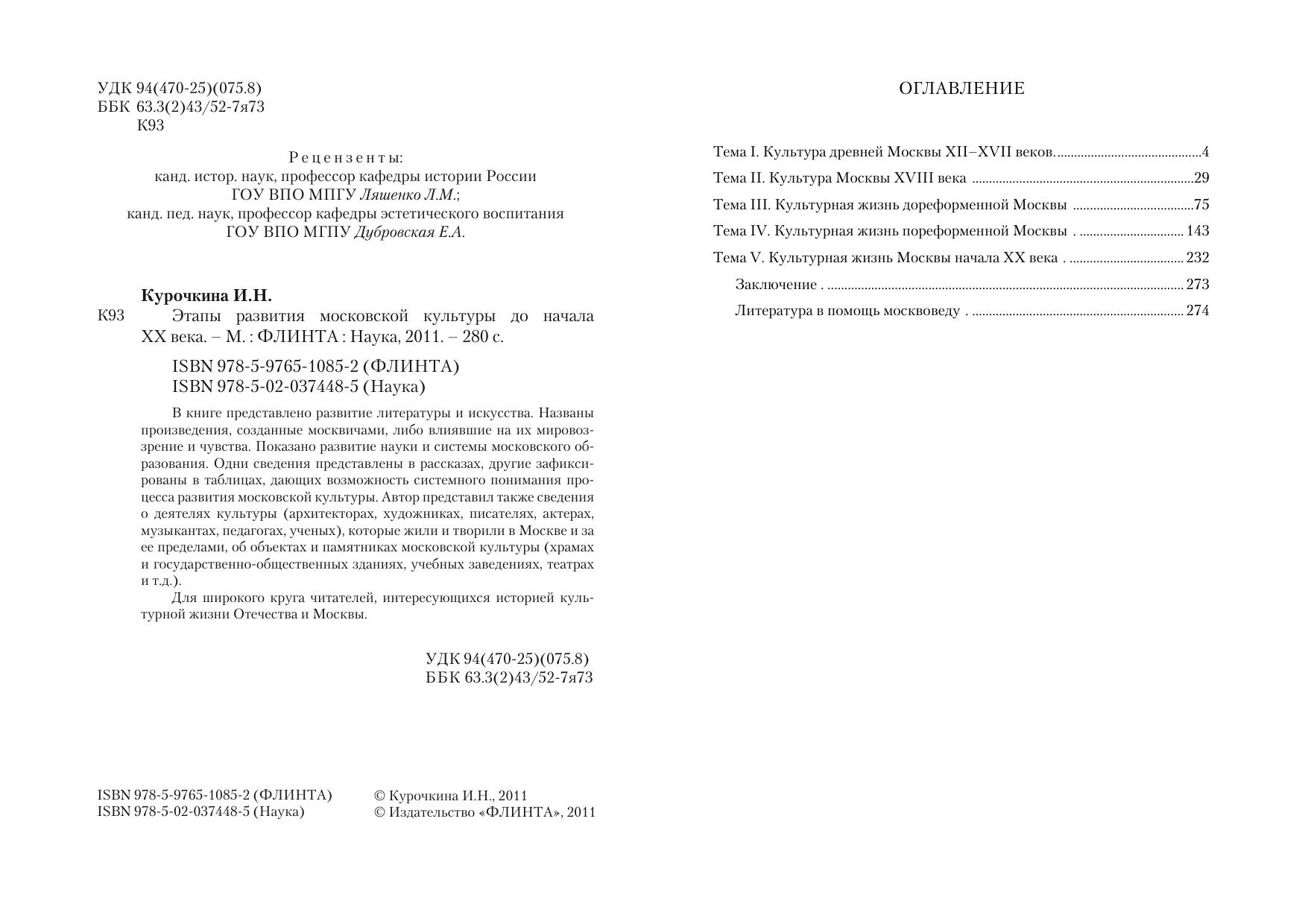 В книге представлено развитие литературы и искусства. Названы произведения, созданные москвичами, либо влиявшие на их мировоззрение и чувства. Показано развитие науки и системы московского образования. Одни сведения представлены в рассказах, другие зафиксированы в таблицах, дающих возможность системного понимания процесса развития московской культуры. Автор представил также сведения о деятелях культуры (архитекторах, художниках, писателях, актерах, музыкантах, педагогах, ученых), которые жили и творили в Москве и за ее пределами, об объектах и памятниках московской культуры (храмах и государственно-общественных зданиях, учебных заведениях, театрах и т.д.).