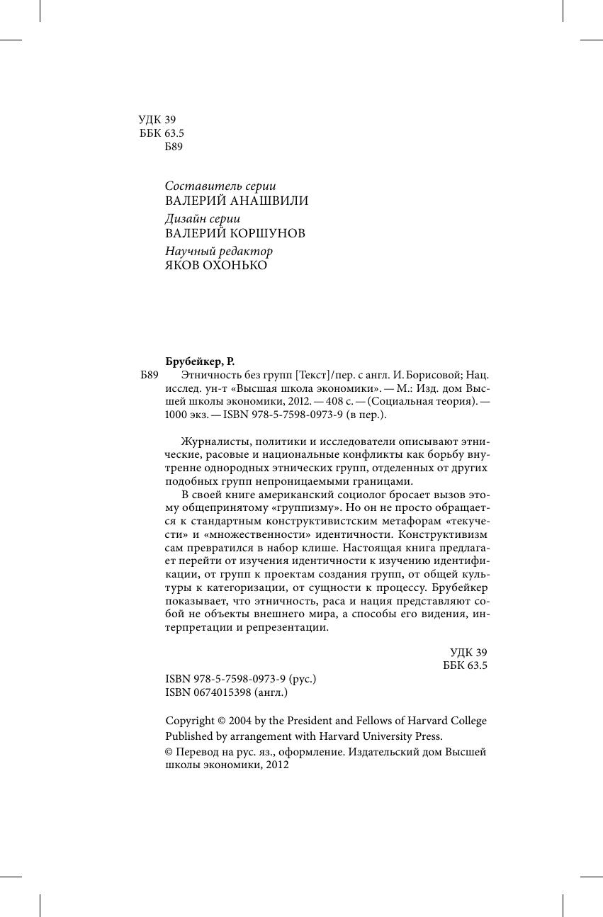Журналисты, политики и исследователи описывают этнические, расовые и национальные конфликты как борьбу внутренне однородных этнических групп, отделенных от других подобных групп непроницаемыми границами. В своей книге американский социолог бросает вызов этому общепринятому «группизму». Но он не просто обращается к стандартным конструктивистским метафорам «текучести» и «множественности» идентичности. Конструктивизм сам превратился в набор клише. Настоящая книга предлагает перейти от изучения идентичности к изучению идентификации, от групп к проектам создания групп, от общей культуры к категоризации, от сущности к процессу. Брубейкер показывает, что этничность, раса и нация представляют собой не объекты внешнего мира, а способы его видения, интерпретации и репрезентации.