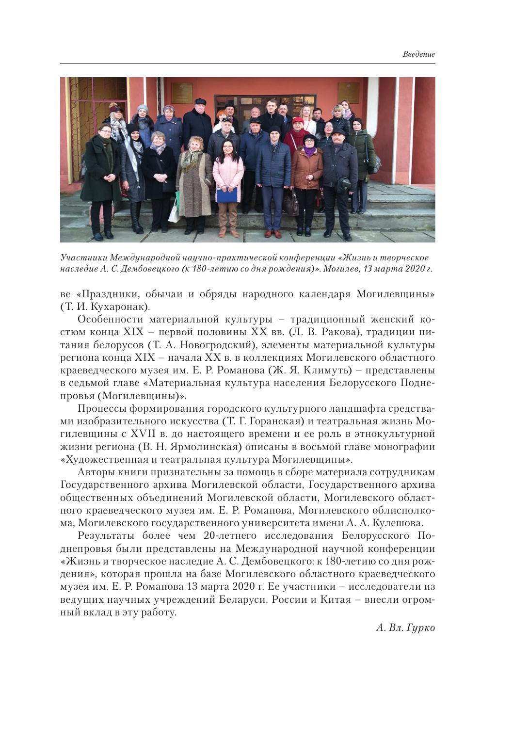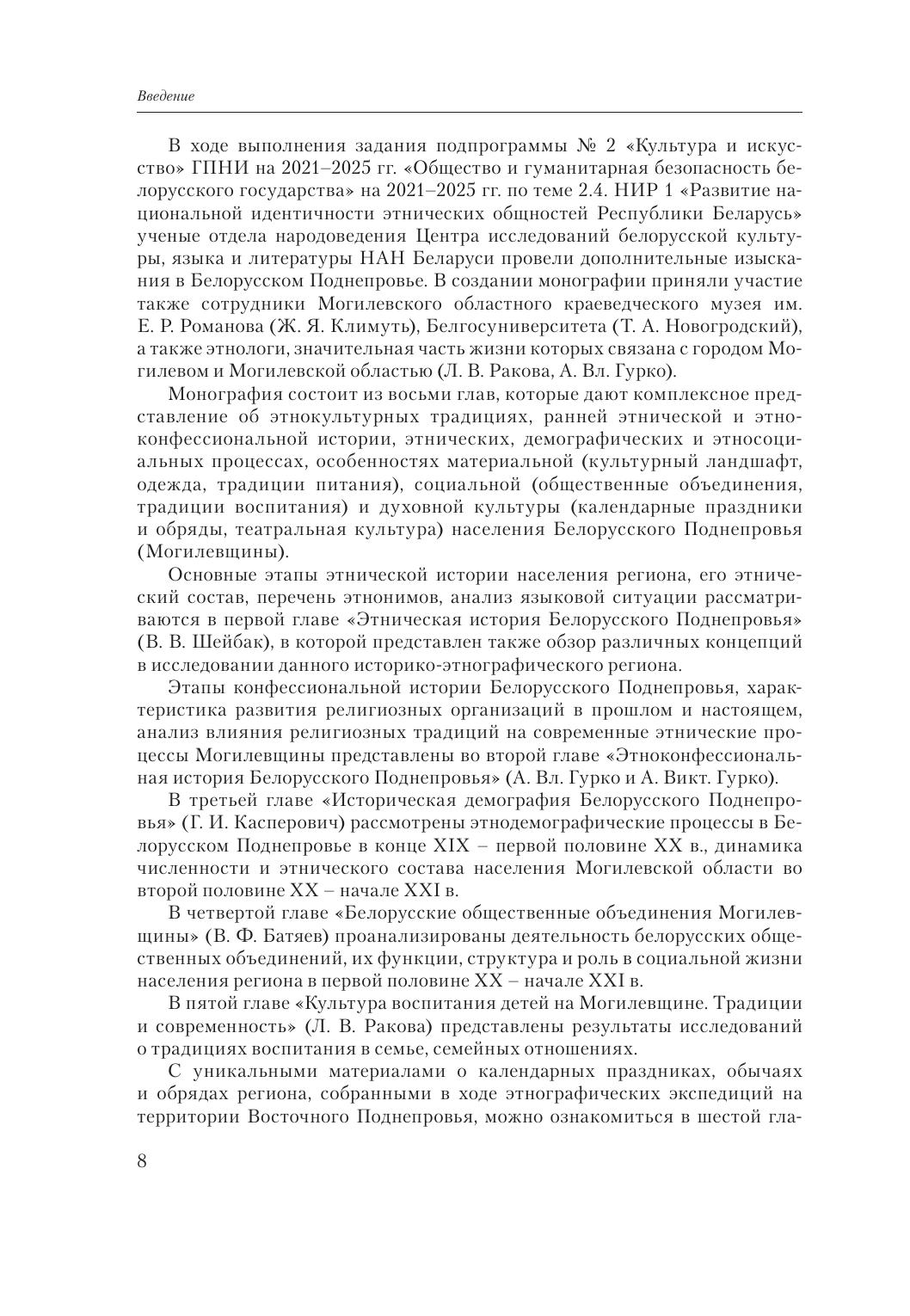Коллективная работа белорусских этнологов дает комплексное представление об этнической истории и традициях, особенностях материальной (жилище, одежда, традиции питания), социальной (семейные отношения, общественные объединения) и духовной культуры (этноконфессиональная структура, календарные праздники и обряды, театральная культура) населения Могилевщины. Впервые в научный оборот вводятся материалы полевых этнографических исследований, архивные источники.