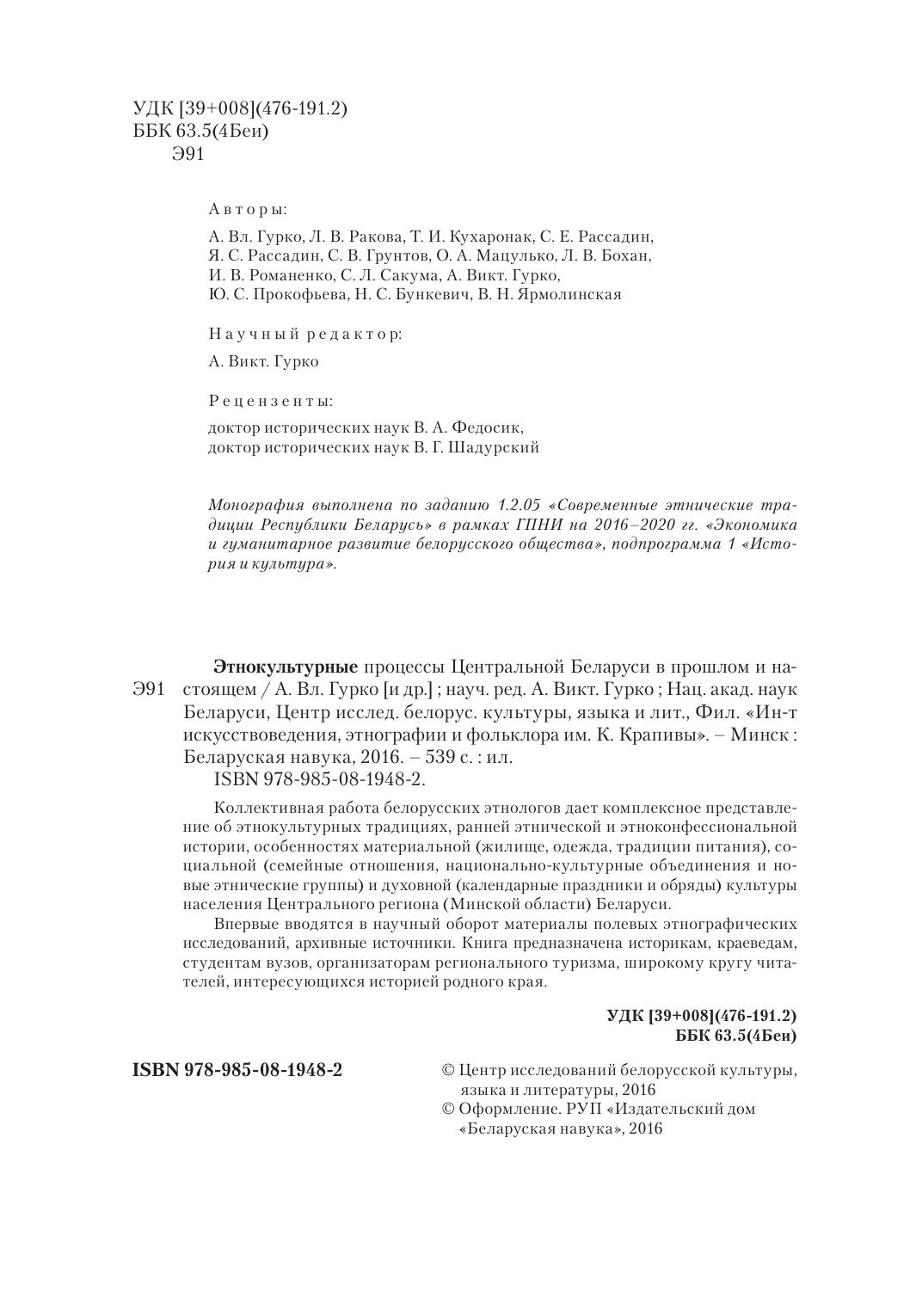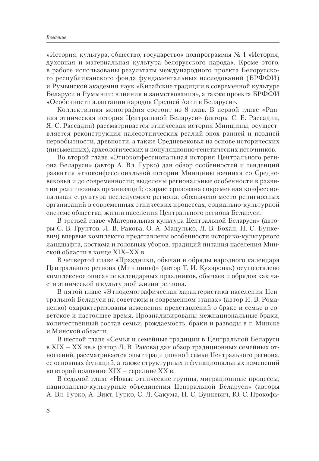 Коллективная работа белорусских этнологов дает комплексное представление об этнокультурных традициях, ранней этнической и этноконфессиональной истории, особенностях материальной (жилище, одежда, традиции питания), социальной (семейные отношения, национально-культурные объединения и новые этнические группы) и духовной (календарные праздники и обряды) культуры населения Центрального региона (Минской области) Беларуси. Впервые вводятся в научный оборот материалы полевых этнографических исследований, архивные источники. Книга предназначена историкам, краеведам, студентам вузов, организаторам регионального туризма, широкому кругу читателей, интересующихся историей родного края.
